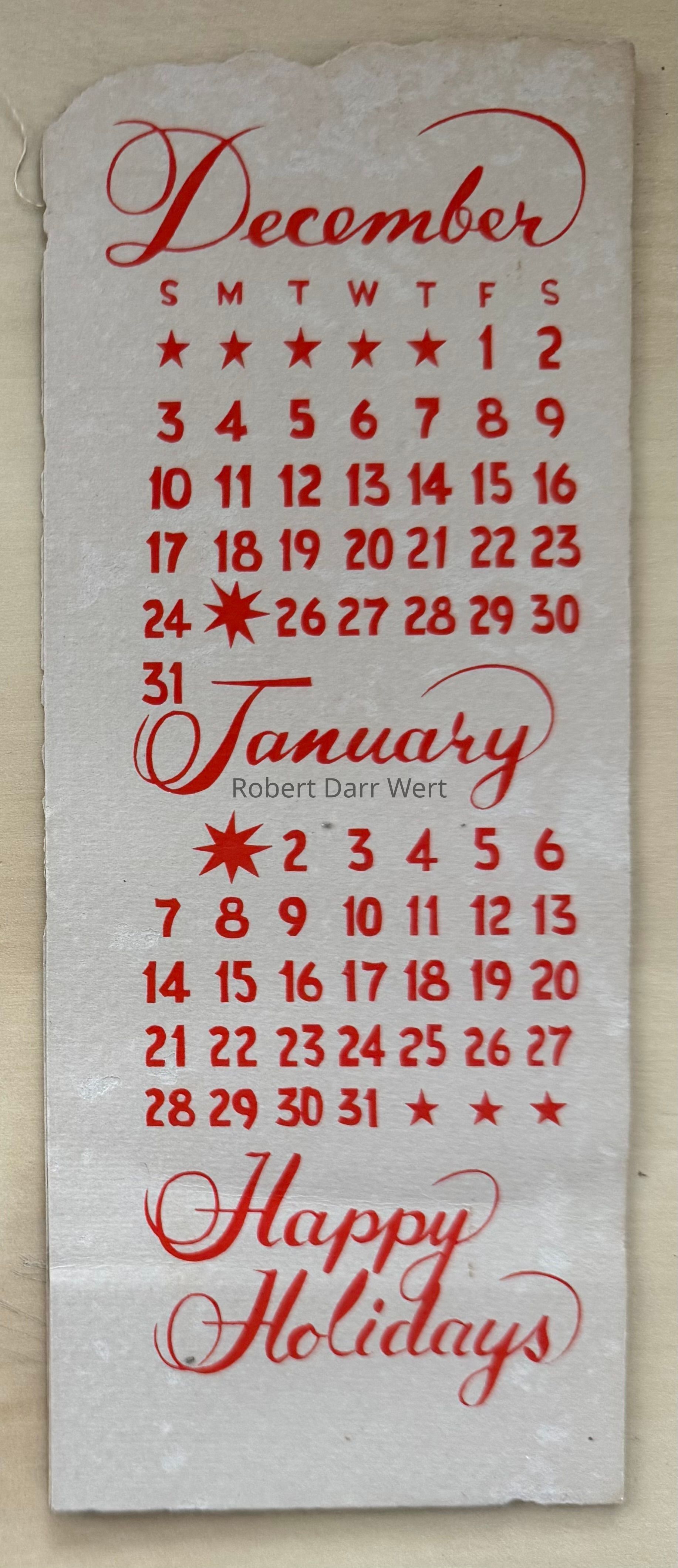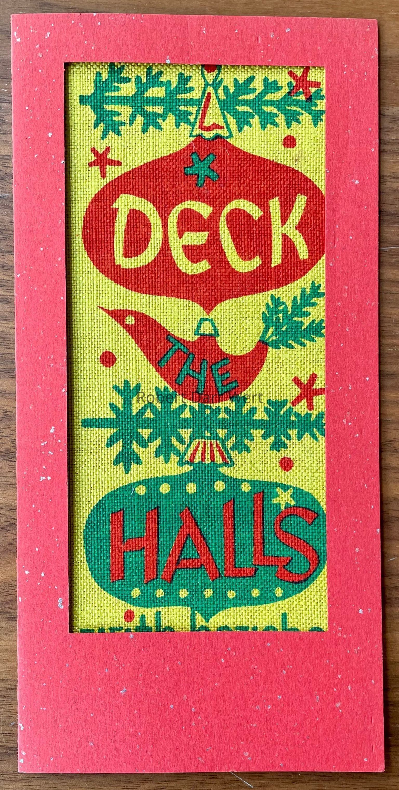 The linen print is backed with a silkscreen printed calendar for December 1961 and January 1962. This assemblage was likely meant to be glued inside a die cut greeting card such as the one pictured below.