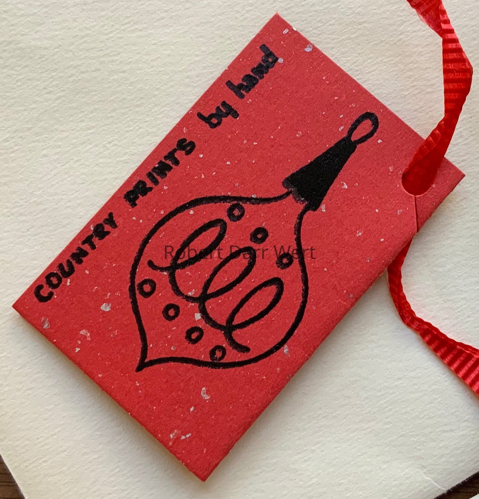 This notecard is a small wallhanging called a Greeting Hanger. Meant to be sent as a holiday greeting, the linen print is glued to a black cardboard strip with a ribbon for hanging, and a small red silkscreened gift tag attached.