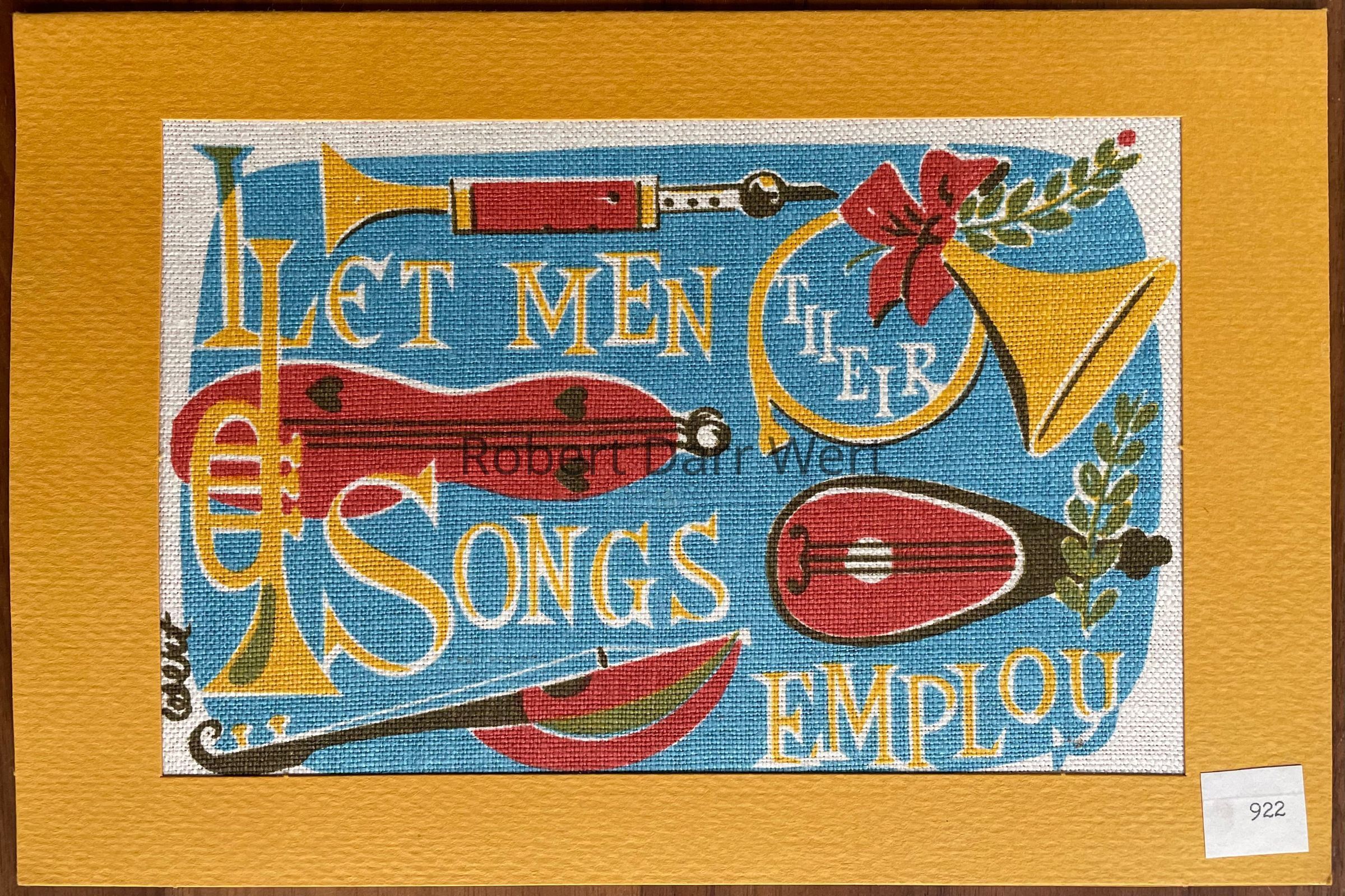 A four-screen/five-color silkscreen print on off-white linen glued within a dye cut Strathmore notecard in yellow. The image depicts early stringed and woodwind instruments amongst a line from the traditional Christmas carol, “Joy to the World”, “LET MEN THEIR SONGS EMPLOY”.
