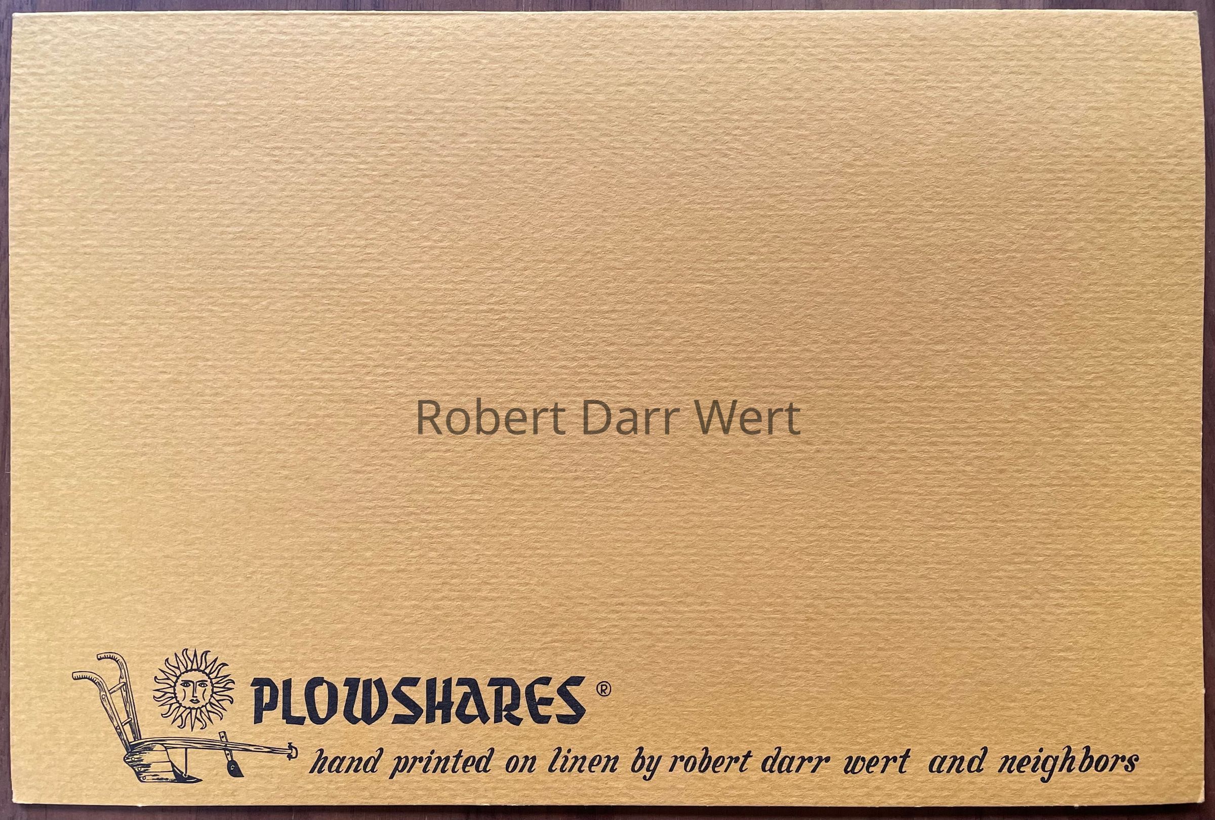 “PLOWSHARES hand printed on linen by robert darr wert and neighbors”, on notecard back.Dimensions