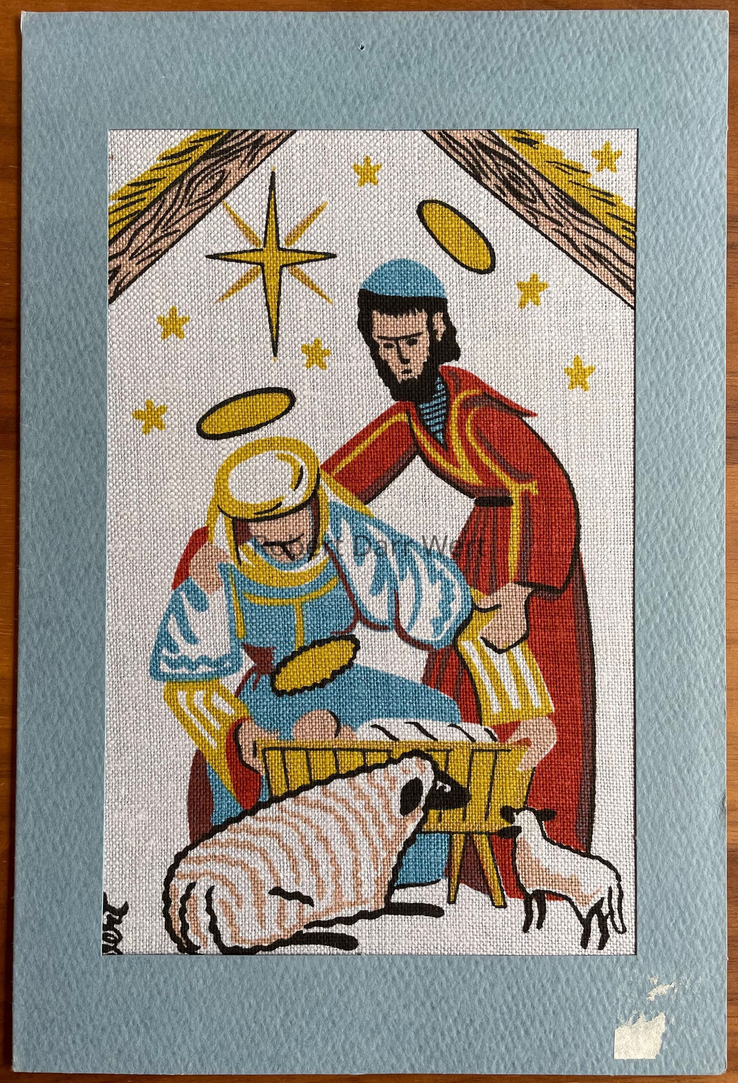 A five-screen/six-color silkscreen print on off-white linen glued within a dye cut Strathmore notecard. The image depicts Mary and Joseph standing above Jesus in the manger on Christmas night. Sheep stand before the manger, and the Christmas star shines above.