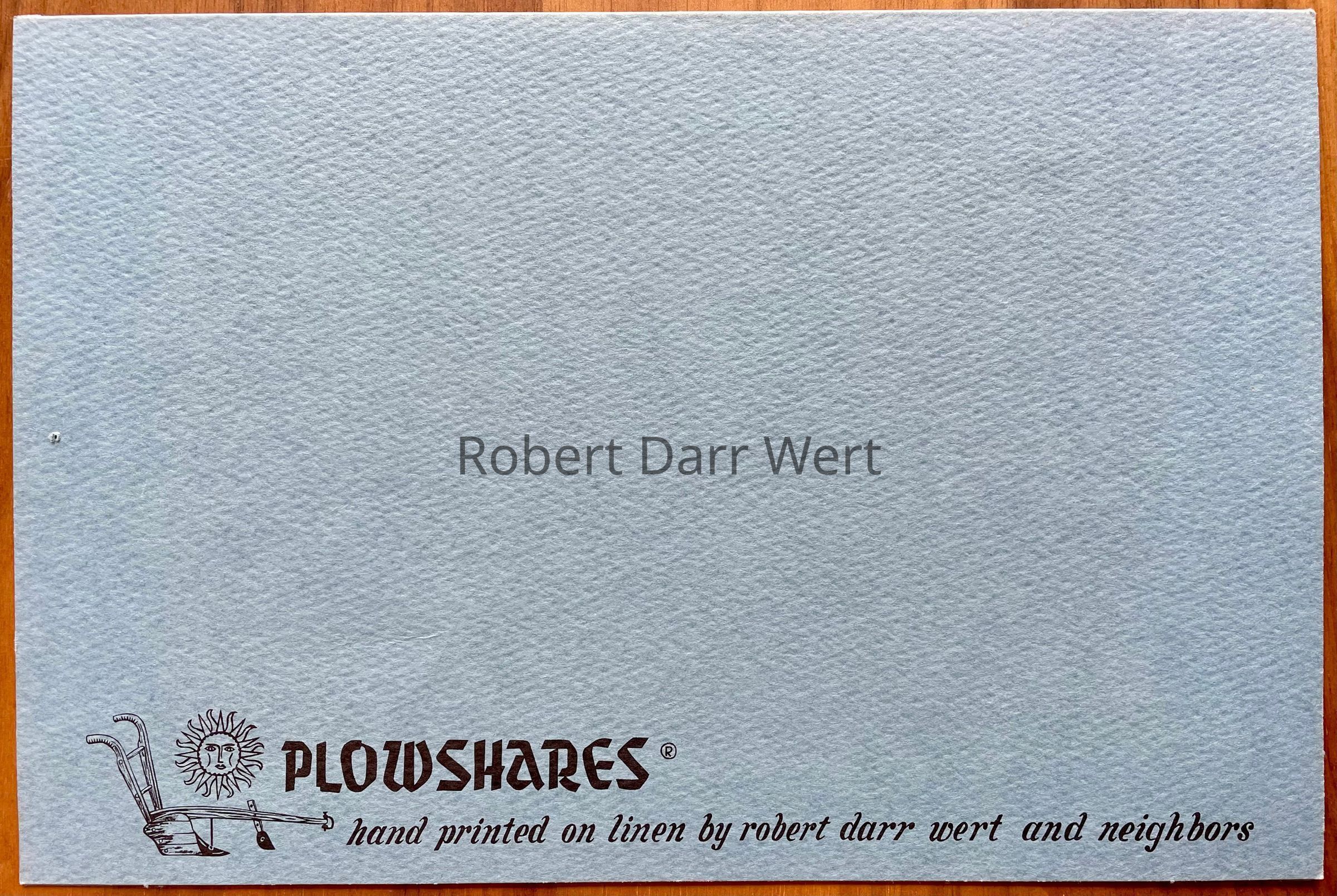 “PLOWSHARES hand printed on linen by robert darr wert and neighbors”, back face of notecard.Dimensions