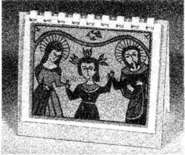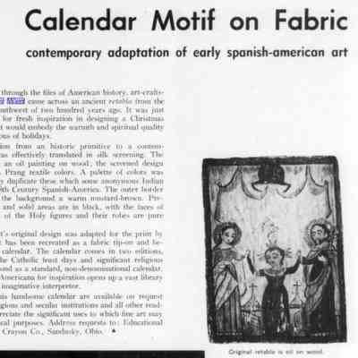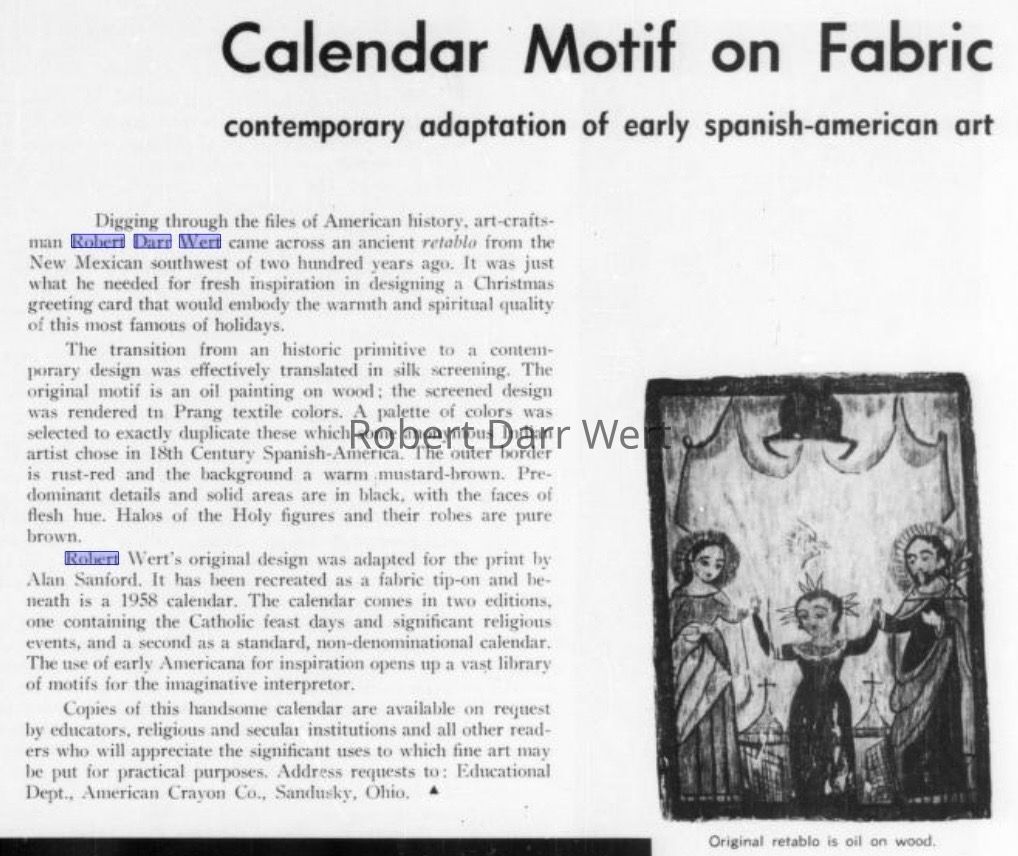 This c.1965 composition is based on a print Wert produced for a 1958 desk calendar for the American Crayon Company of Sandusky, Ohio. The image is inspired by a 200 year old retable from New Mexico; see images.