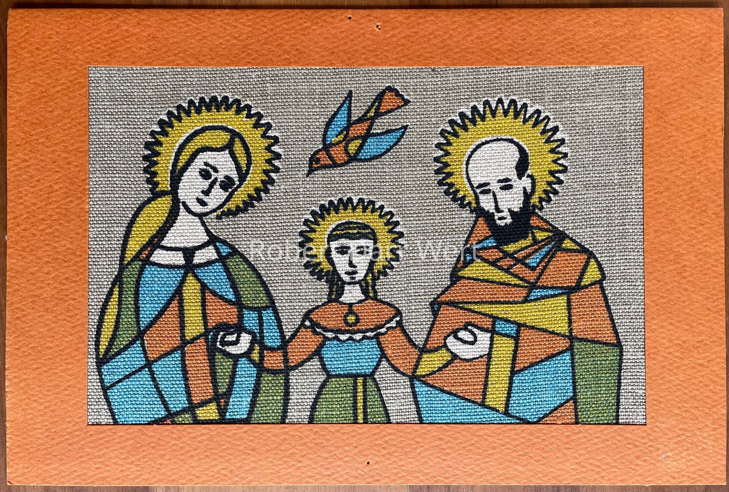 A five-screen/six-color silkscreen print on off-white linen glued within a dye cut Strathmore notecard in orange. The image depicts Mary, Jesus, and Joseph holding hands while a bird of peace flies above.