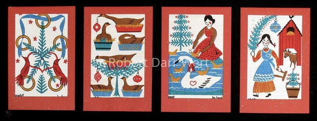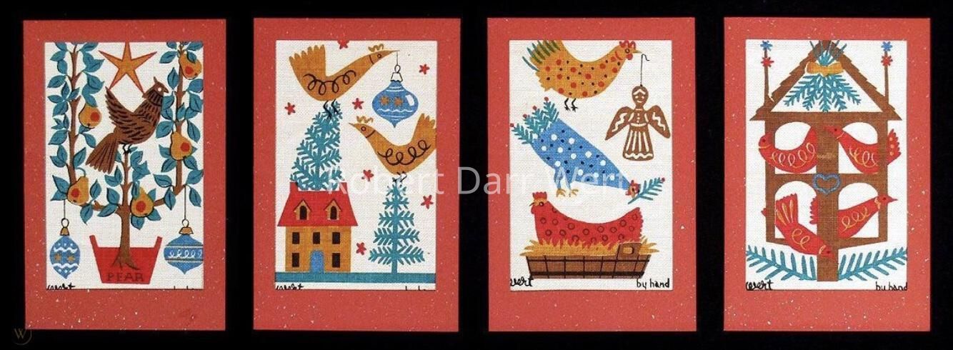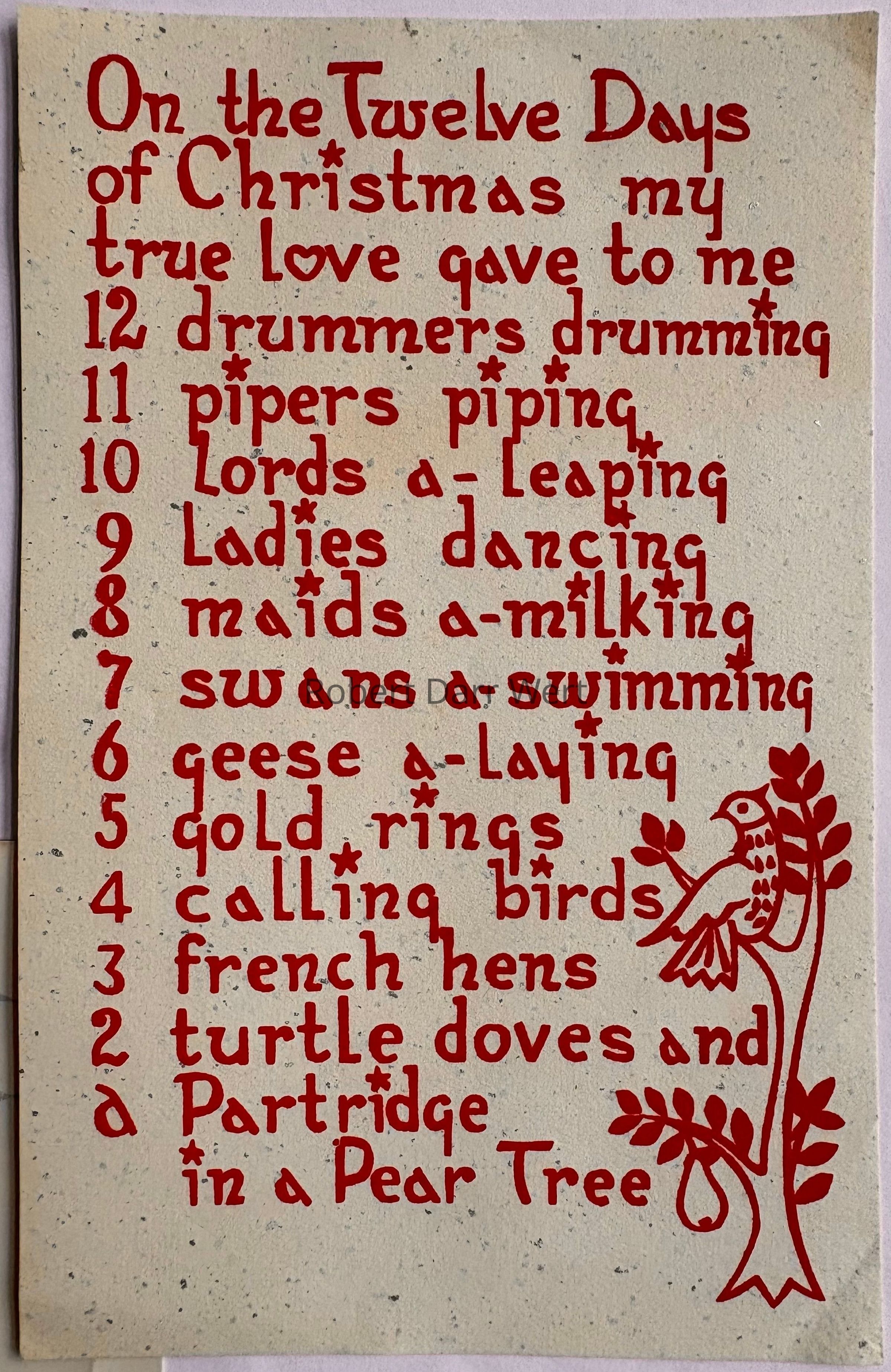 A series of twelve dye cut notecards bearing six-color silkscreen prints on off-white linen illustrating scenes from the traditional Christmas song, “The Twelve Days of Christmas”. Inside each card is a list of the complete twelve days.