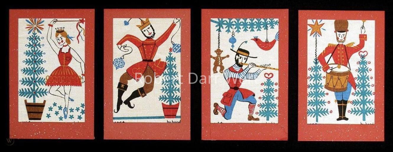 One card from this set (Maids-a-Milking) appears in a Nov-Dec 1958 article in Design magazine entitled “Design Your Own Christmas Cards”. The set is also listed on the Christmas 1960 Country Prints price list.Made/Created