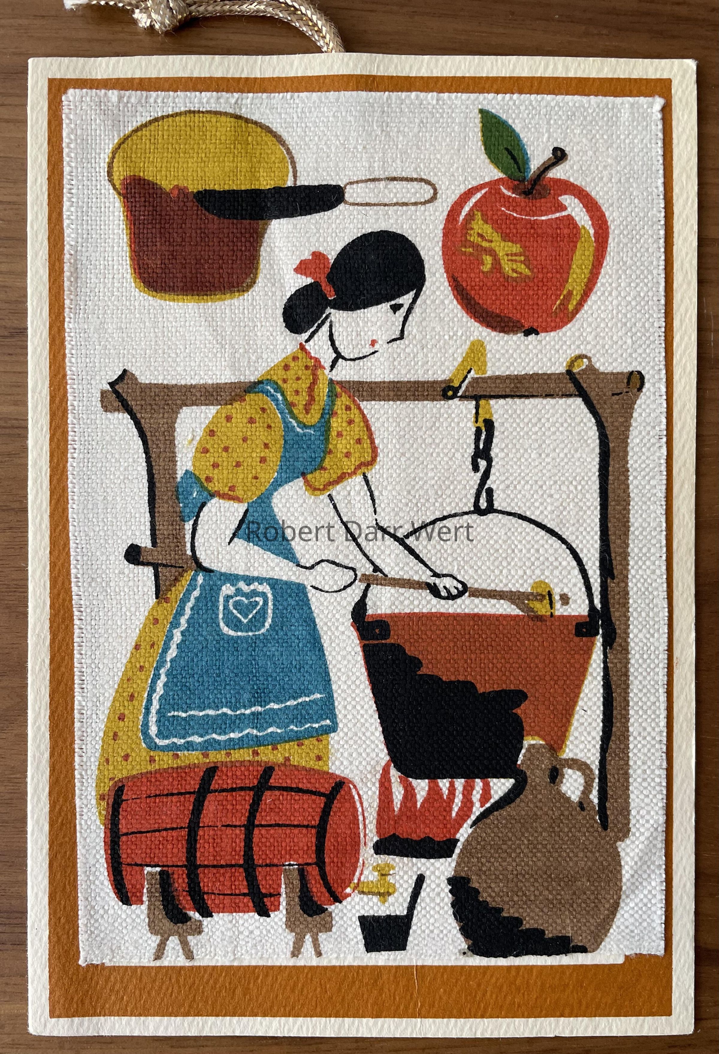 A notecard with a five-screen/nine color silkscreen print on off-white linen affixed to a folded cardstock notecard. The composition depicts a woman in a long dress and apron making apple butter. She stirs the contents of a large copper pot suspended above a fire. Above is an apple and a slice of bread being spread with apple butter. At her feet is a keg of drinking cider and a handled cup next to a corked jug for fermenting cider into hard alcohol or vinegar.
