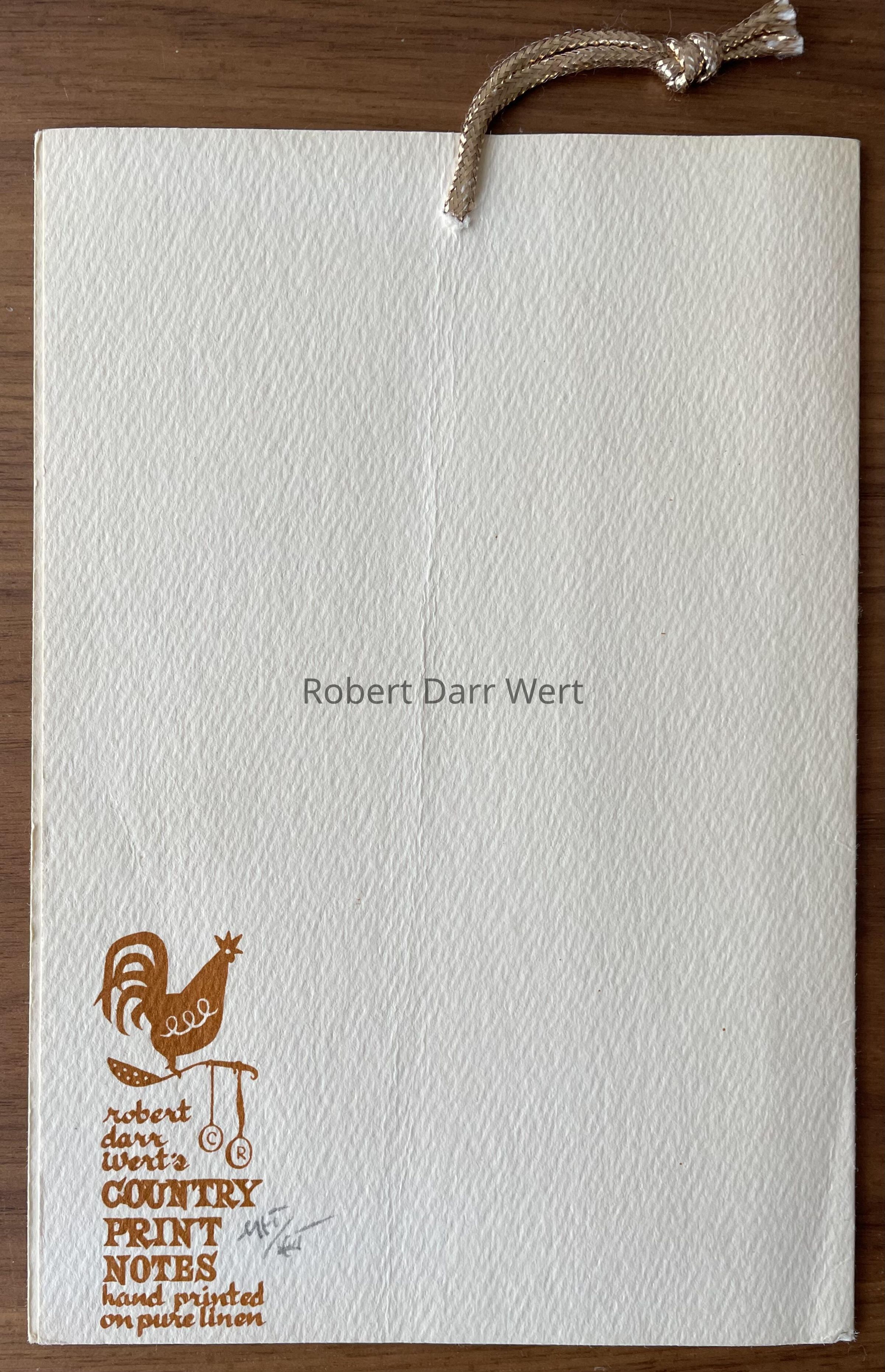 The textile is framed by a dark ochre border printed on the notecard. On the back of the notecard is Wert’s logo topped with a rooster on a skimming spoon and the type, “robert darr wert’s COUNTRY PRINT NOTES hand printed on pure linen”. Two smaller spoons dangle from the handle of the skimming spoon. Within the bowls of the spoons are a “C” and and “R”, for “copyright and “registered trademark”.
