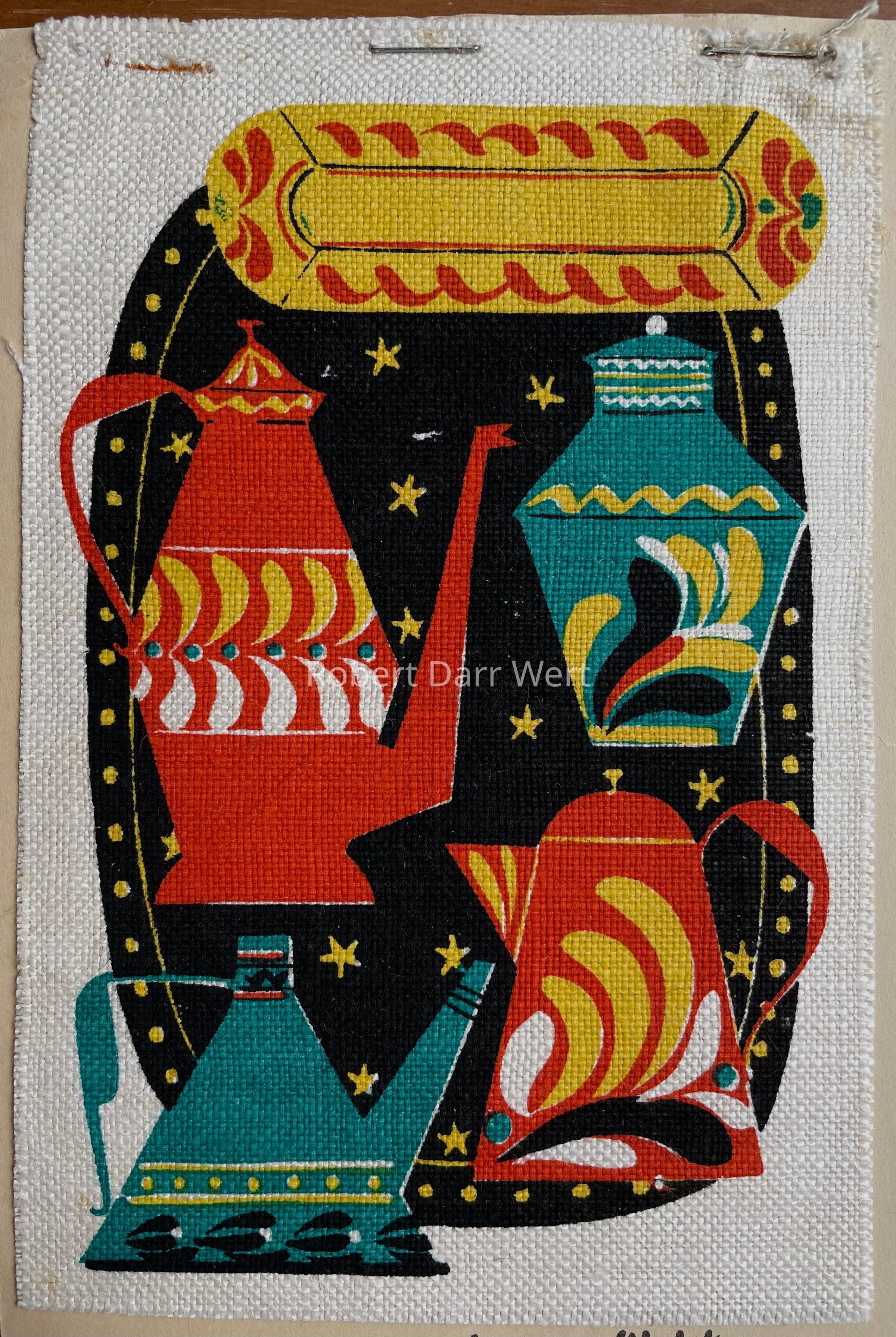 A four-color silkscreen print on white linen depicting six examples of painted tin, or toleware.