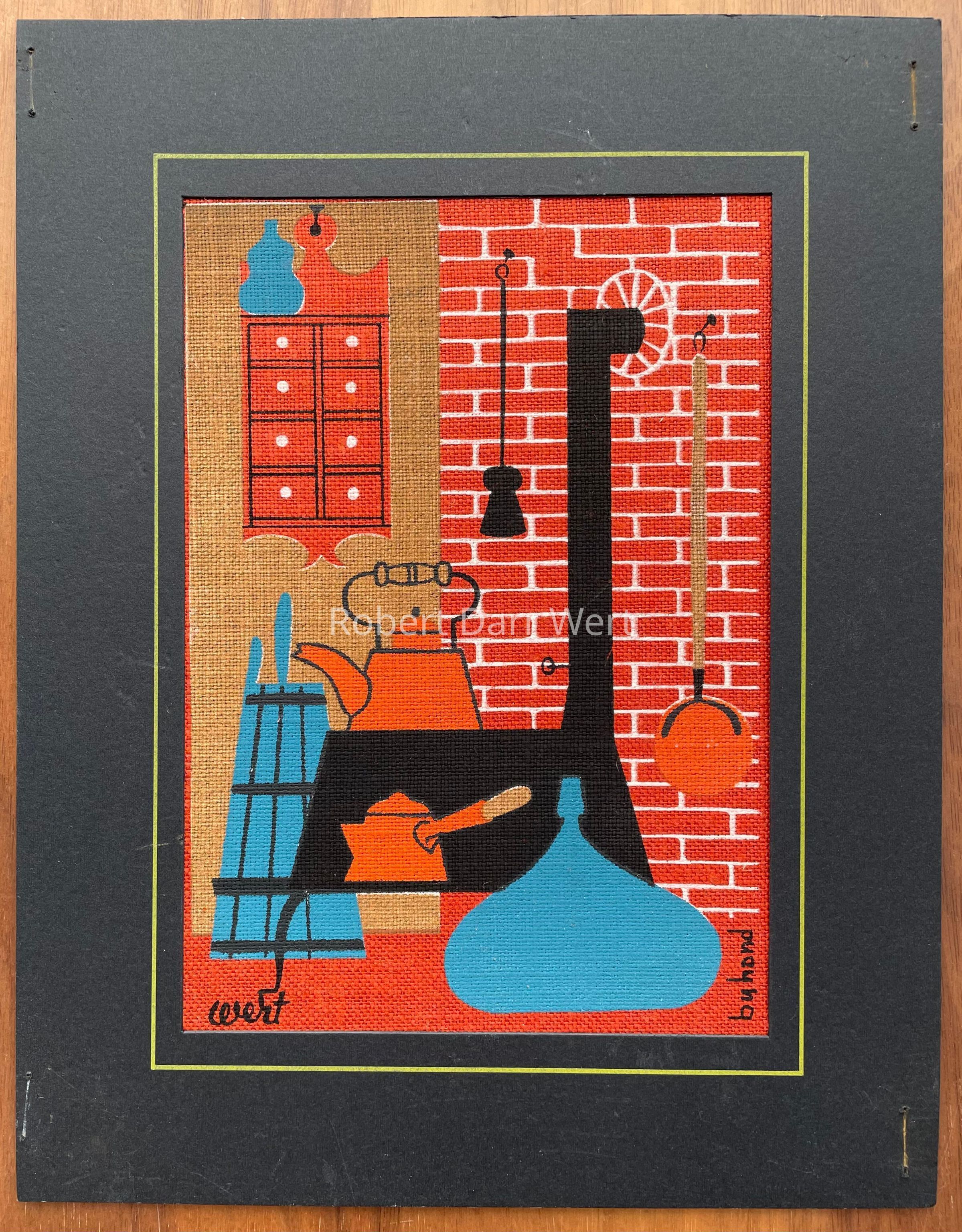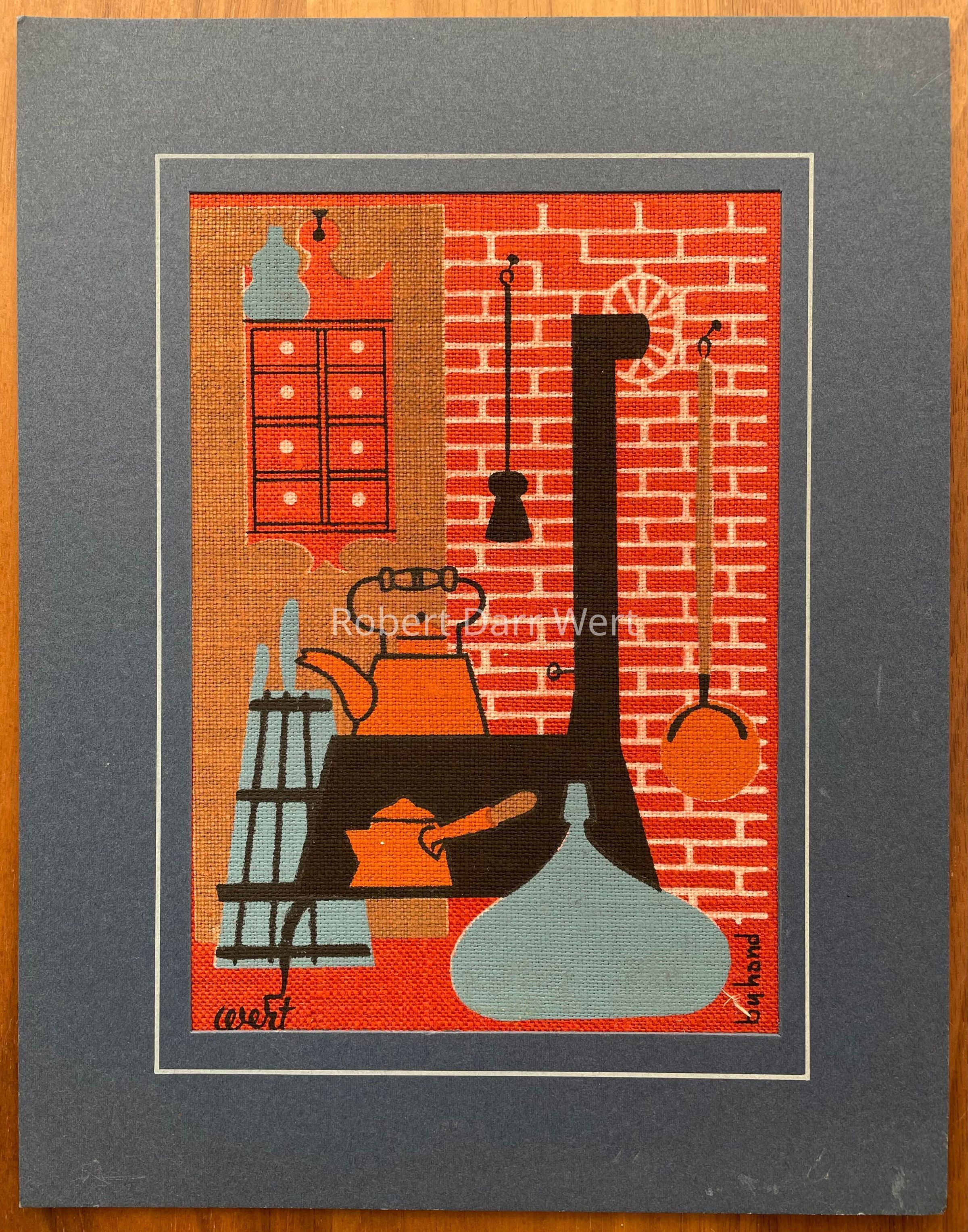 A Matted Greeting with a four-color silkscreen print on brick red linen depicting items from an early American kitchen. Examples of cast iron, copperware, woodenware and glass are illustrated. The print is framed with a cardstock mat and backed with single-ply cardboard.