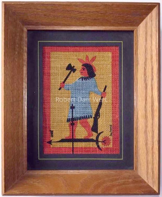 A Matted Greeting with a four-color silkscreen print on heavy off-white linen depicting a weathervane in the form of a Native American holding a tomahawk and a rifle. The print is in a black cardstock mat.