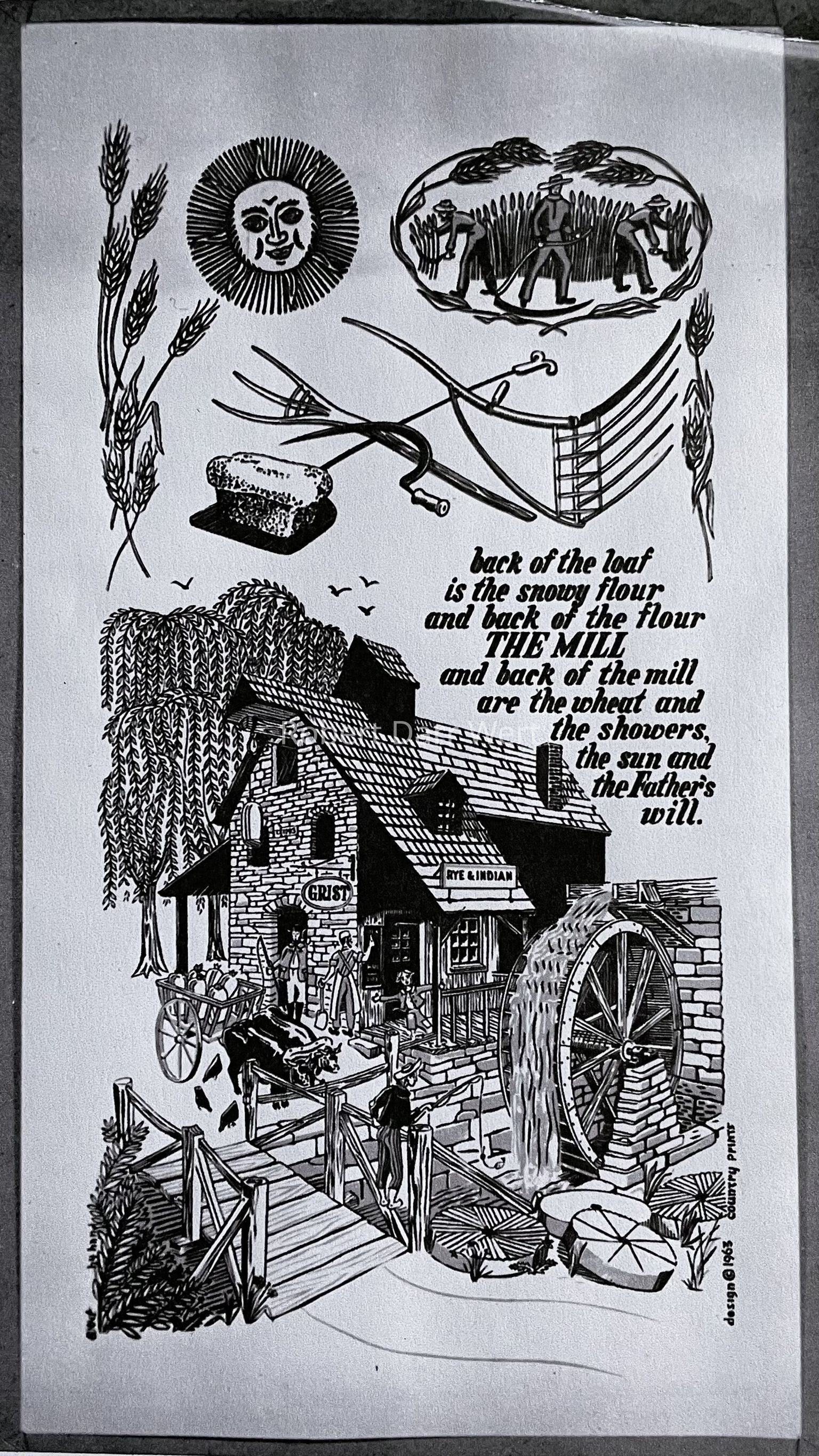 A black and white photo of original artwork for the Mill (TK) towel/wallhanging.Made/Created