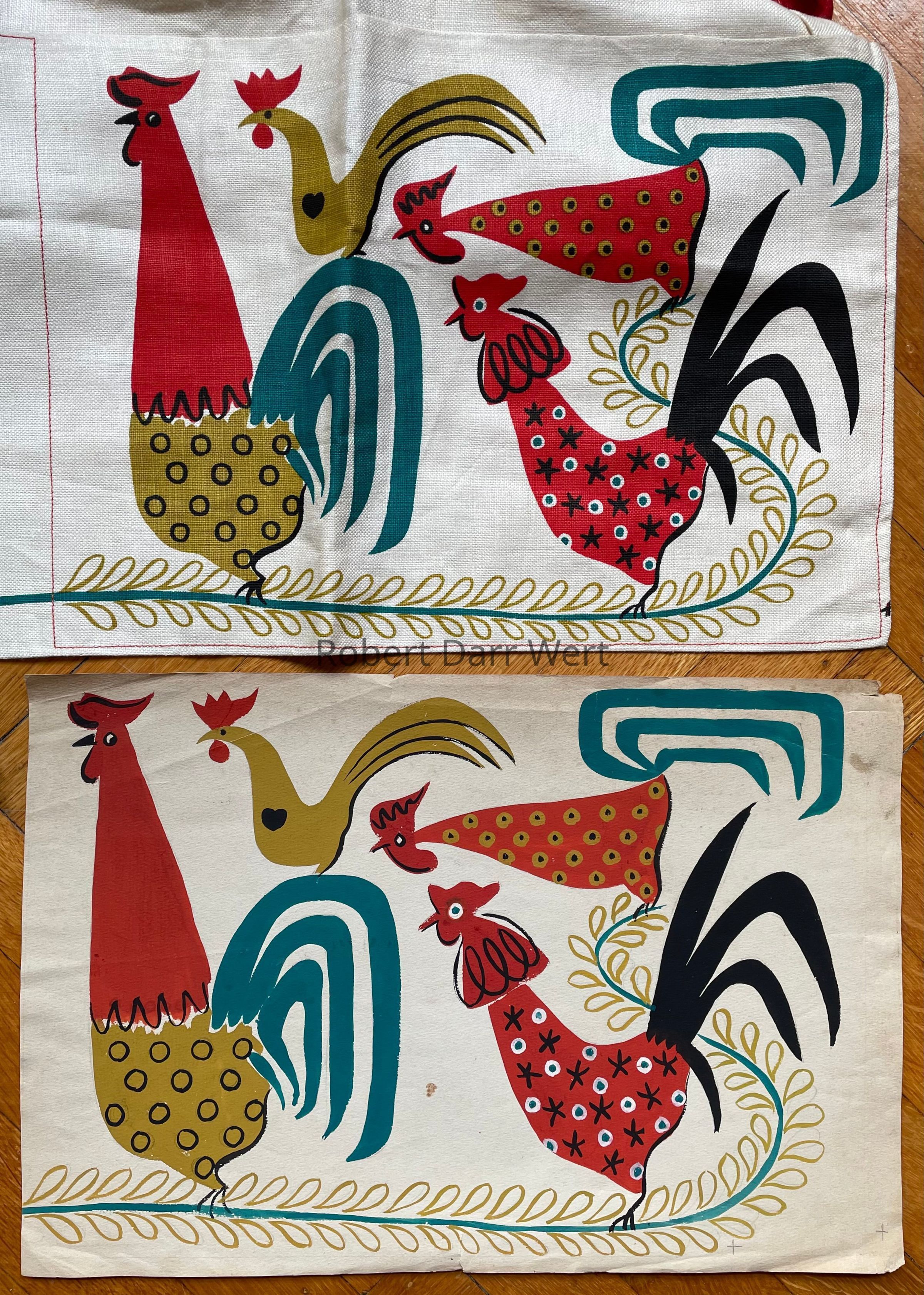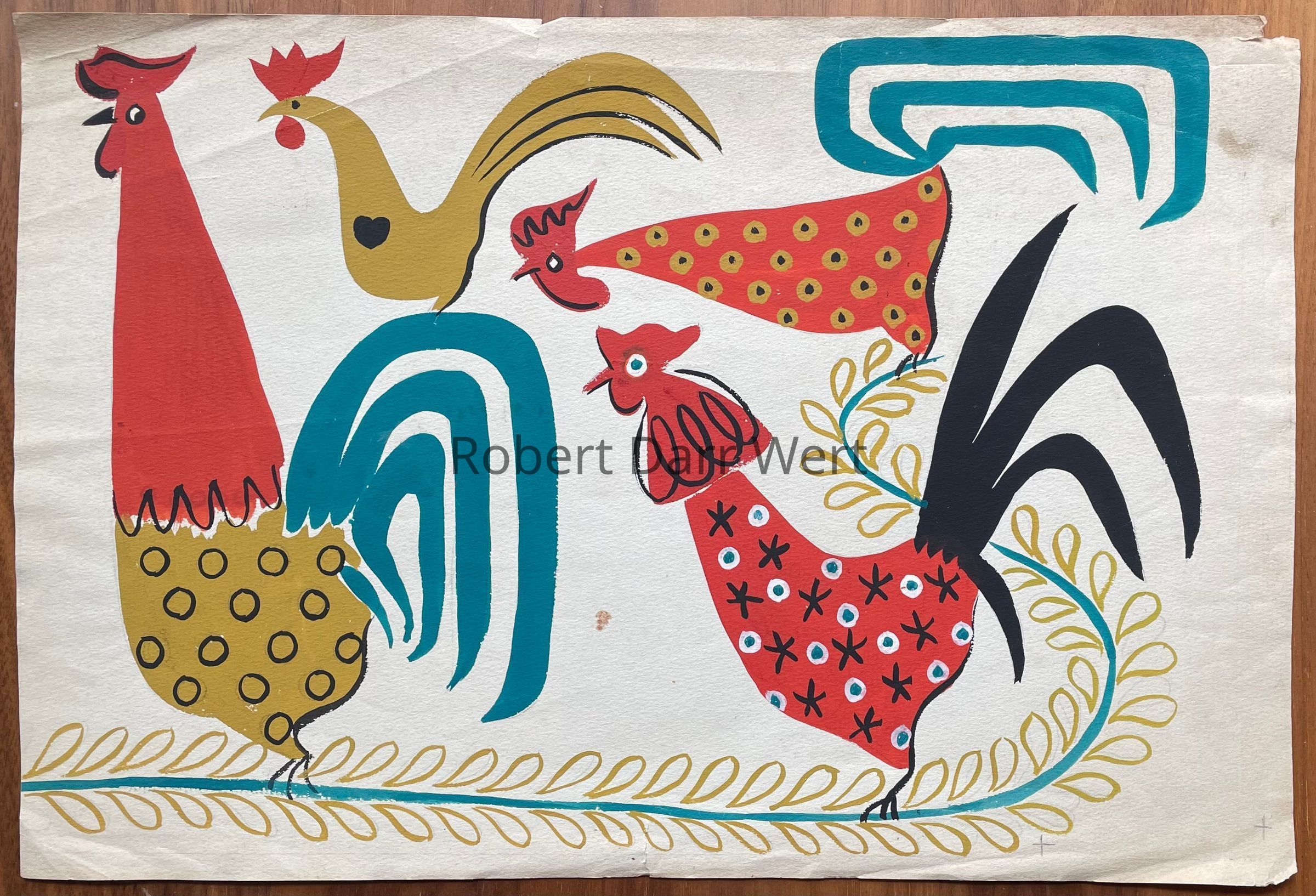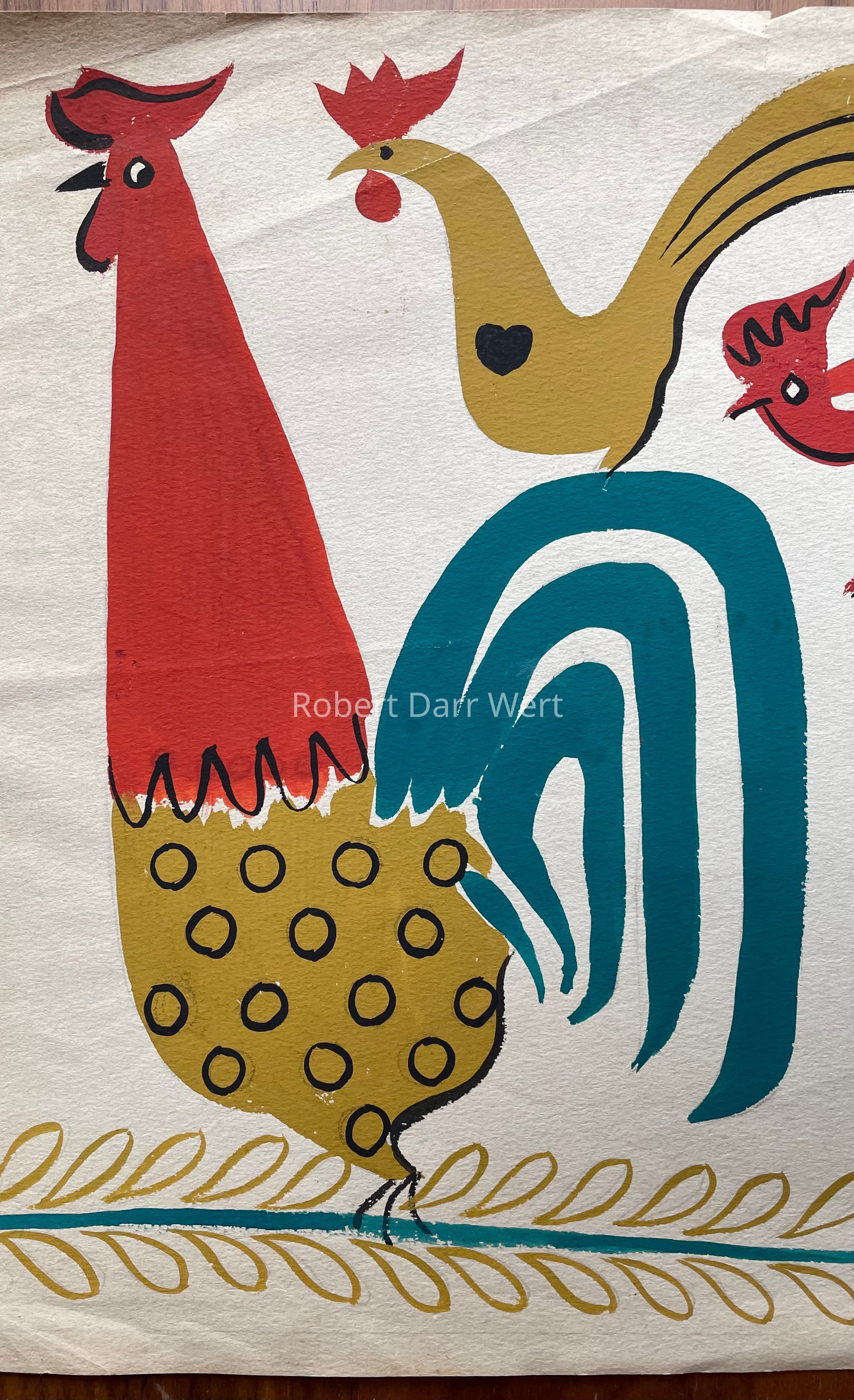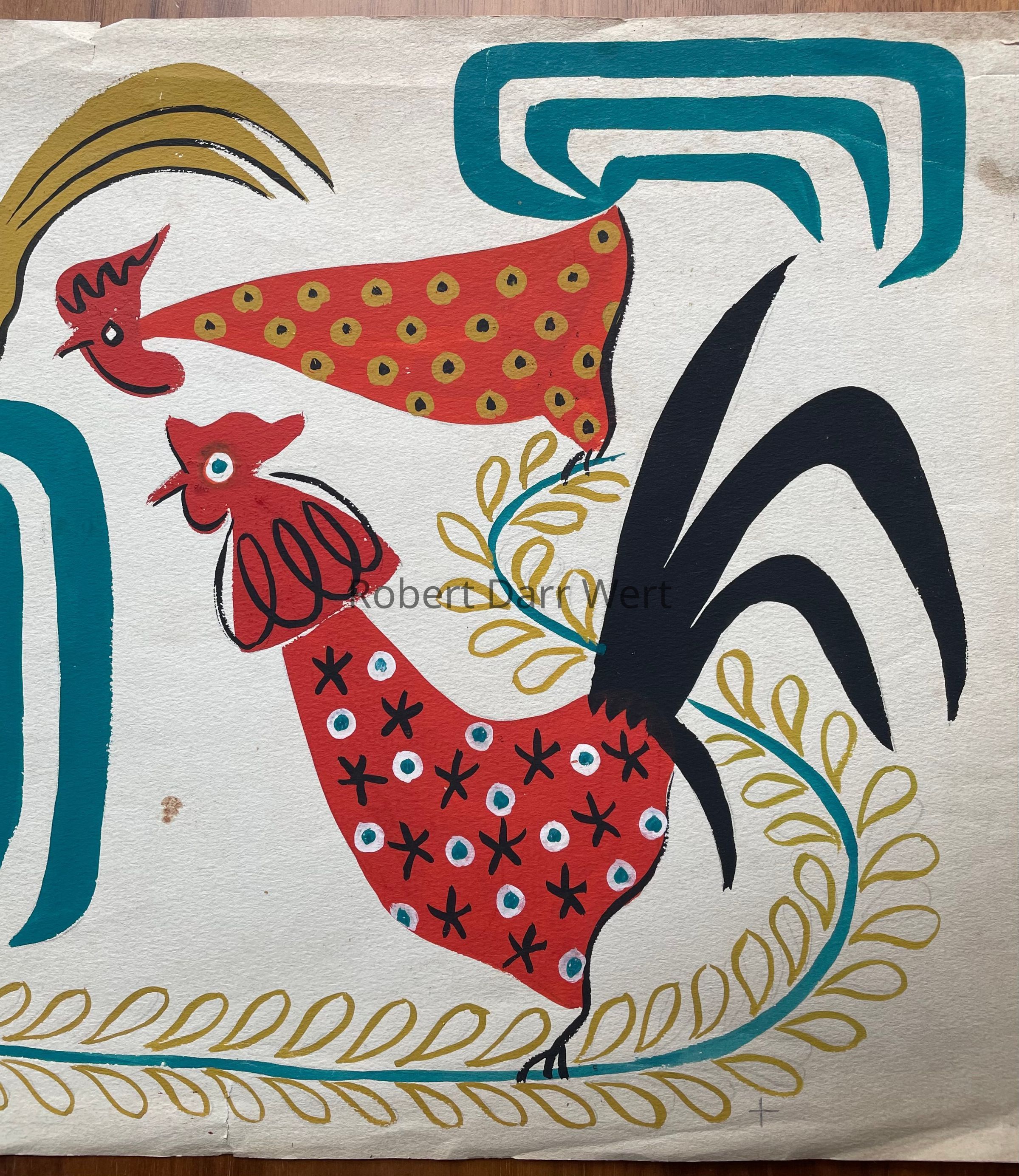 A four color gouache painting on textured off-white paper depicting four roosters superimposed with Wert’s interpretation of calico print patterns. Three roosters stand upon a trailing vine, the smallest stand on the largest rooster’s tail feathers. Hand drawn pencil guidelines and registration marks are evident.