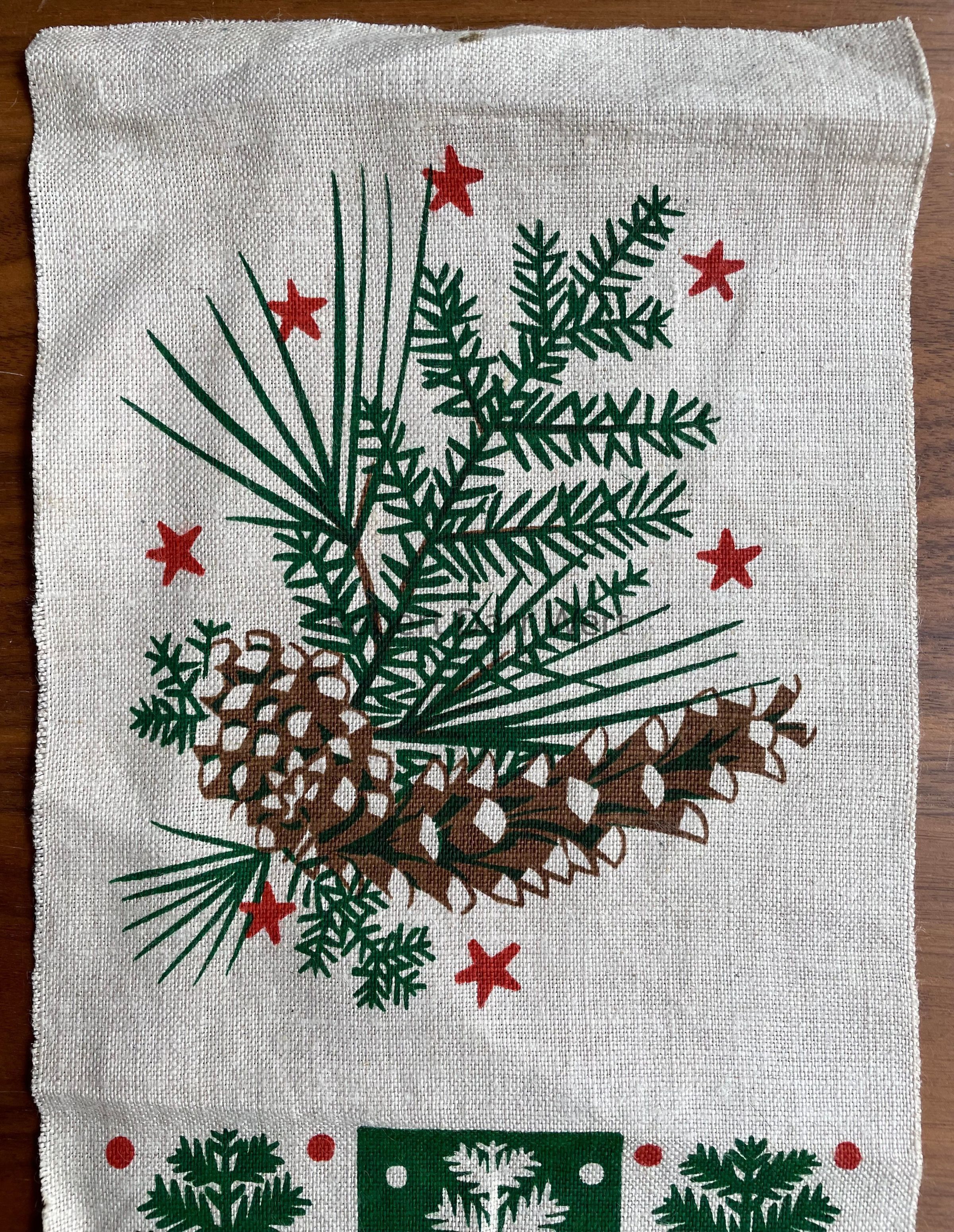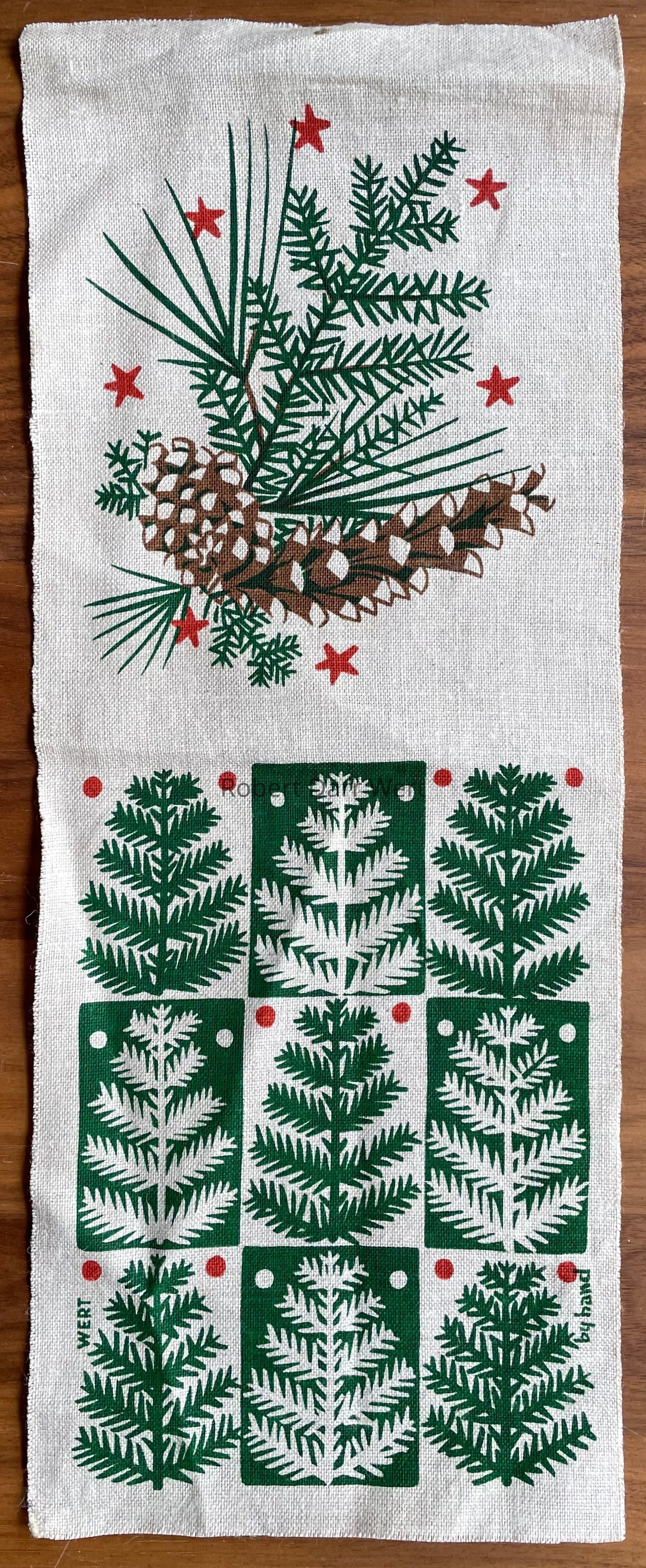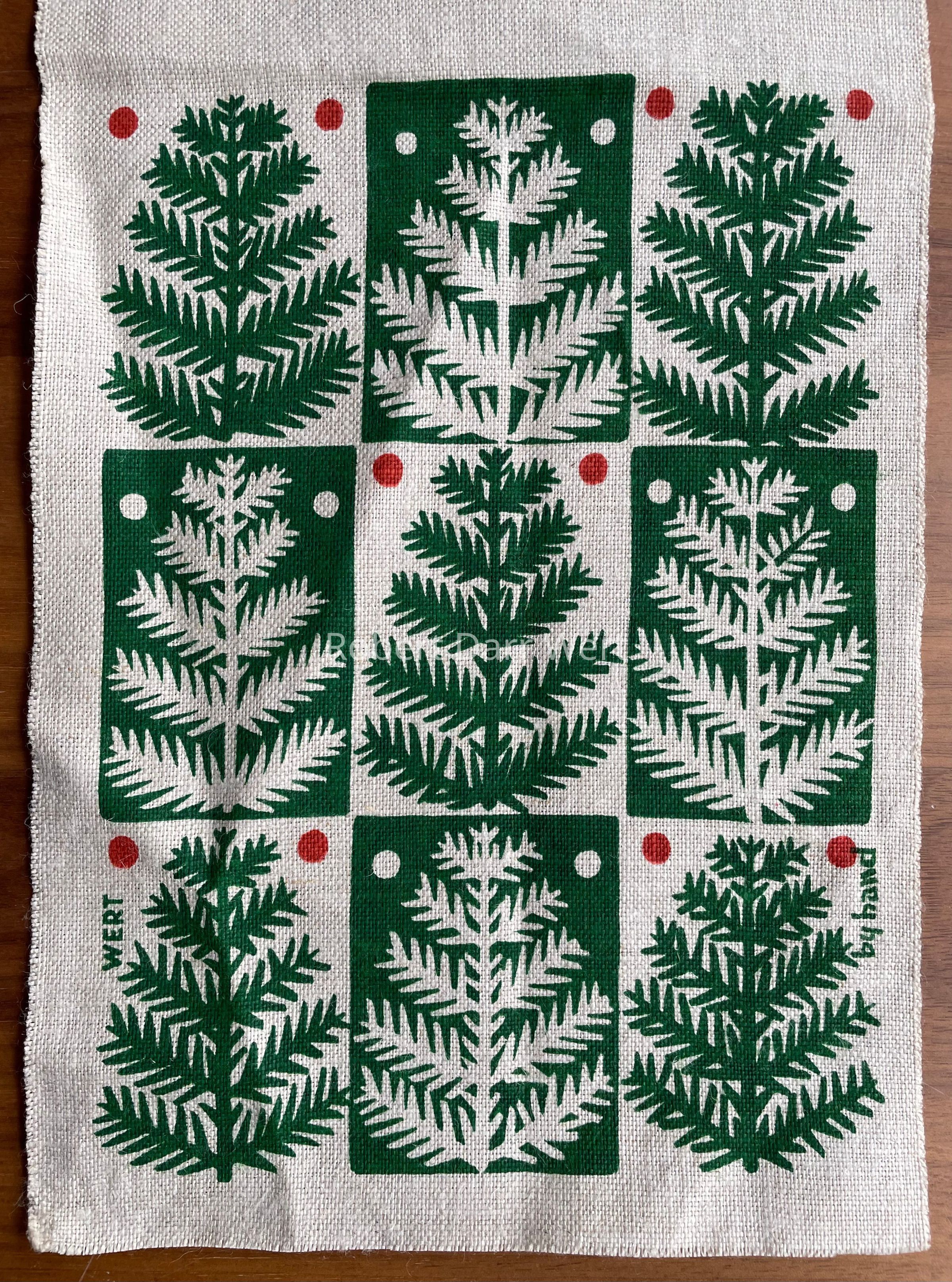 A strike-off for a pillow with a three-screen/four-color silkscreen print on off-white linen depicting evergreen branches with pinecones on one pillow side, and stylized evergreen trees in a grid of nine on the other. The fabric is meant to be folded in half and stitched on three sides to form the pillow, with a rough finished size of 6” x 8 1/2”.