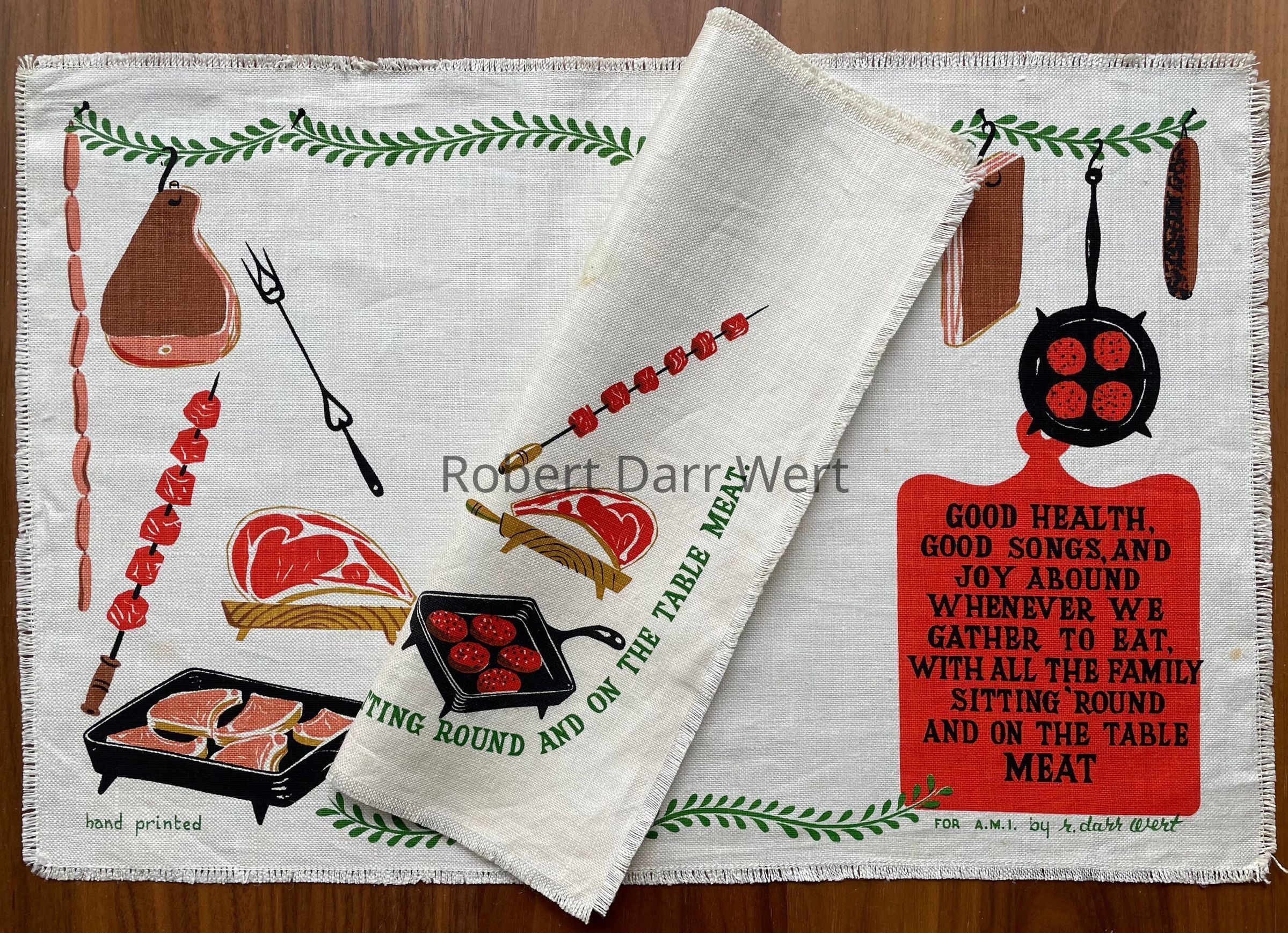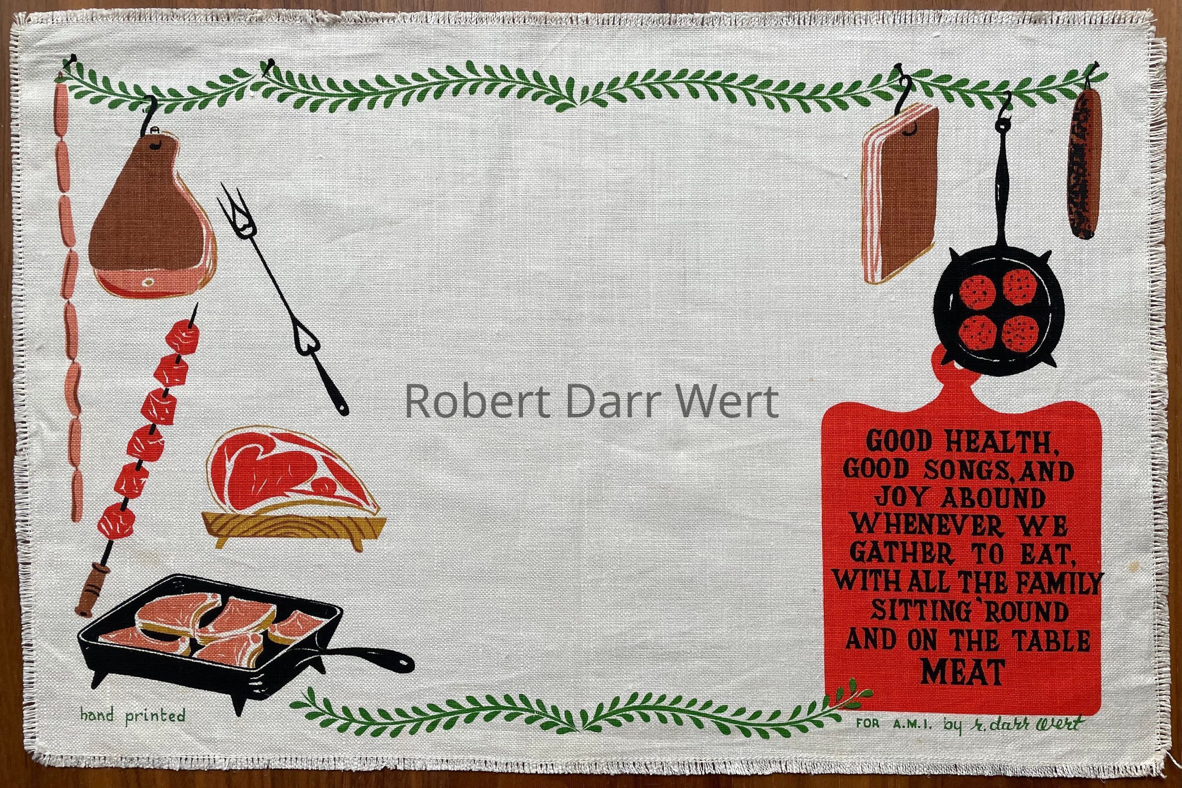 A five-color silkscreen print on off-white linen depicting cuts of meat, footed frying pans, and a cutting board bearing the unattributed text, “Good health, good songs, and joy abound whenever we gather to eat, with all the family sitting ‘round and on the table MEAT”. The composition is finished and unified with trailing vines. A matching napkin was also produced; see images.