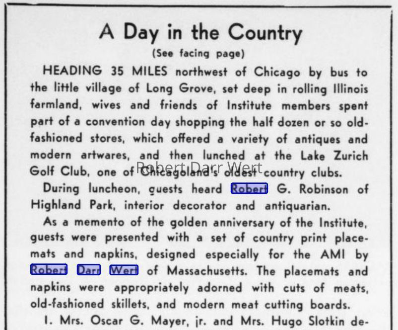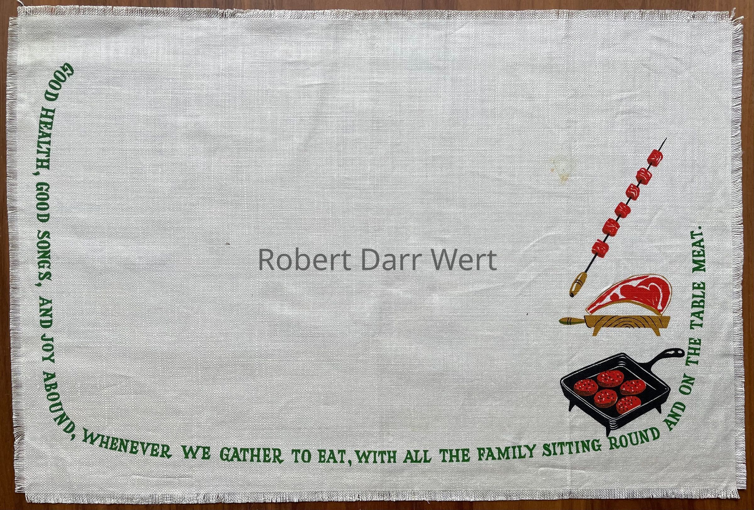 An October 13, 1956, article in the A.M.I. magazine, The National Provisioner, describes the placemat set and why it was produced, “As a memento of the golden anniversary of the Institute, guests were presented with a set of country print placemats and napkins, designed especially for the AMI by Robert Darr Wert of Massachusetts. The placemats and napkins were appropriately adorned with cuts of meats, old fashioned skillets, and modern meat cutting boards.”Made/Created