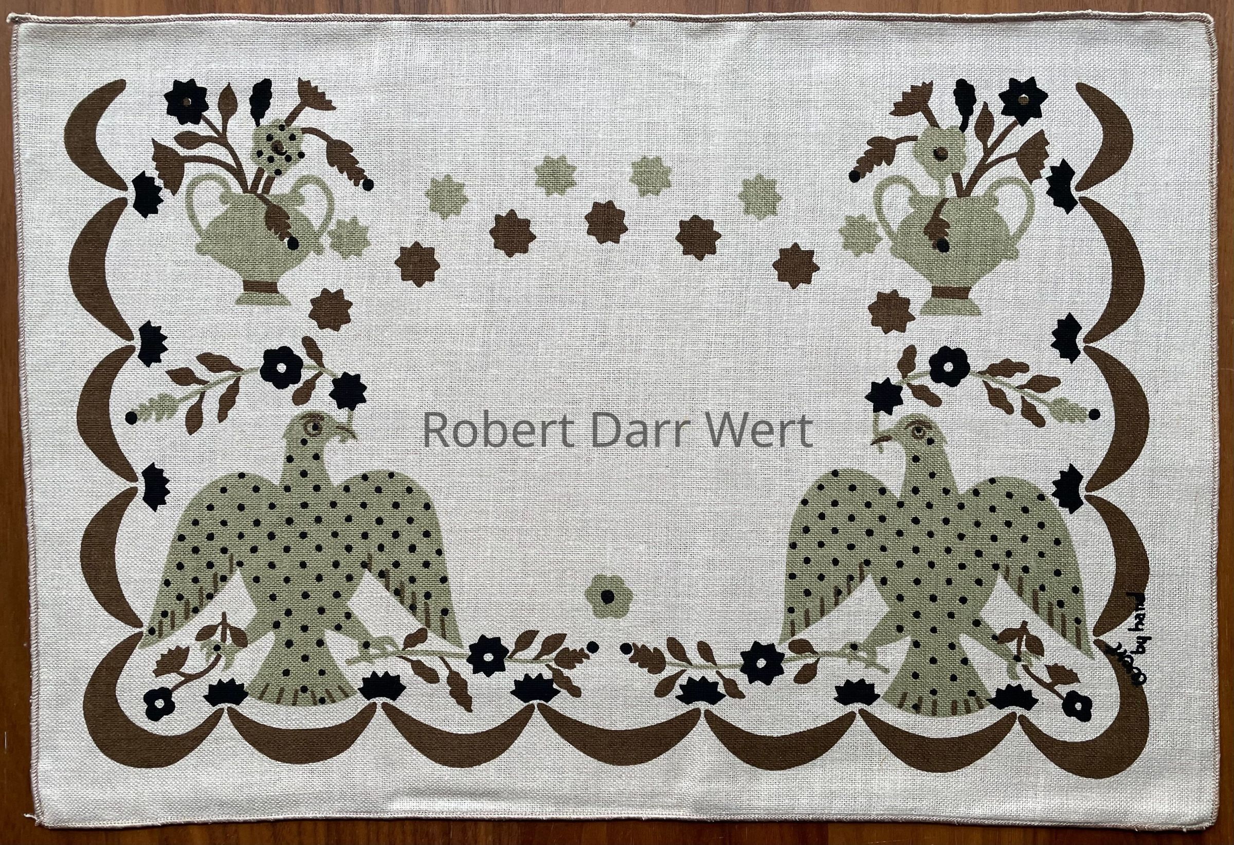 This design is listed on the January 1960 Country Prints price list in three colorways (brown, red, or blue), and appears in the c.1960 brochures “Mat Sets by Robert Darr Wert/Country Prints” with fringed edges, and “Country Prints by Robert Darr Wert and Neighbors”, c.1963, with serged and bound edges. See brochure images below.