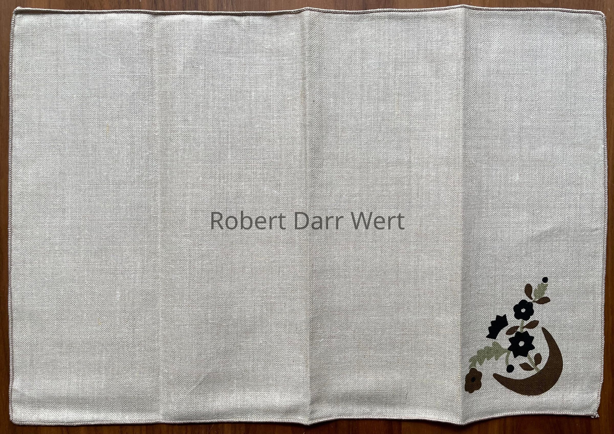 “wert by hand”, lower right corner of placemat. Napkin is unsigned.Material