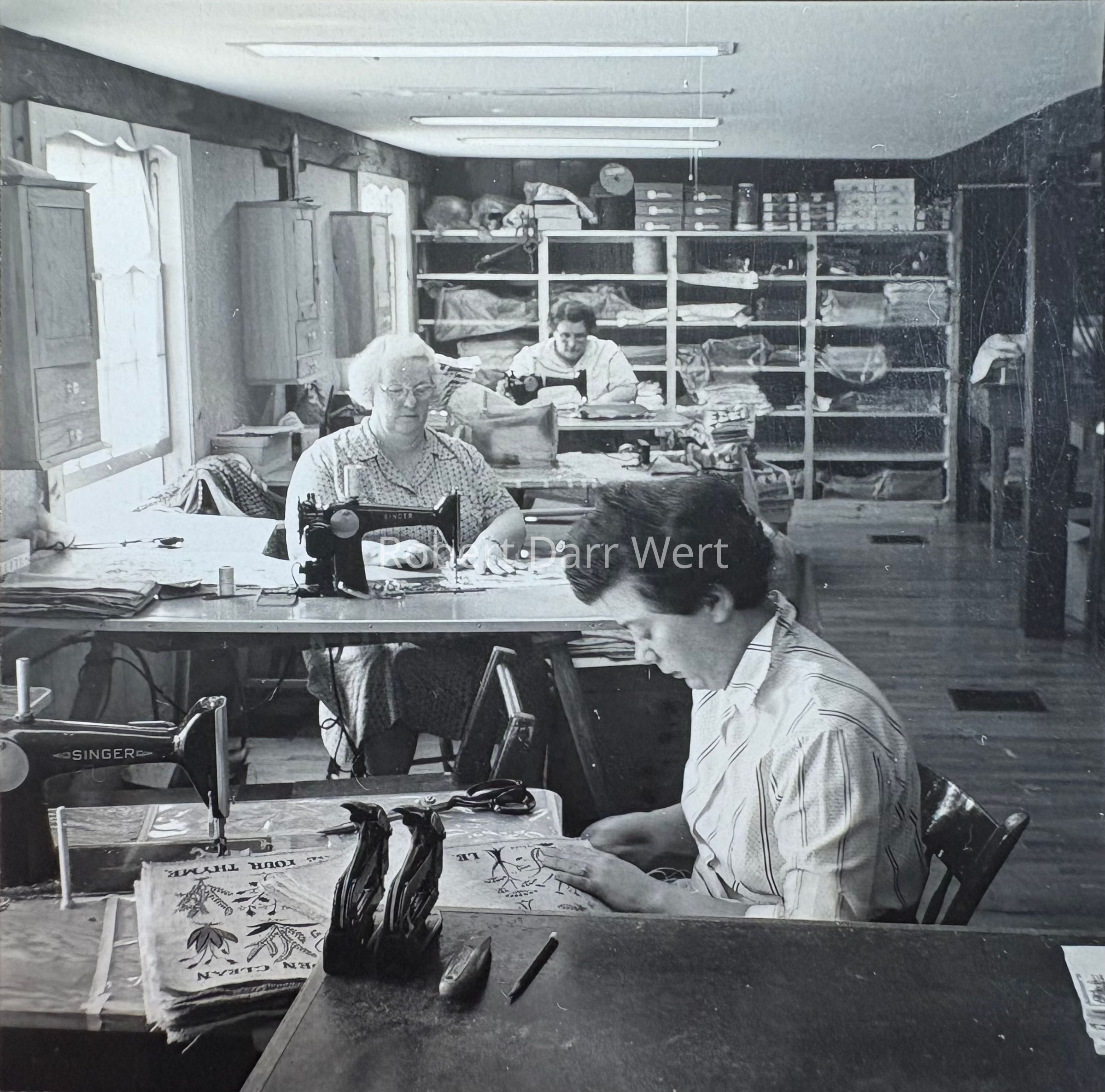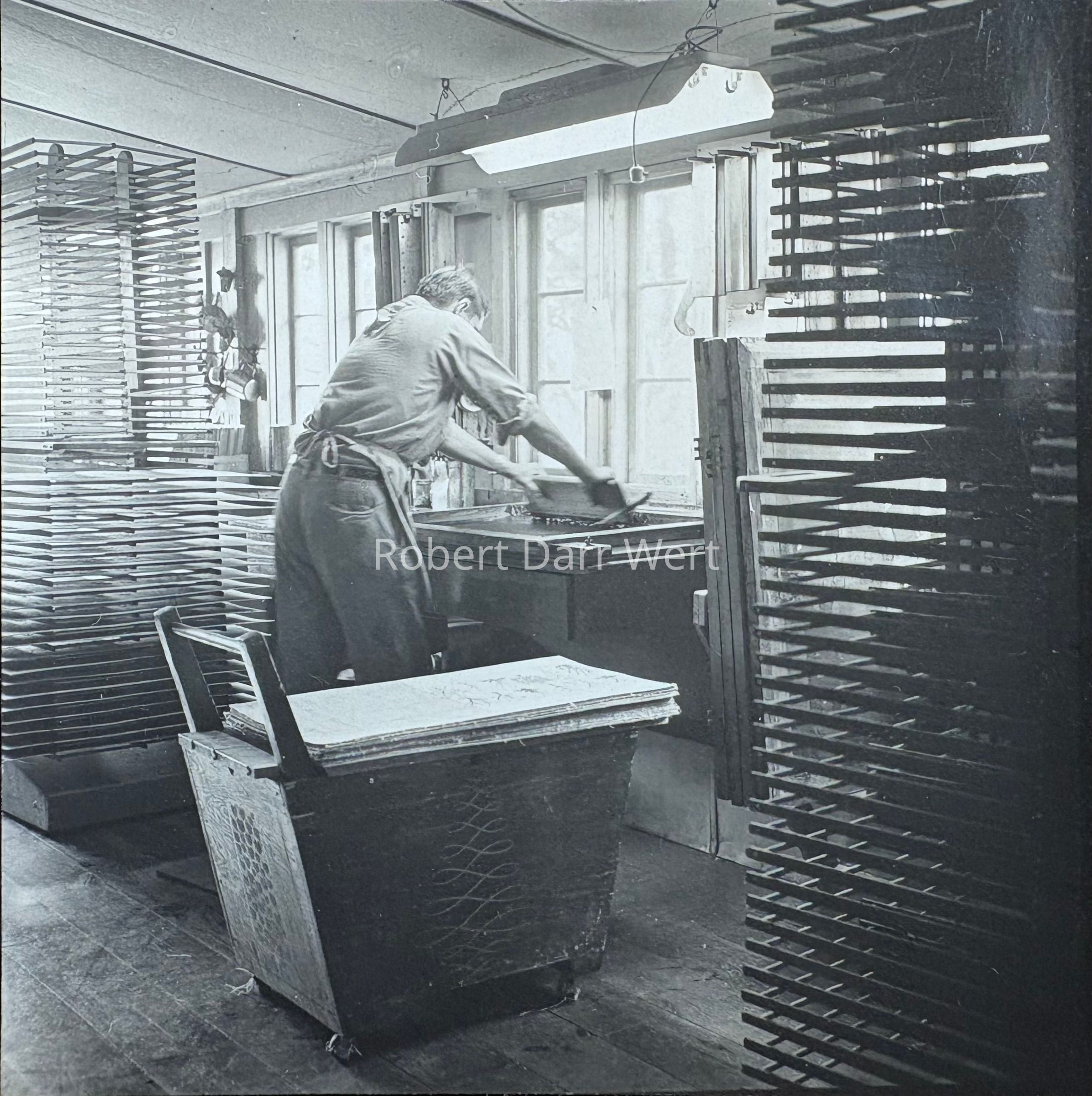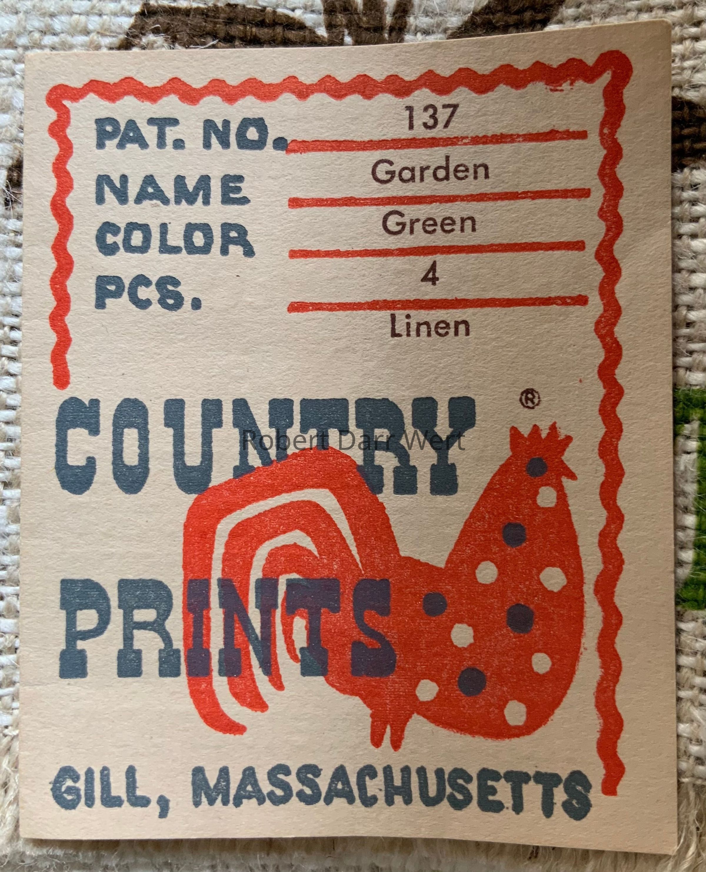 This oversized 15” x 22” placemat set is described in the 1958 Country Prints price list in three colorways, “137 Garden — Herb motifs in Brown/Black, Green/Brown or Pink/Turquoise” on heavy textured tan linen. This example is in the Green/Brown colorway. It is shown in two 1957 production photos, one of printer Edward Stafford printing the mats, and another of the mats being sewn and fringed in the sewing room.