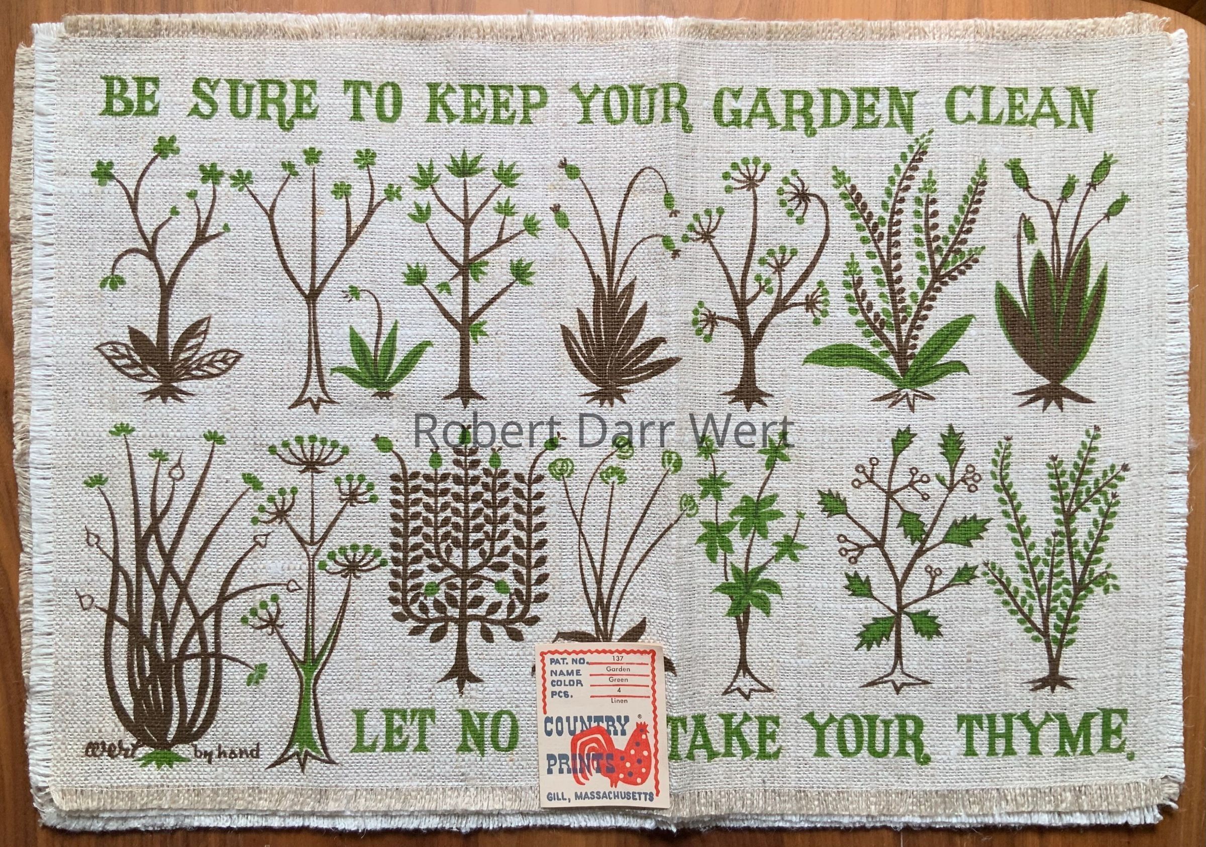 A two-color silkscreen print on heavy unbleached linen depicting conventionalized herb plants. The text is a partial lyric from a folk song with many titles that likens the cleanliness of a garden to a young woman’s romantic life. This oversized placemat is from a small line Country Prints produced called Barbecue Mats, which were meant for use on the picnic table. The somewhat rough linen fabric implies a more rugged use.
