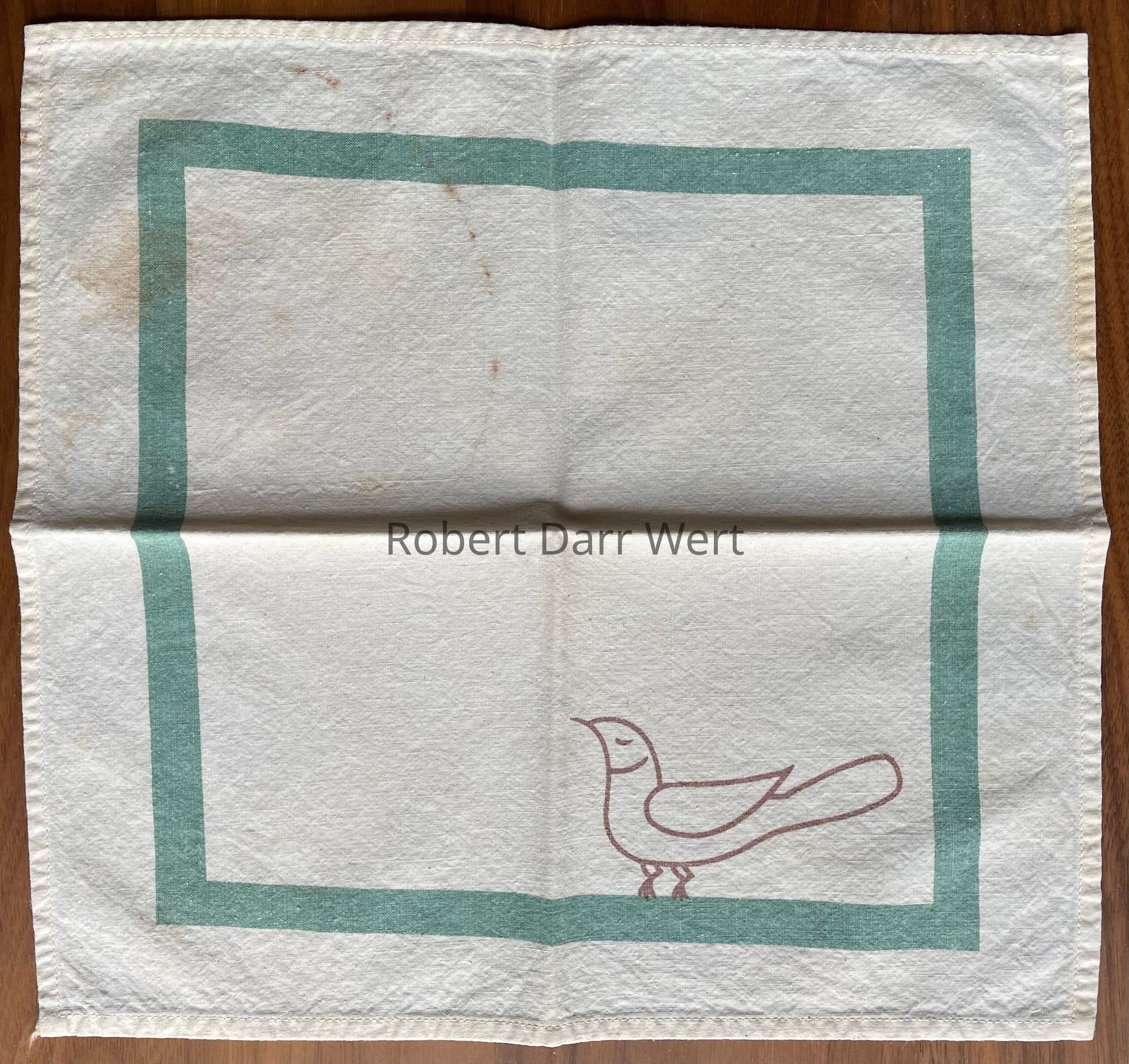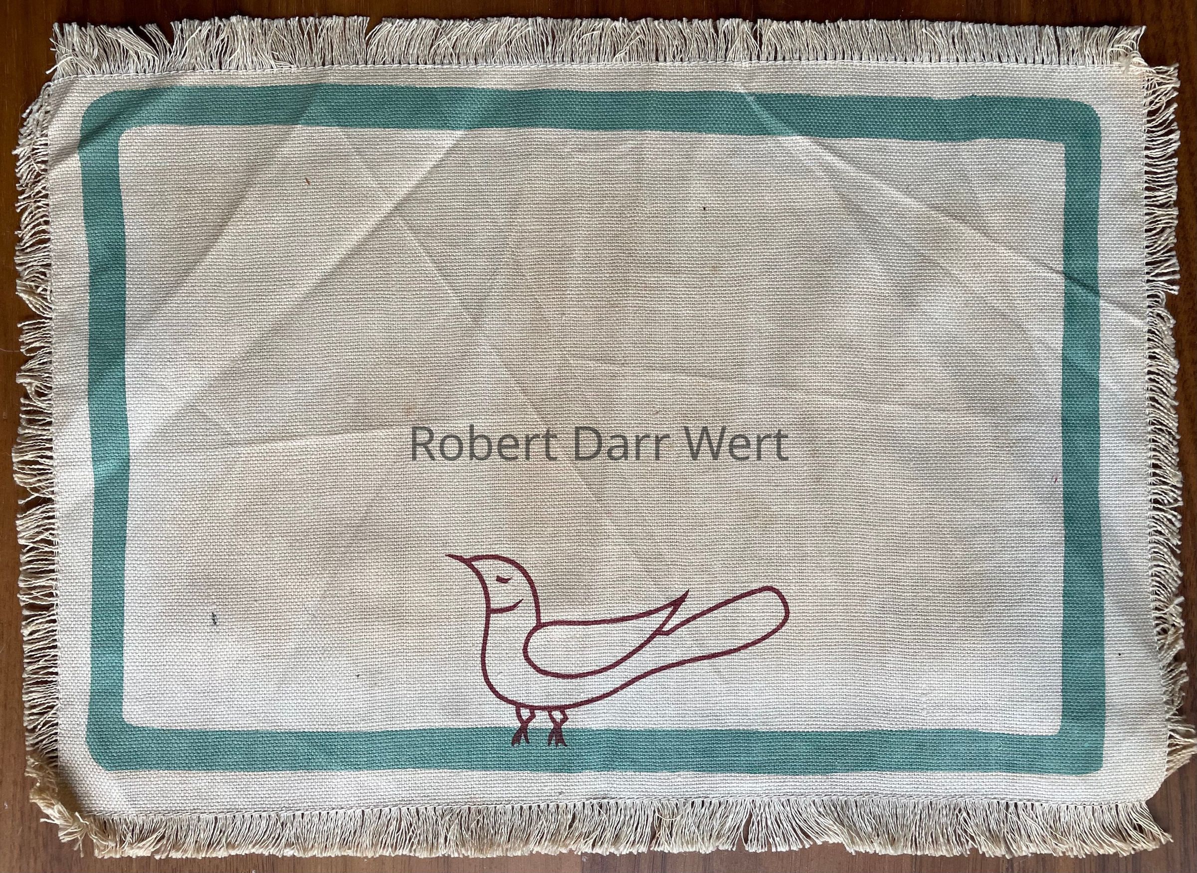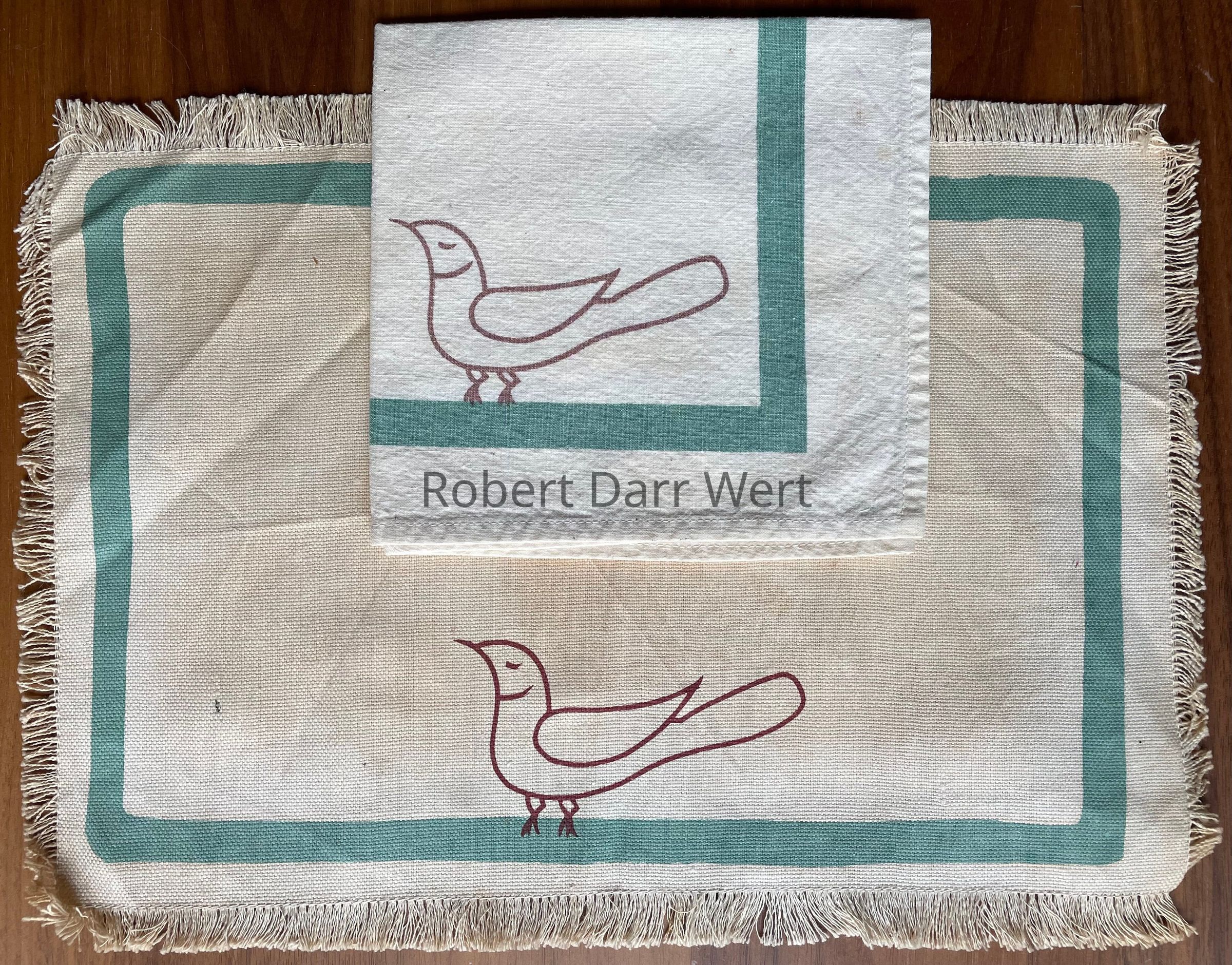 A small breakfast or luncheon placemat set with two-color silkscreen prints on the placemat and matching napkin. Each depicts a line drawing of a bird reminiscent of Pennsylvania “Dutch” iconography. On each, the bird sits upon a blue-green border.
