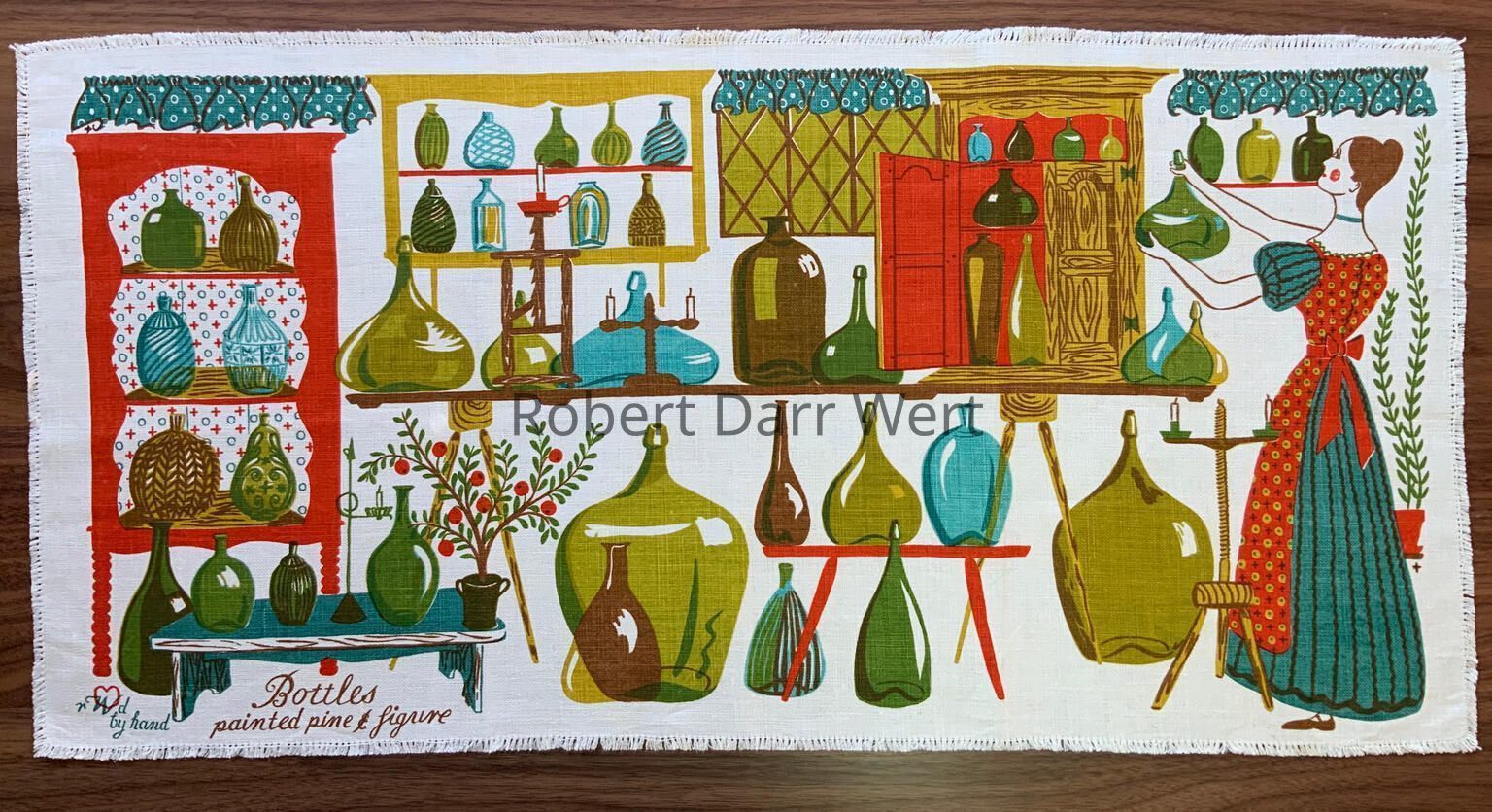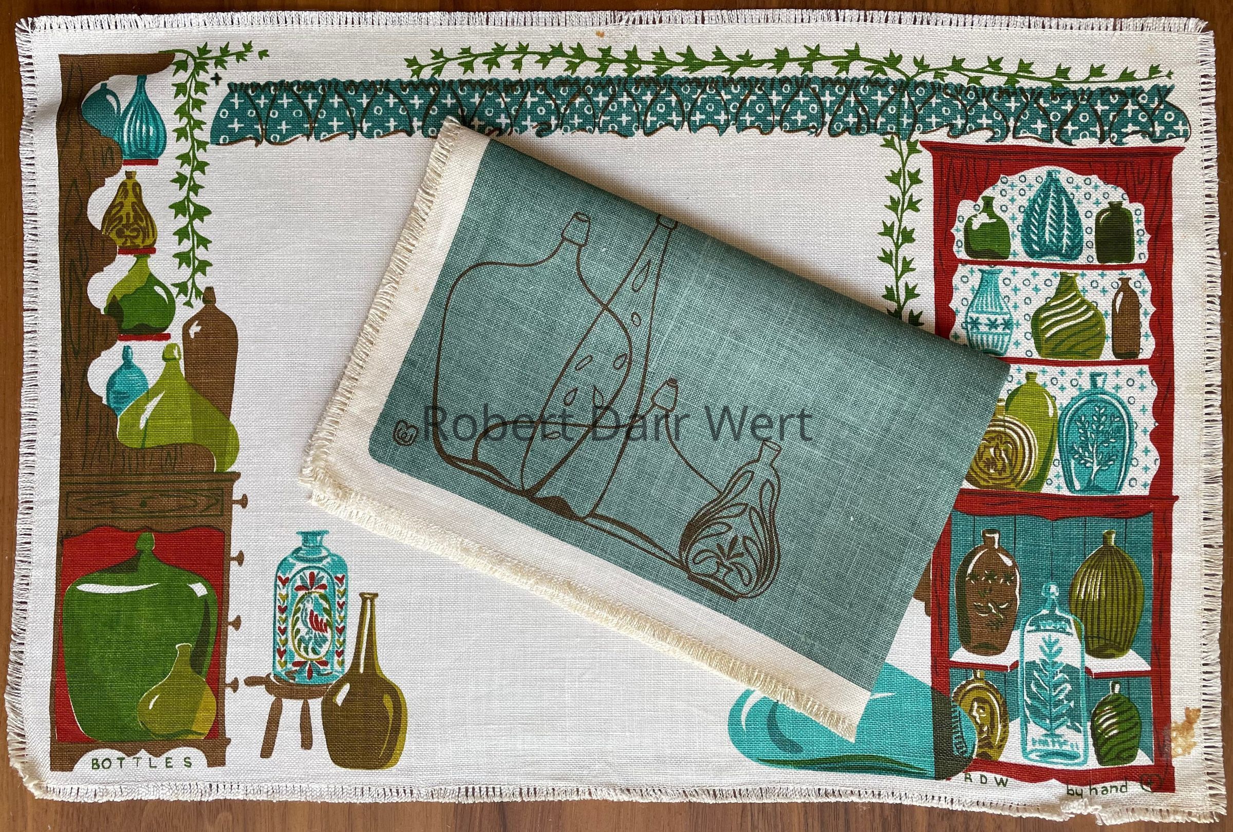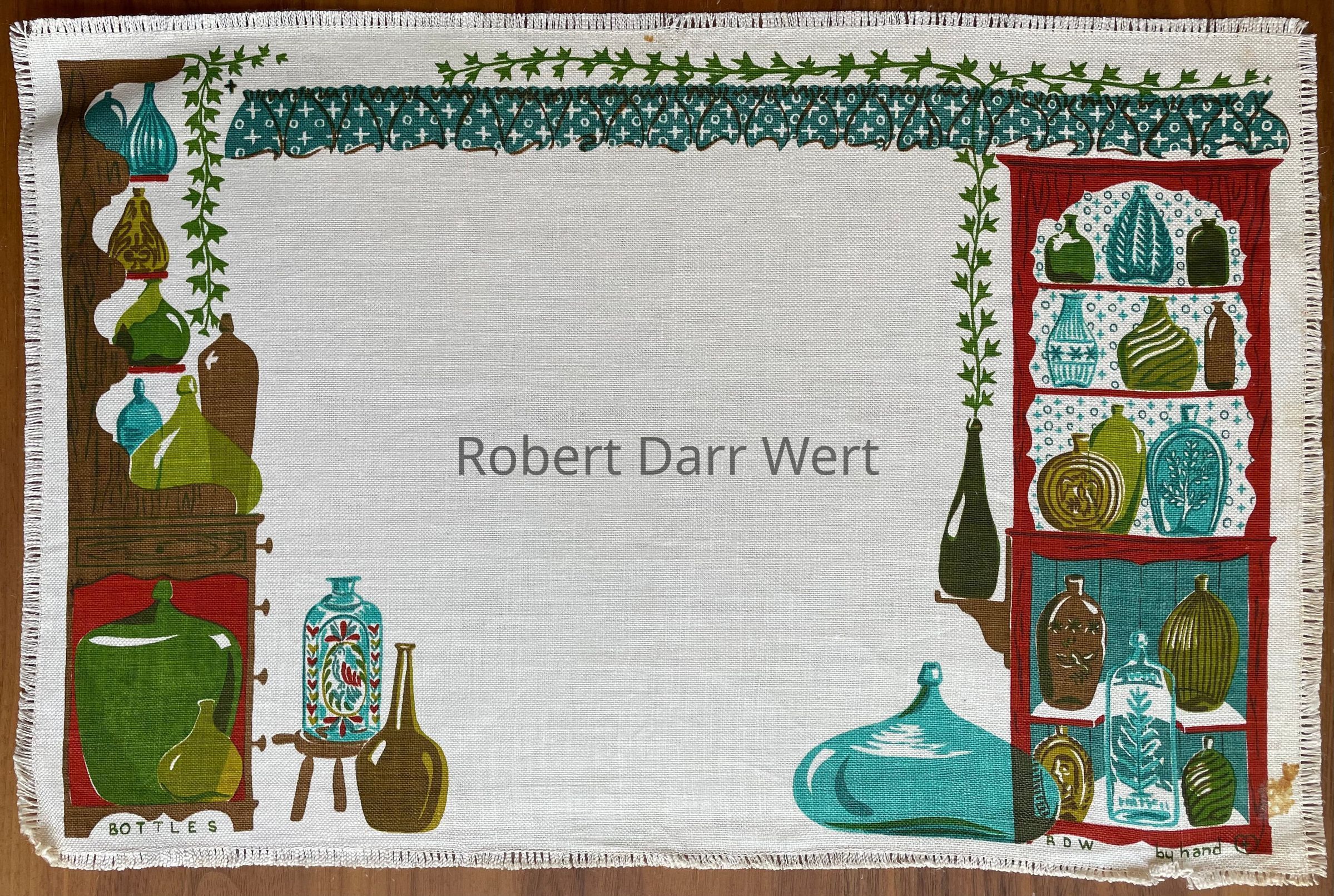 A placemat with a six-color silkscreen print on off-white linen depicting glass bottles displayed in wood cabinets on either side of the mat. The twenty-seven bottles illustrated are hand blown, mold blown, and painted/enameled. Across the top of the mat, the design is unified with a blue calico valance and trailing vines of ivy. The title “BOTTLES” appears at lower left.