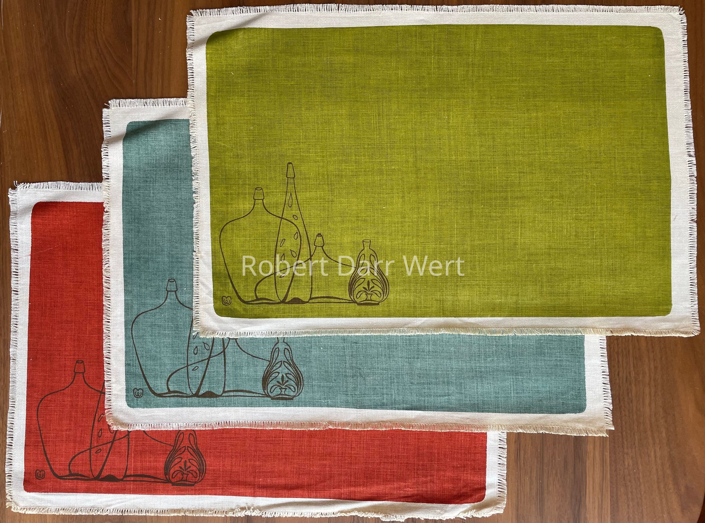 The three matching napkins have silkscreen printed color fields on white linen with a black print of antique bottles. Later versions are printed on dyed blue linen.