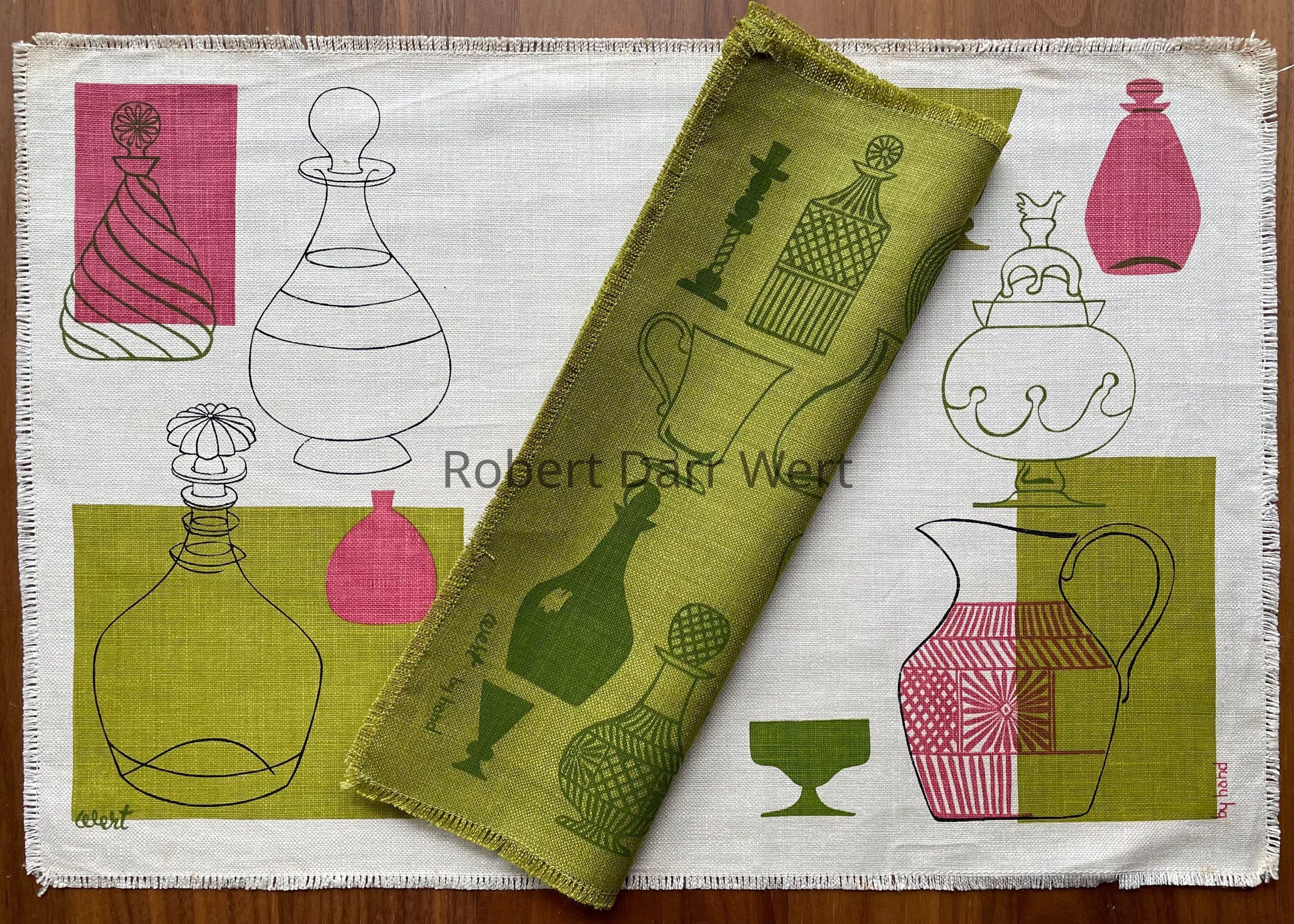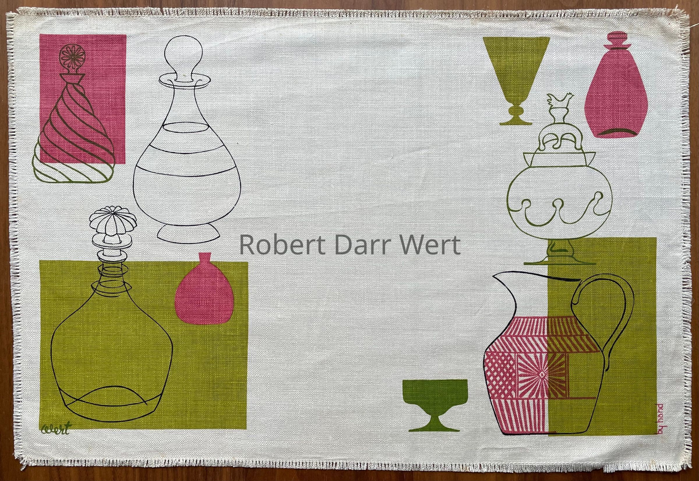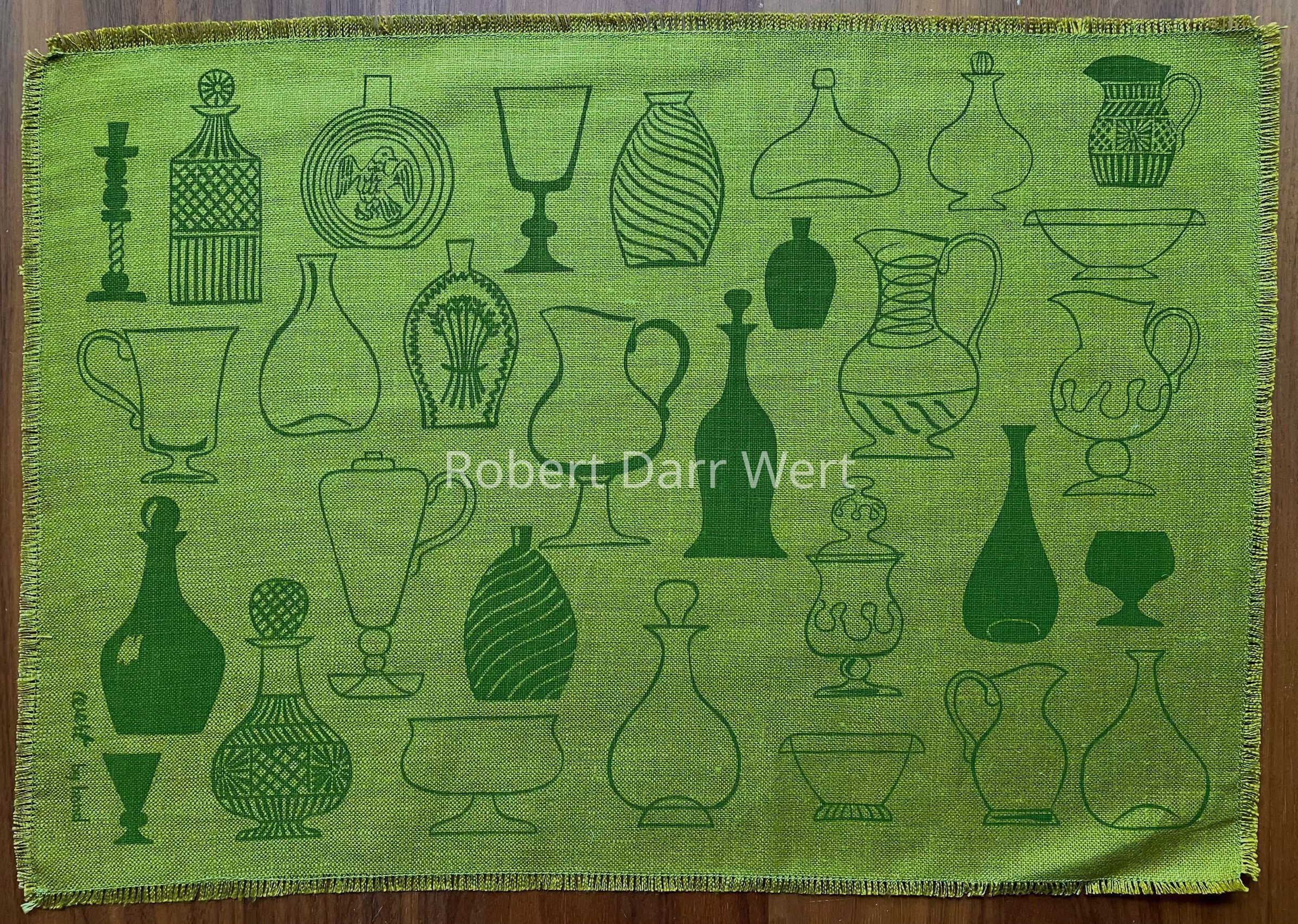 Placemat: a three-color silkscreen print on off-white linen depicting antique glassware and decanters in line drawings and silhouettes. Rectangular fields of color anchor the composition.