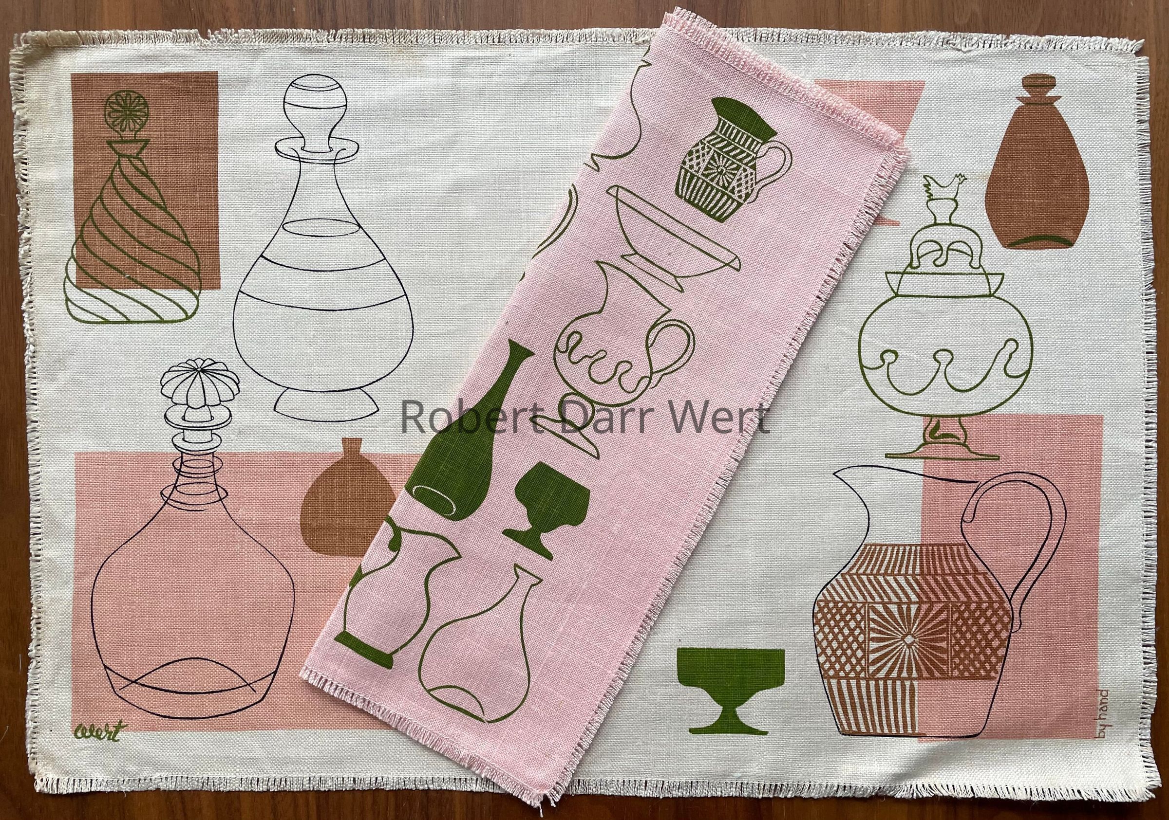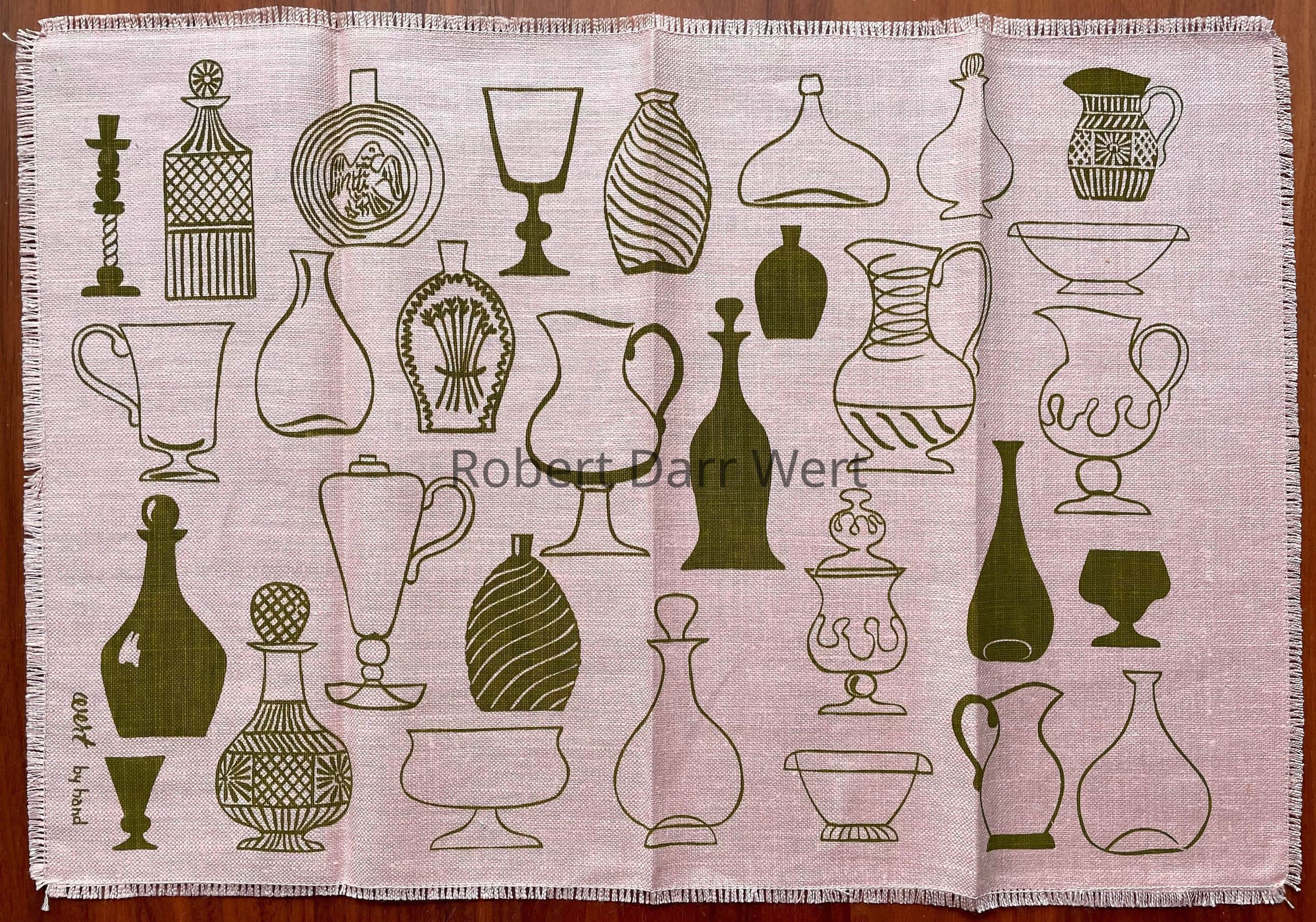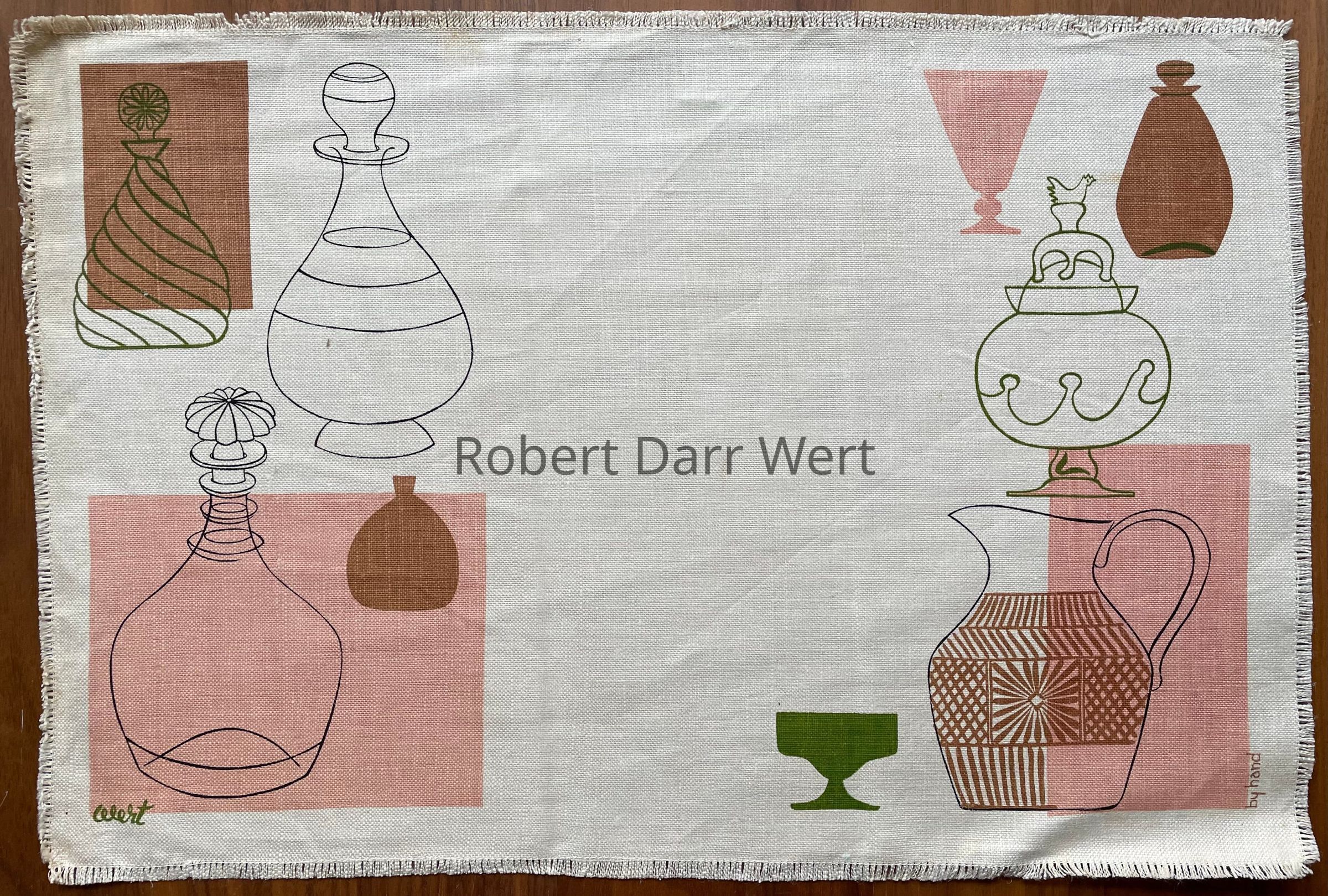 Placemat: a three-color silkscreen print on off-white linen depicting antique glassware and decanters in line drawings and silhouettes. Rectangular fields of color anchor the composition.