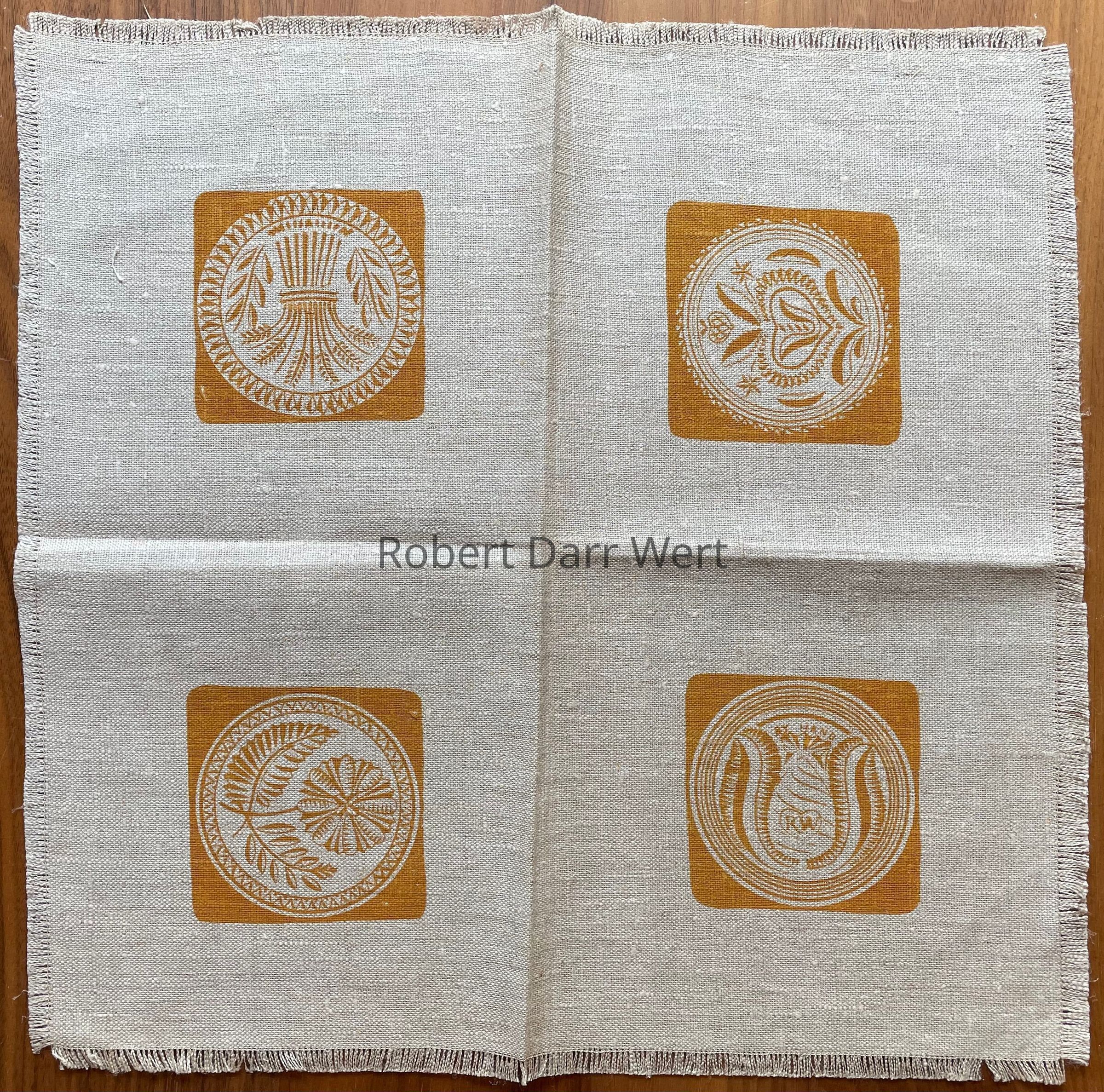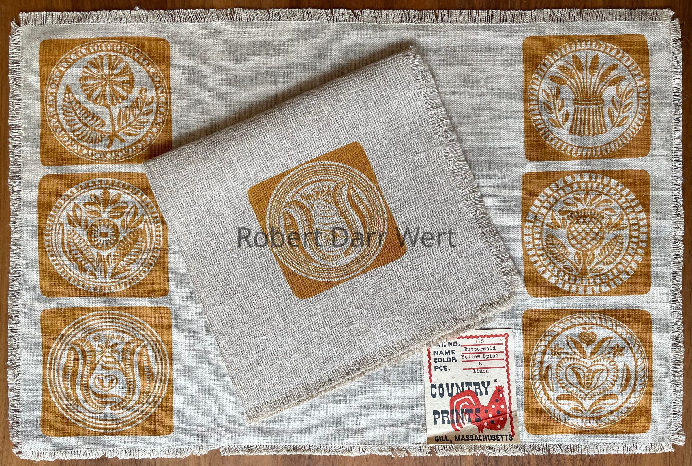 A one-color silkscreen print on natural linen depicting the faces of six early American carved wood buttermolds. The matching square dinner napkin depicts four buttermolds taken from the four corners of the placemat. On this version of the napkin the buttermolds are centered within each quadrant rather than placed to the outside edges as in other examples.