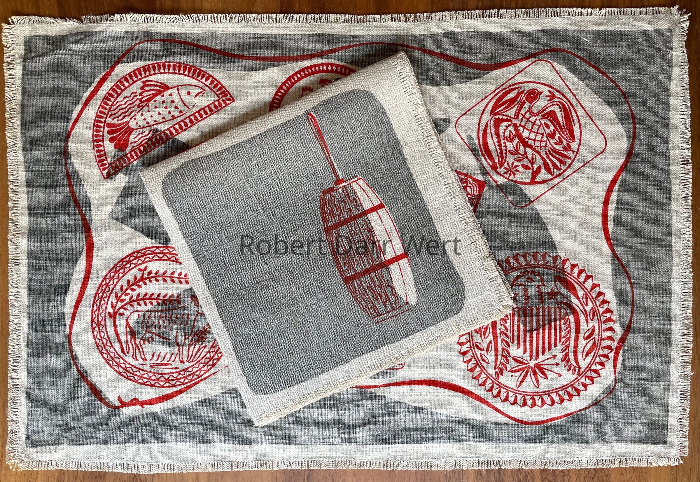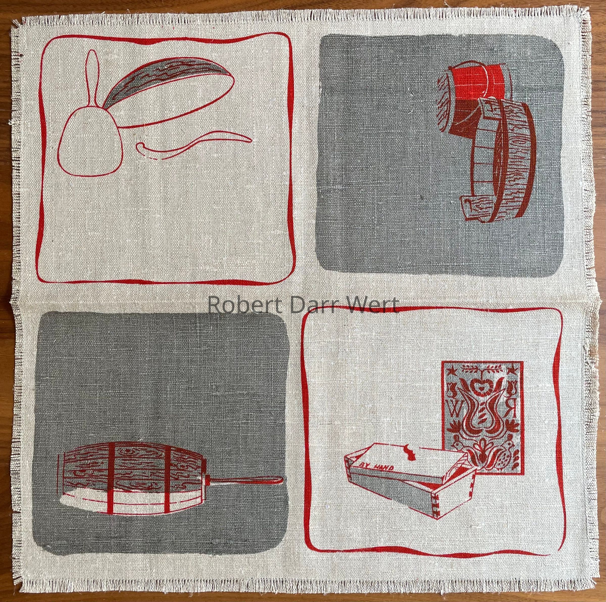 Napkin: “RW” in reverse on carved buttermold, and “BY HAND” on lid of buttermold.Material