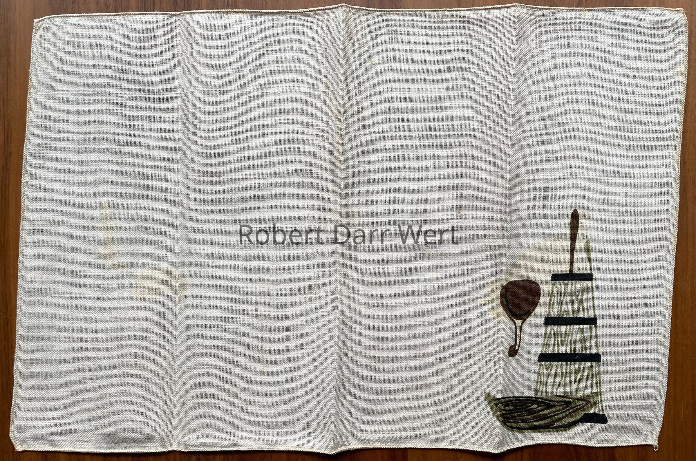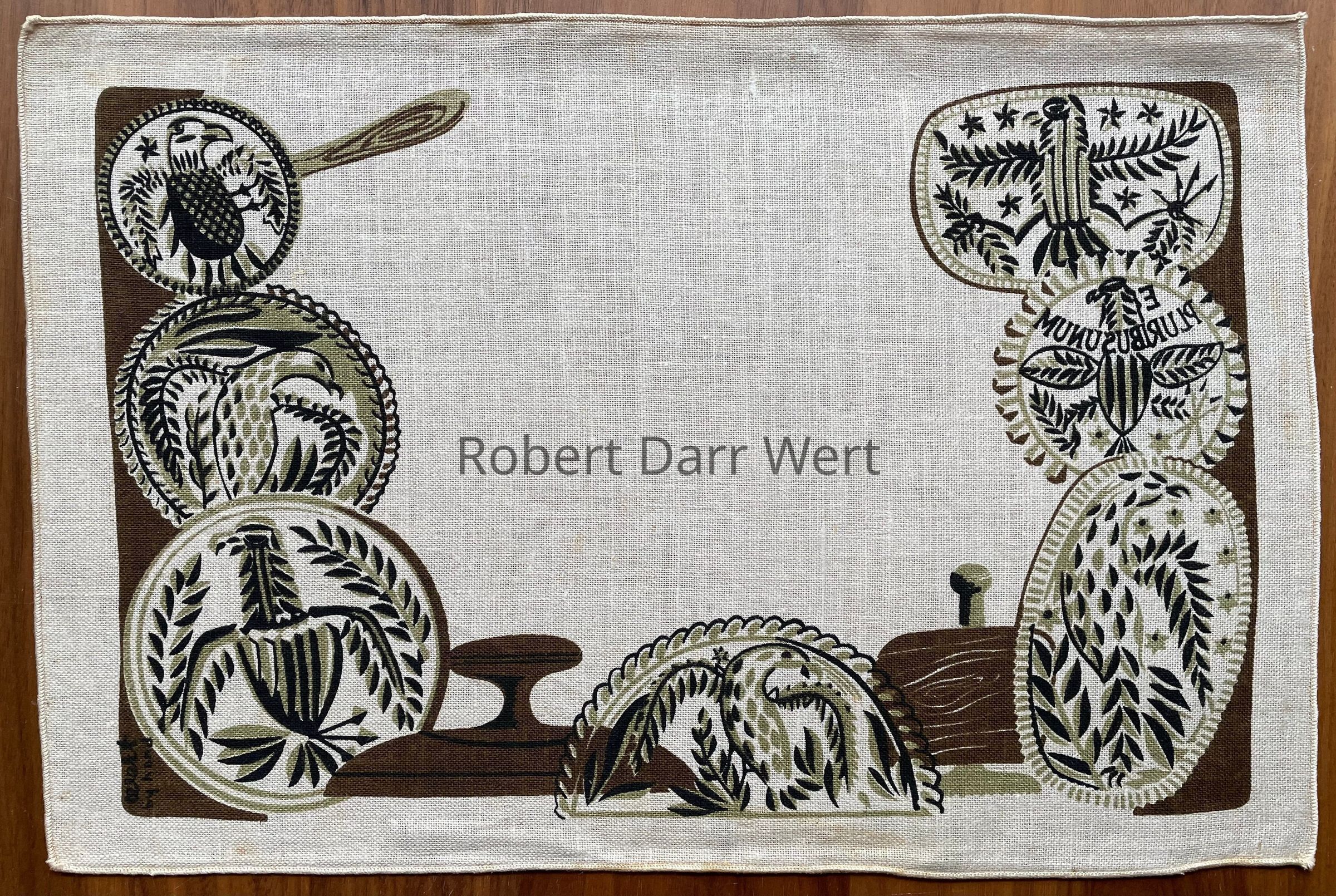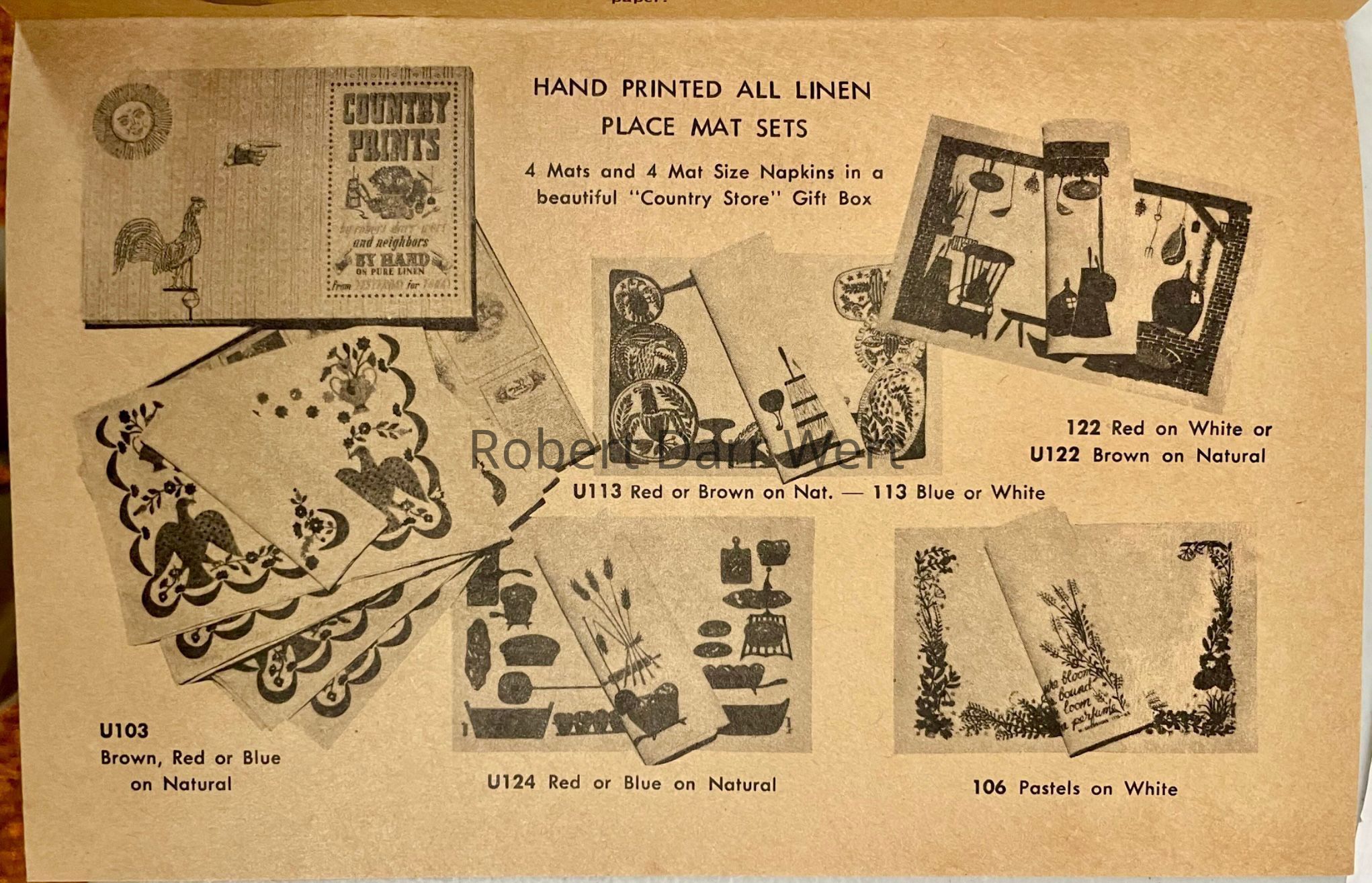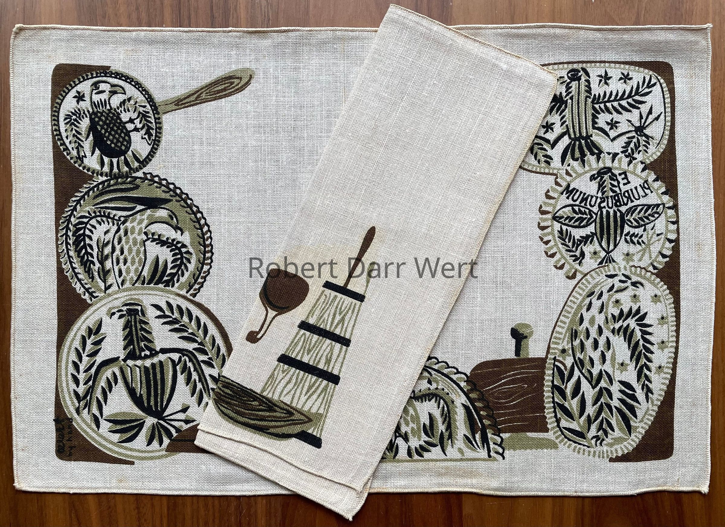 This placemat set is listed on the Spring 1958 and January 1960 Country Prints price lists in four colorways (red, brown, green, or blue). It also appears in the c.1960 brochure “Mat Sets by Robert Darr Wert/Country Prints”, with fringed edges, and “Country Prints by Robert Darr Wert and Neighbors”, c.1963, with serged and bound edges.Made/Created