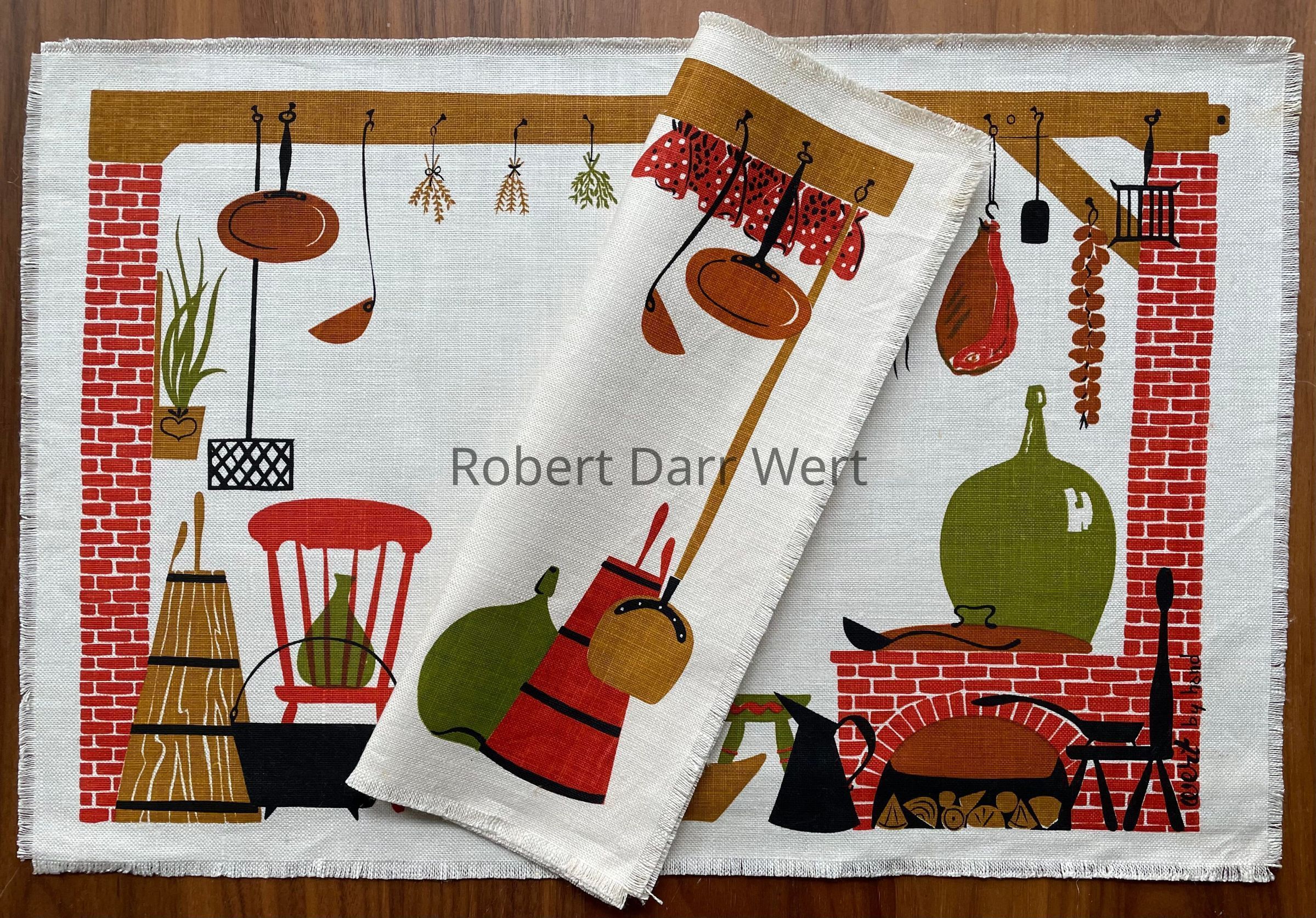 This placemat set is described with two linen choices on the 1958 Country Prints price list, “122 Country Kitchen — Early Reds, Blue, maple and Blk on either white or tan.”