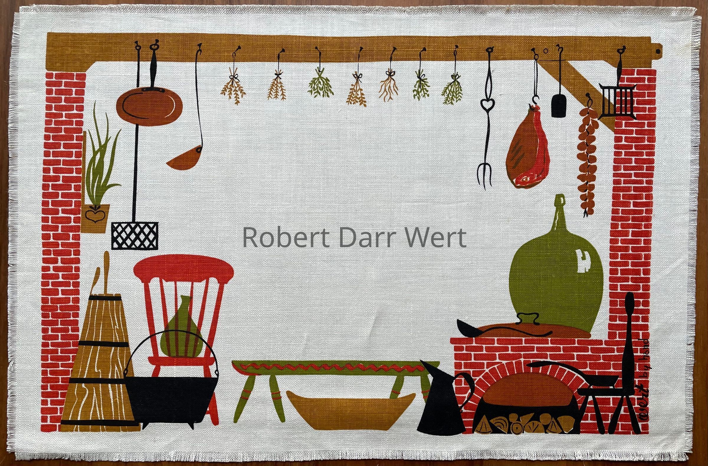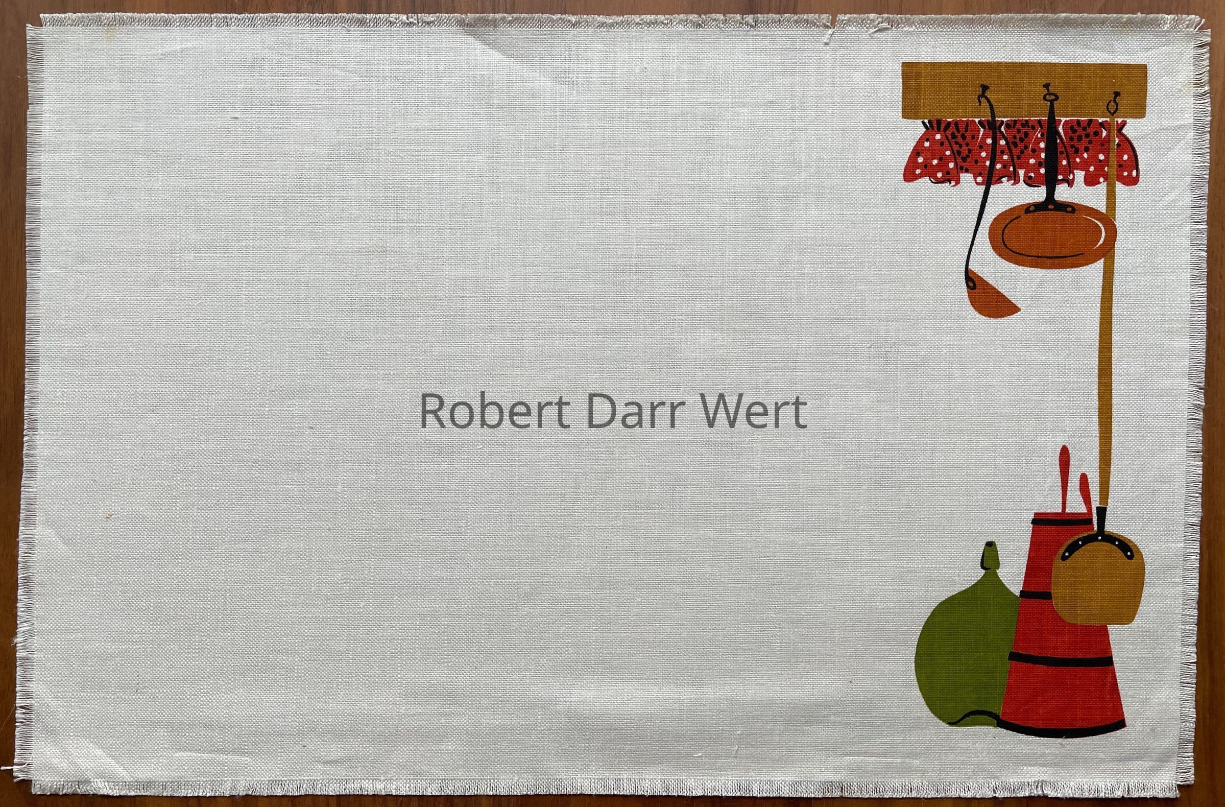 It is listed in the January 1960 Country Prints price list in two colorways (red or brown). It appears in the brochures “Mat Sets by Robert Darr Wert/Country Prints”, c.1960 (with fringed edges), and “Country Prints by Robert Darr Wert and Neighbors”, c.1963 (with serged and bound edges); see brochure images below.