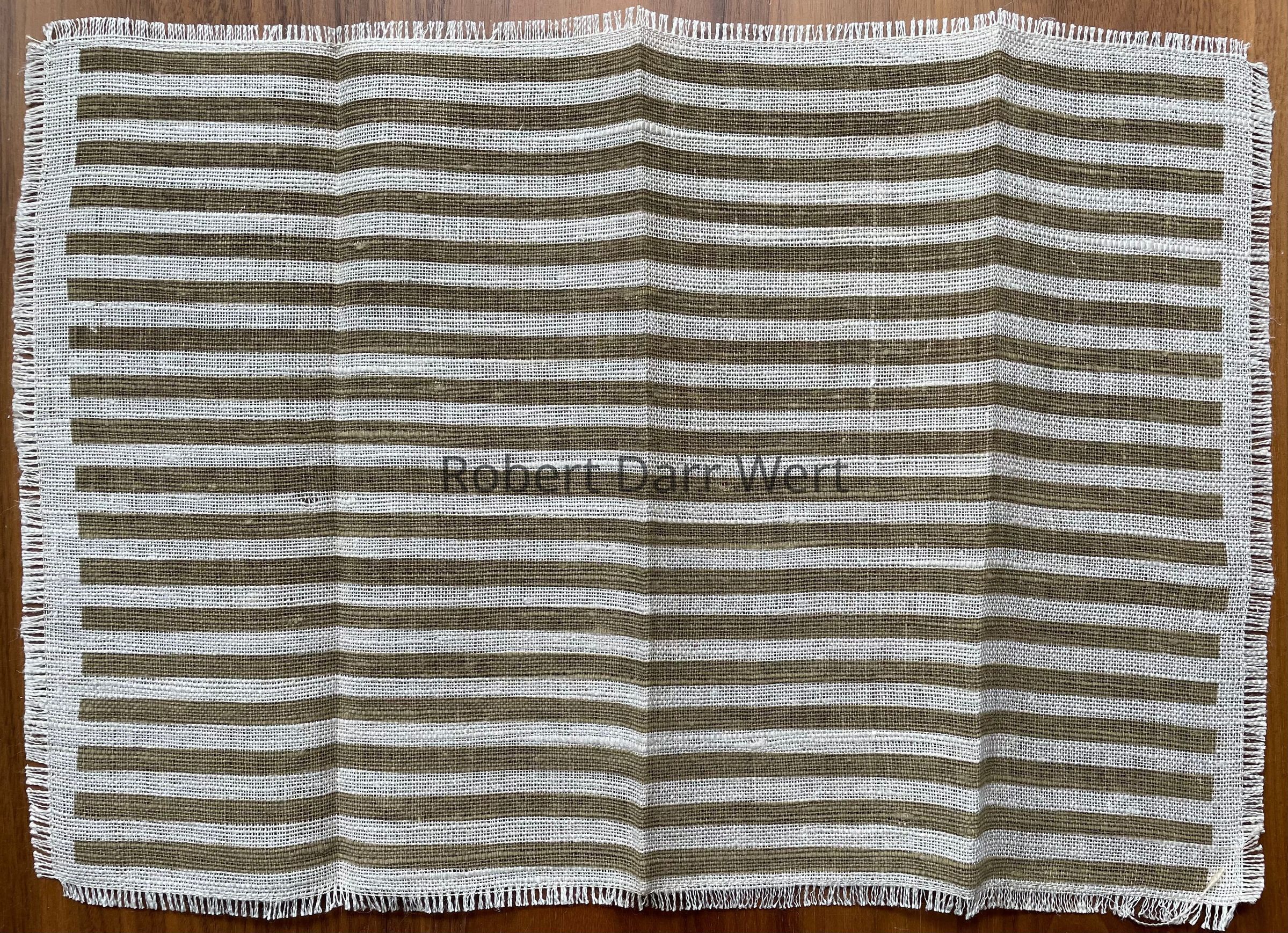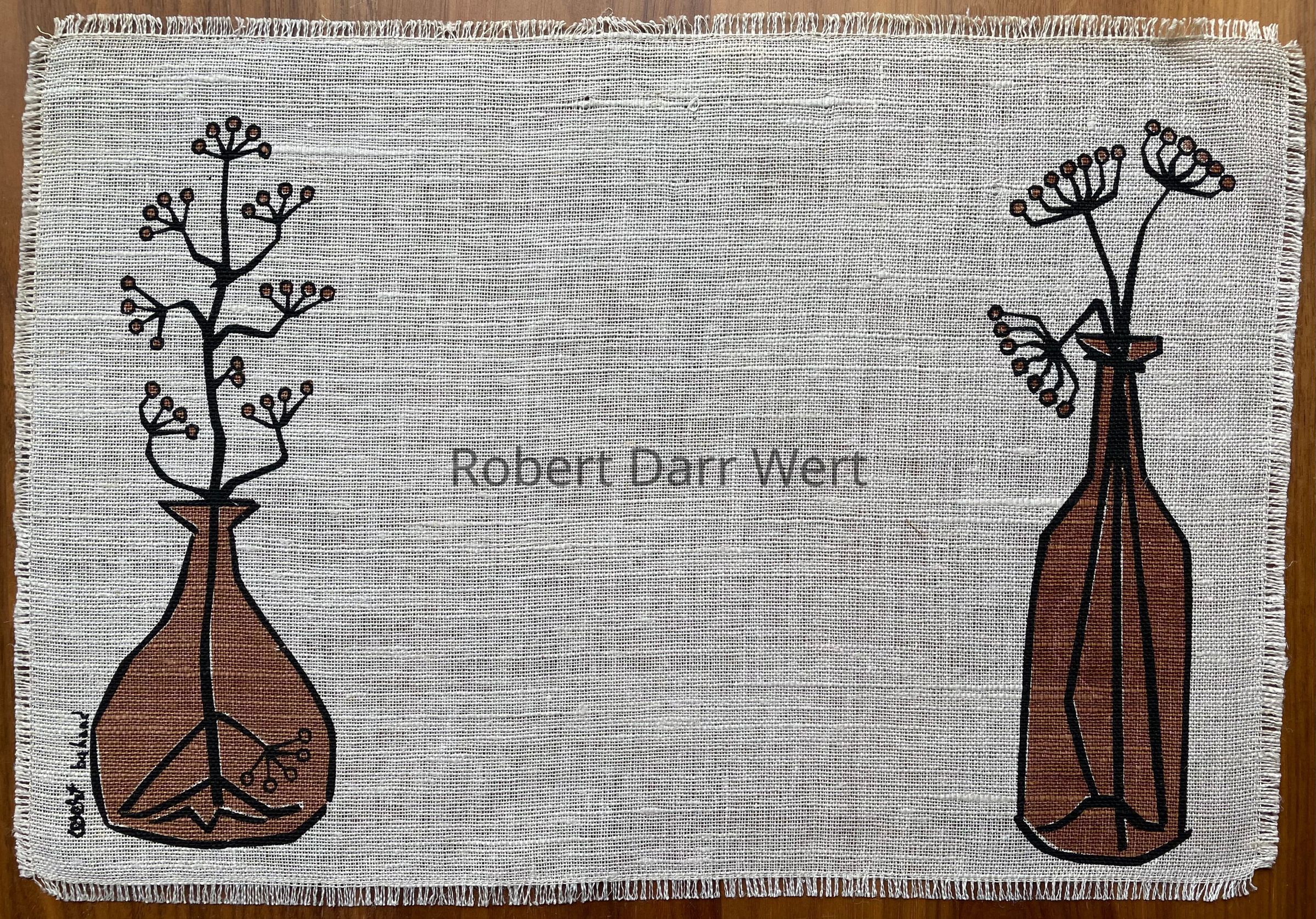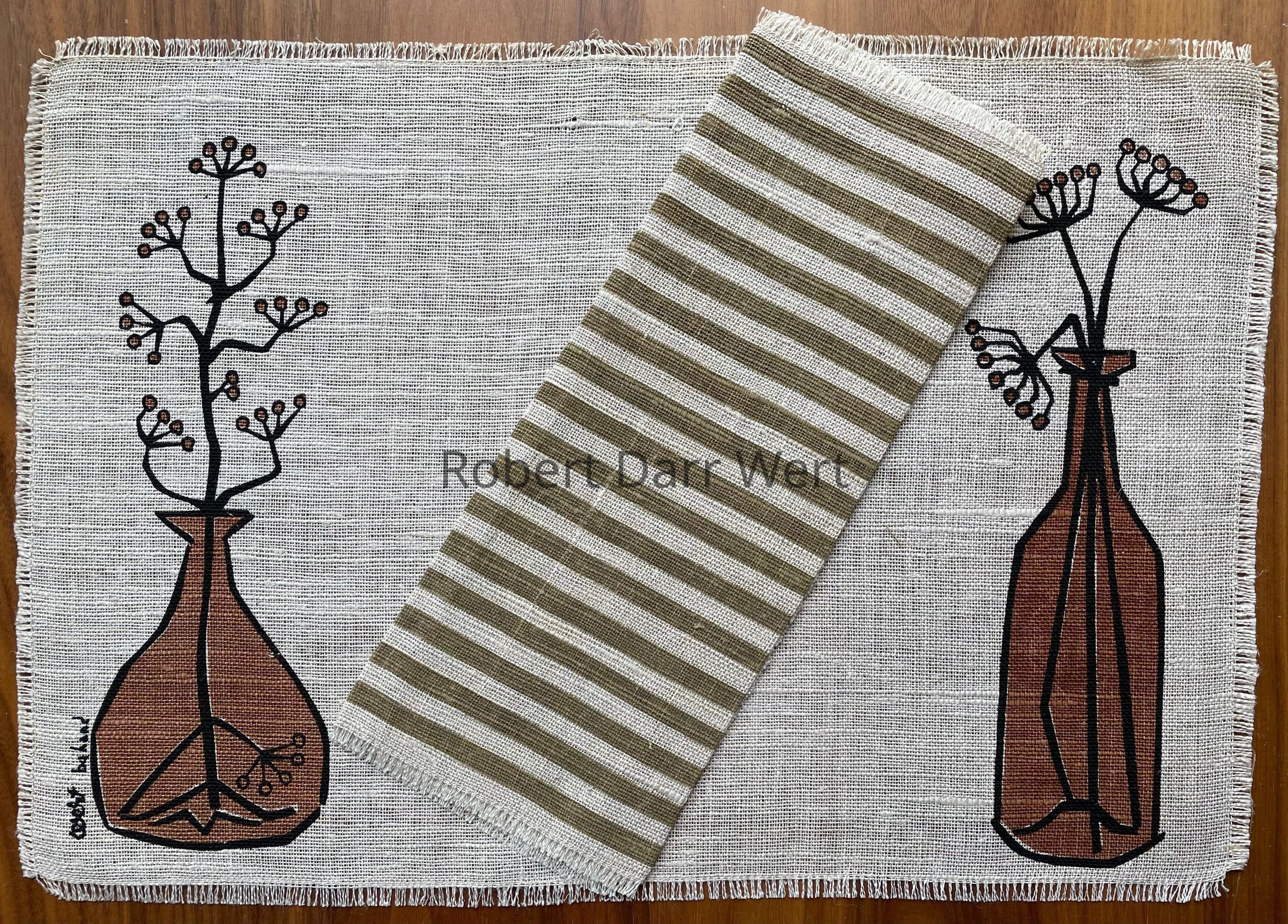 Napkin: this striped napkin was found paired with the placemat in Sara Leeper’s collection of her father’s work. It is entirely possible this placemat should have a brown napkin printed with stylized herb plants like the other three Bottled Herbs 107 placemat sets.