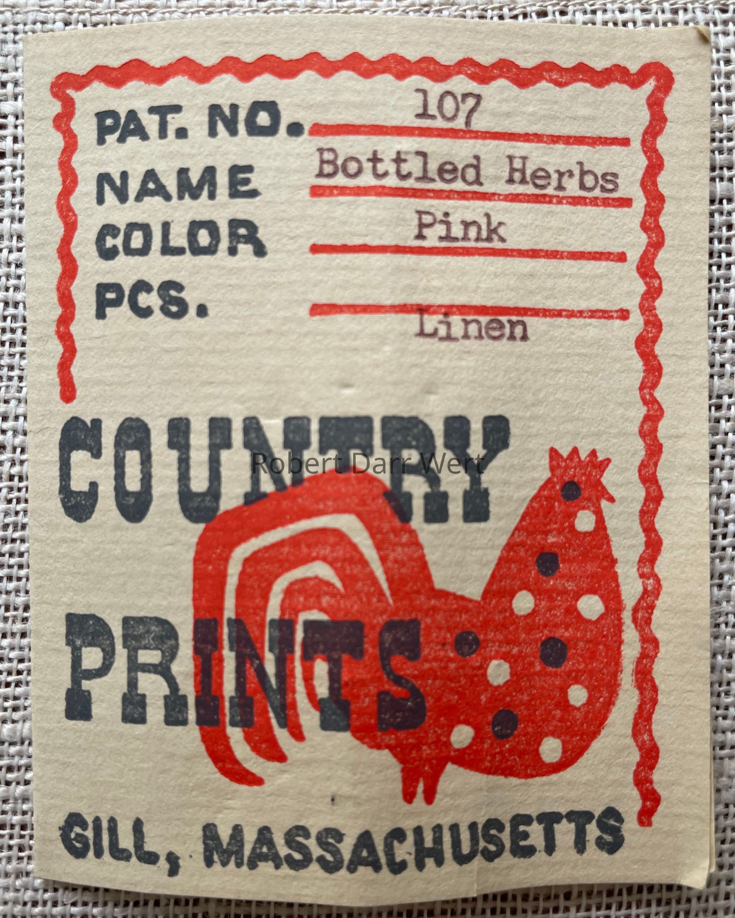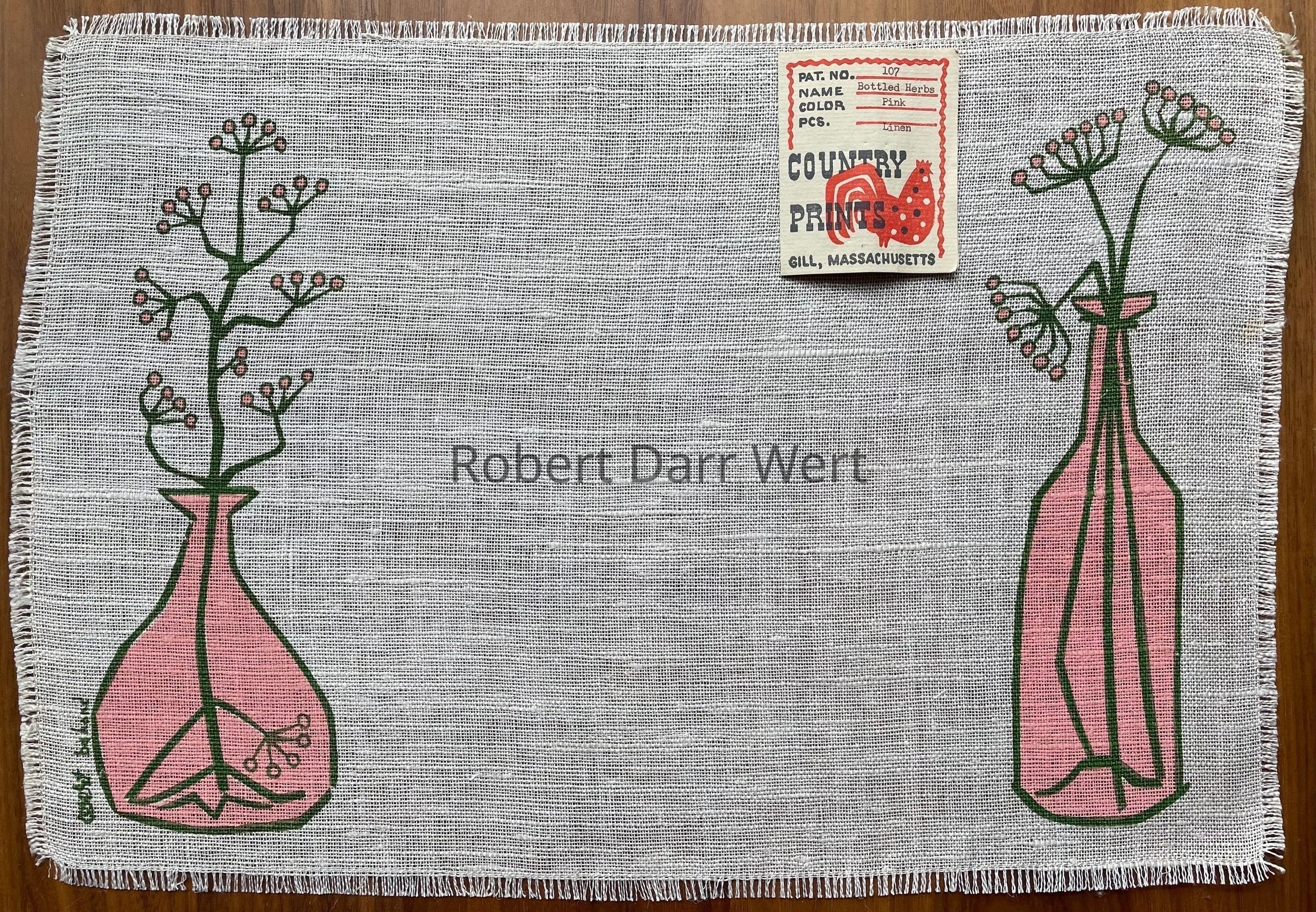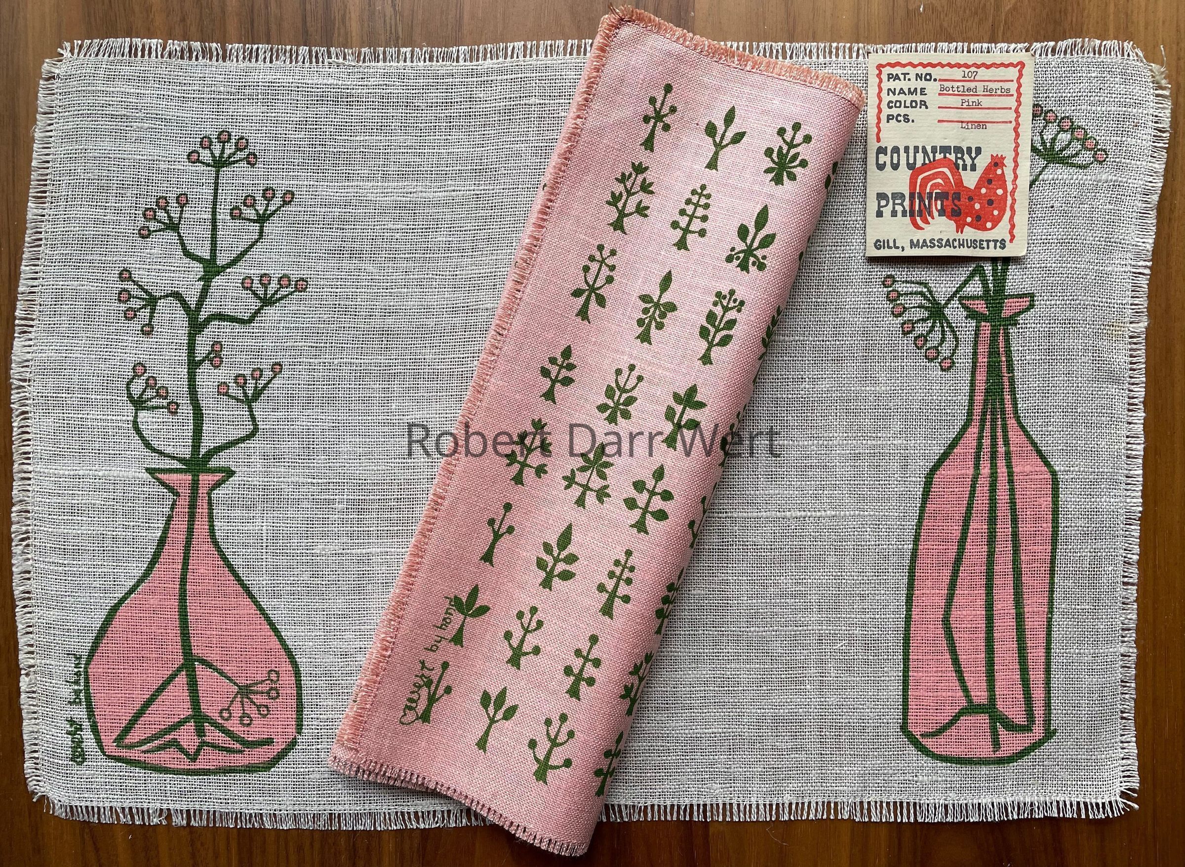 Placemat: a two-color silkscreen print on loosely woven natural linen. Imagery depicts two bottles, each holding sprigs of herbs.