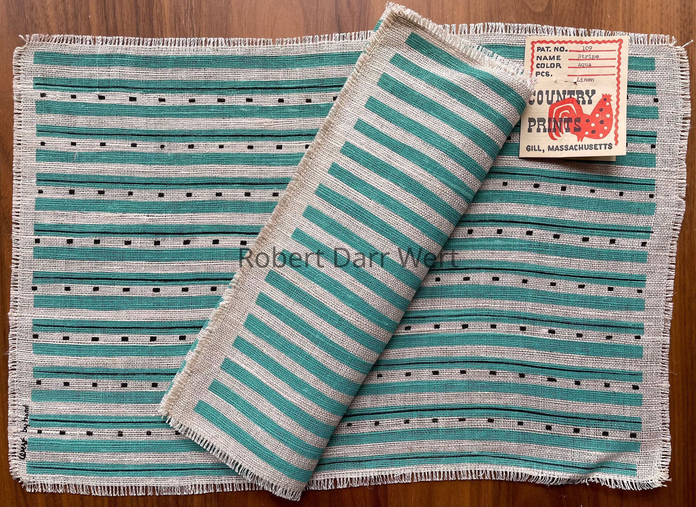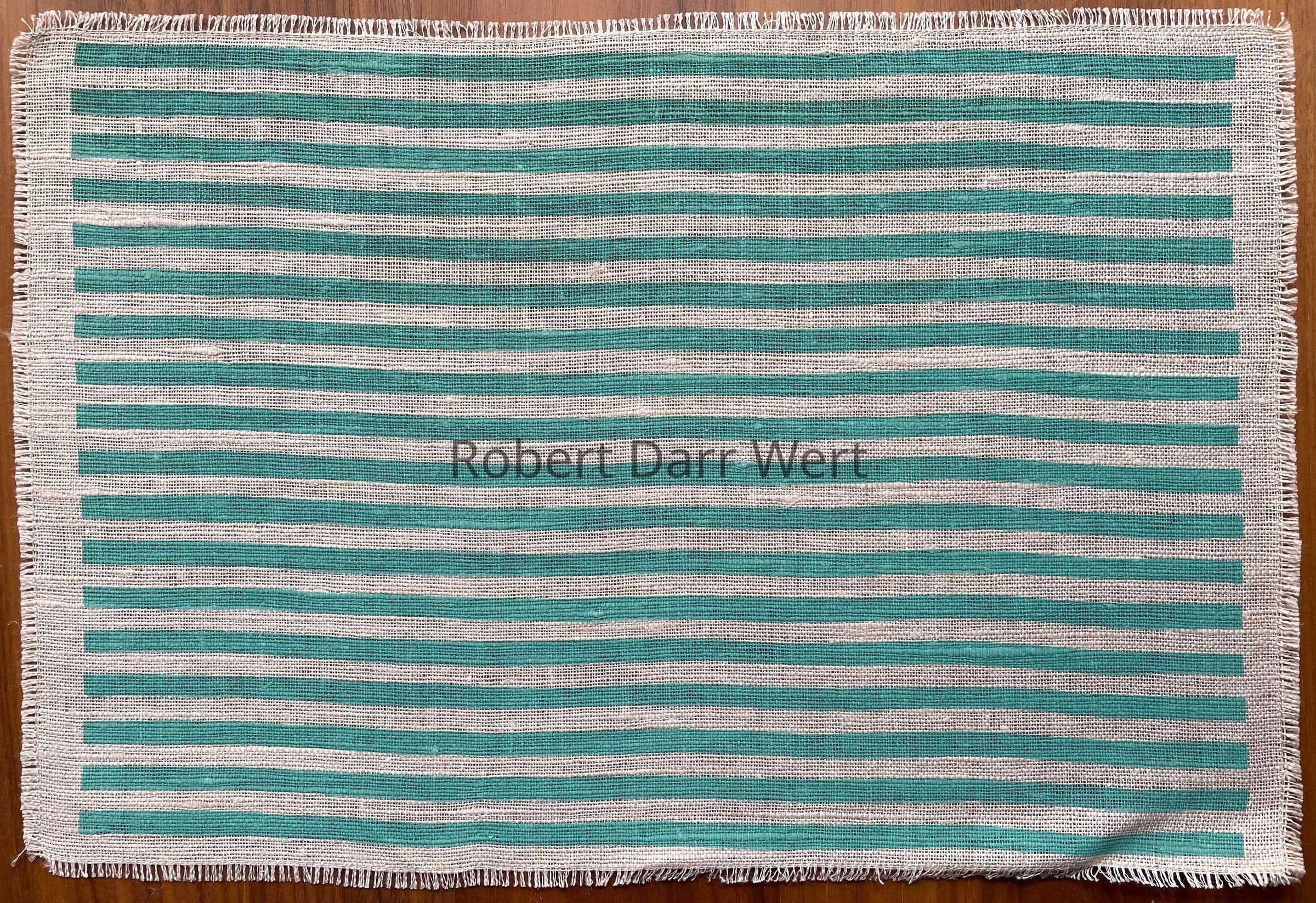 Placemat: a two-color silkscreen print on heaven texture off-white linen. The pattern is comprised of rows of solid color overprinted with thin black stripes and rows of small black rectangles.
