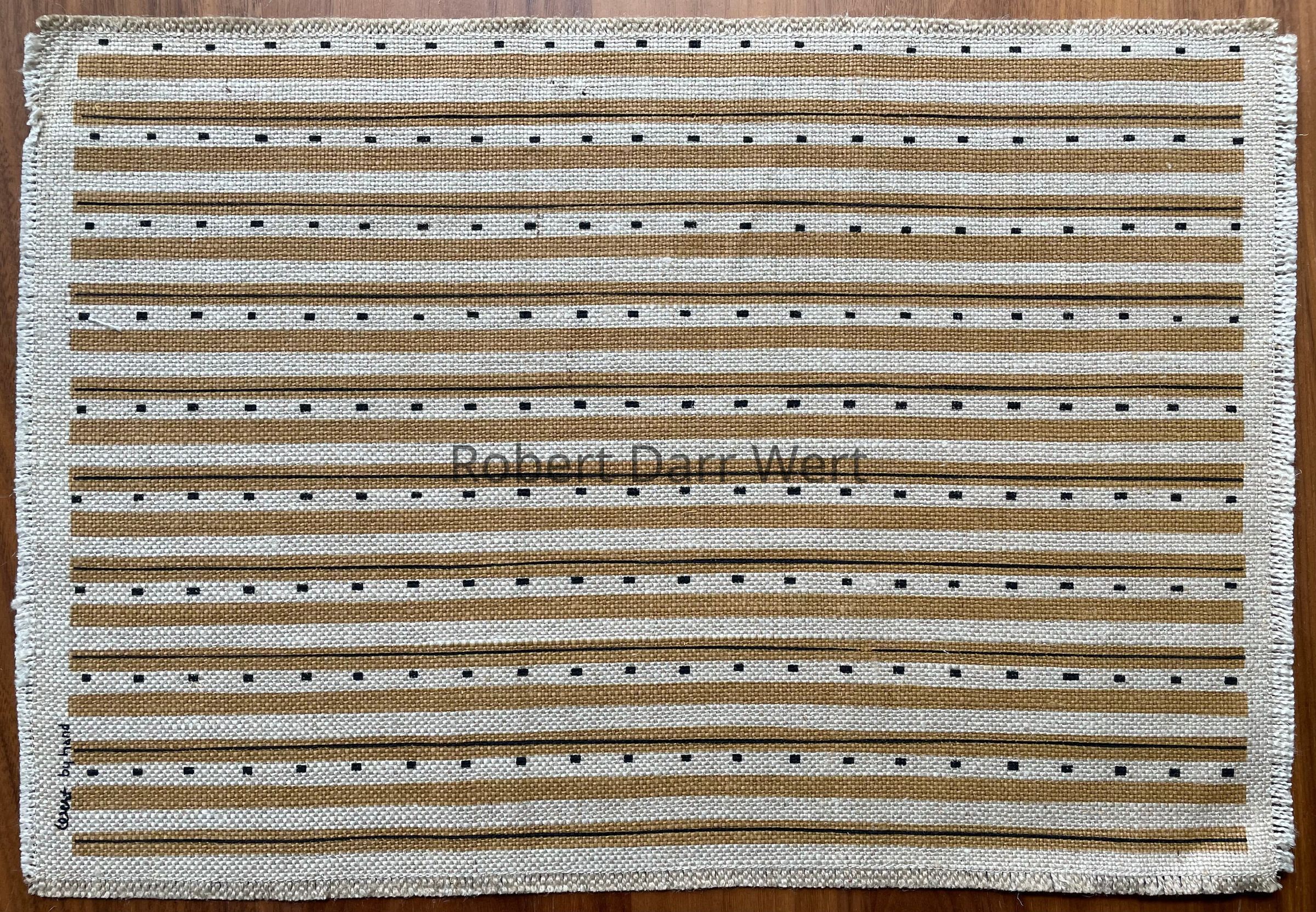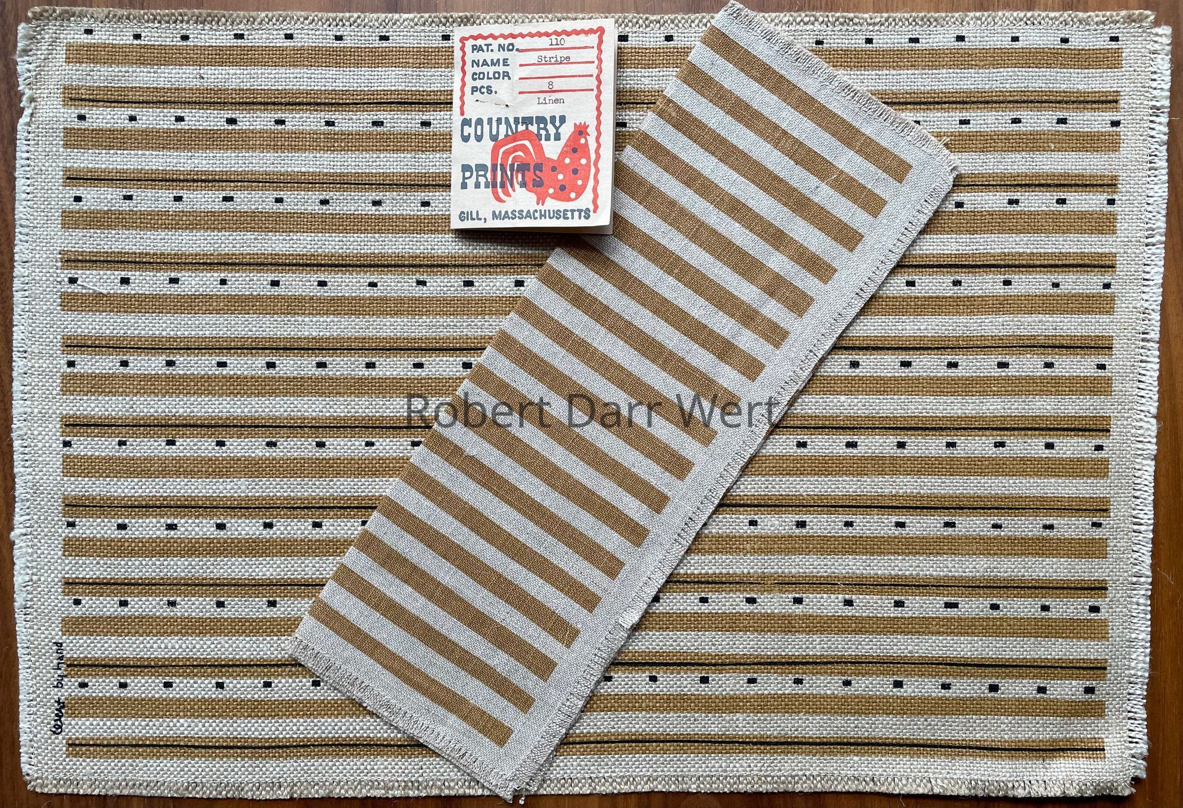 Placemat: a two-color silkscreen print on heaven texture off-white linen. The pattern is comprised of rows of solid color overprinted with thin black stripes and rows of small black rectangles.