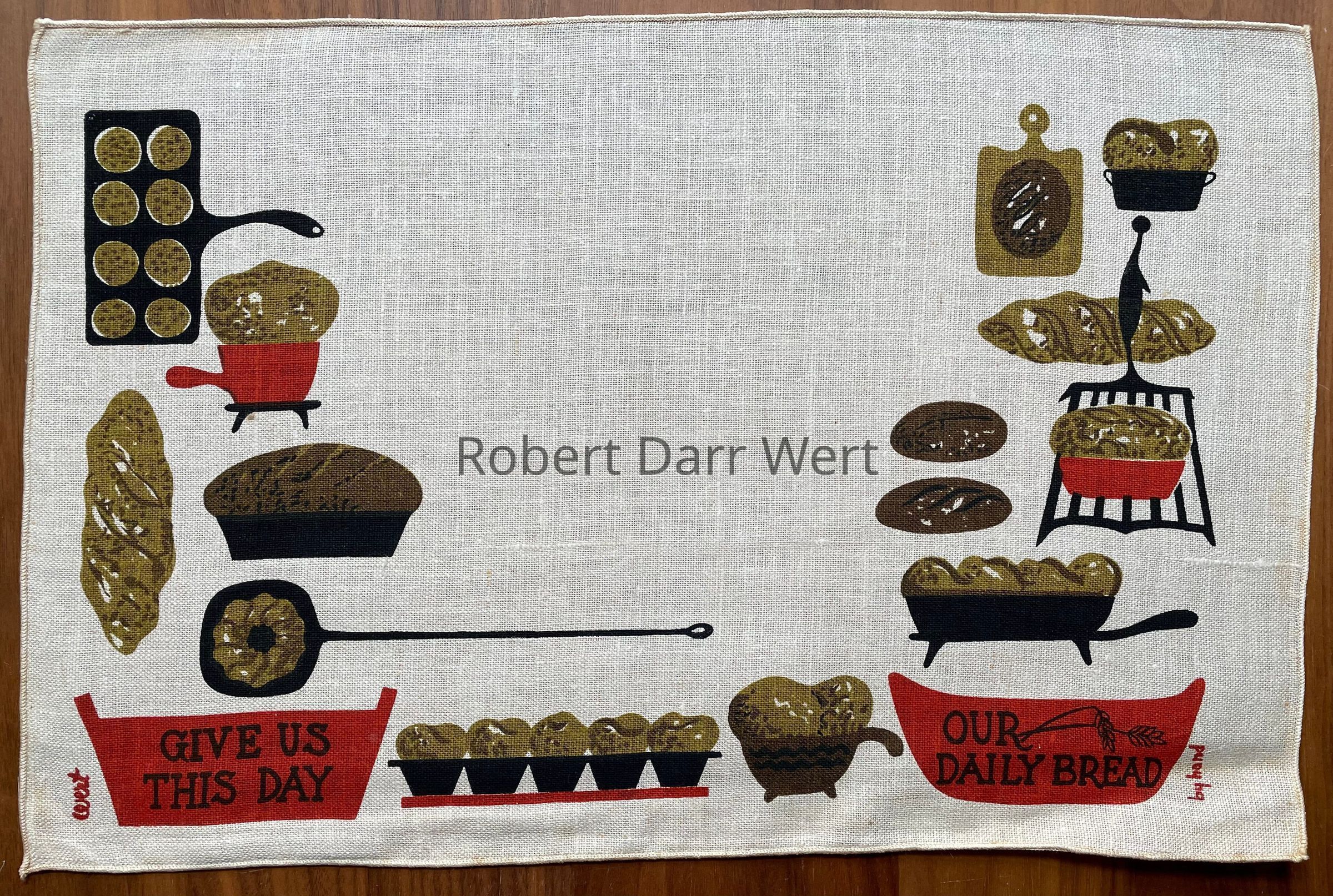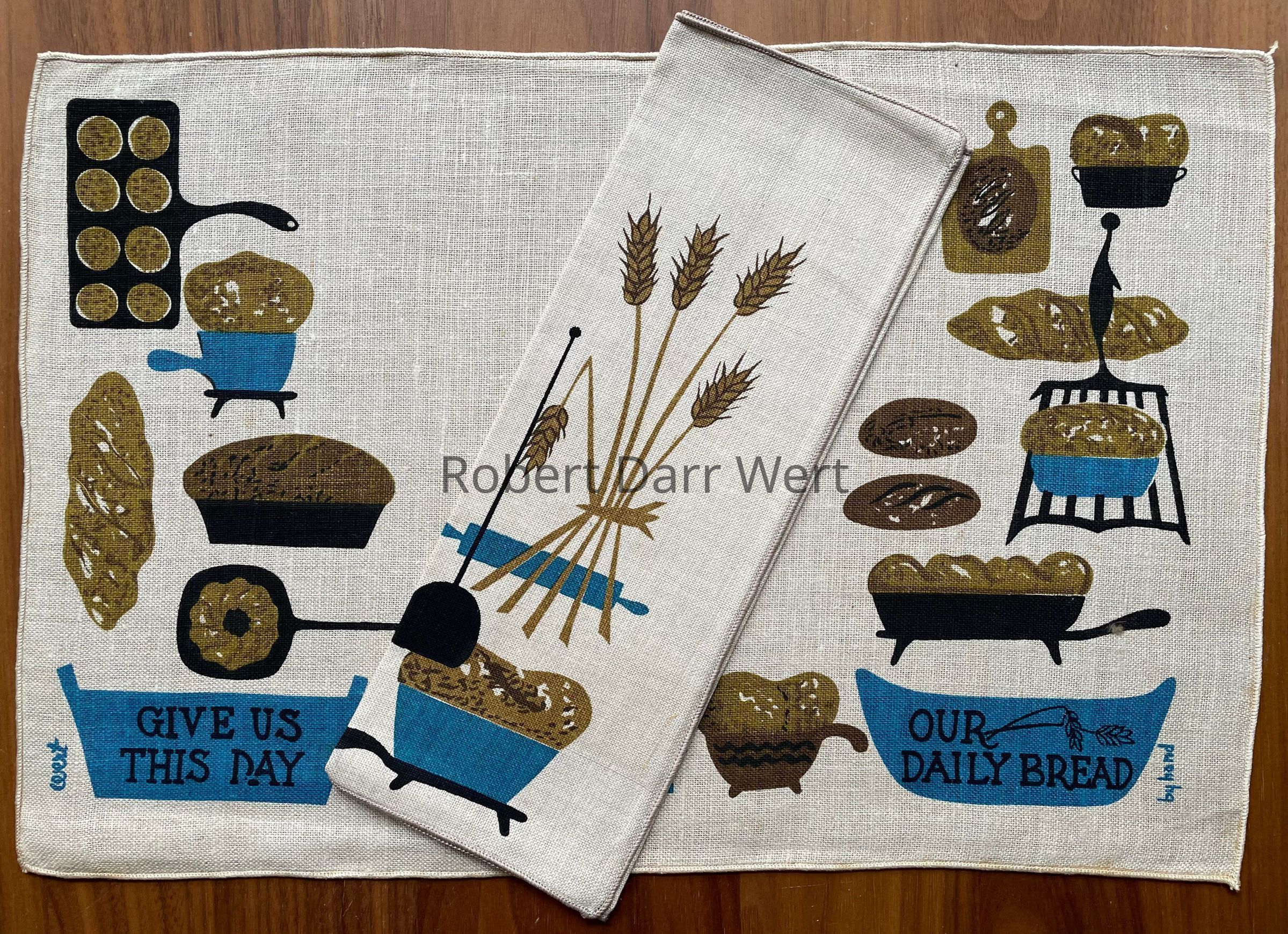 A four-color silkscreen print on off-white linen depicting numerous types of breads, rolls and muffins, along with the tools to make and serve them. At the lower left and right are serving vessels, each bearing a portion of the Lord’s prayer, “GIVE US THIS DAY”, at left and “OUR DAILY BREAD”, at right. See second image for matching napkin.