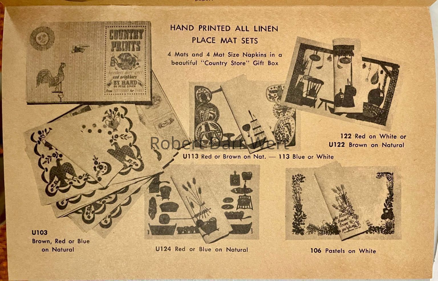 This placemat set is listed in the Spring 1958 and January 1960 Country Prints price lists in two colorways (red or blue). It appears in the c.1960 brochure “Mat Sets by Robert Darr Wert/Country Prints” (with fringed edges), and “Country Prints by Robert Darr Wert and Neighbors”, c.1963 (with serged and bound edges).