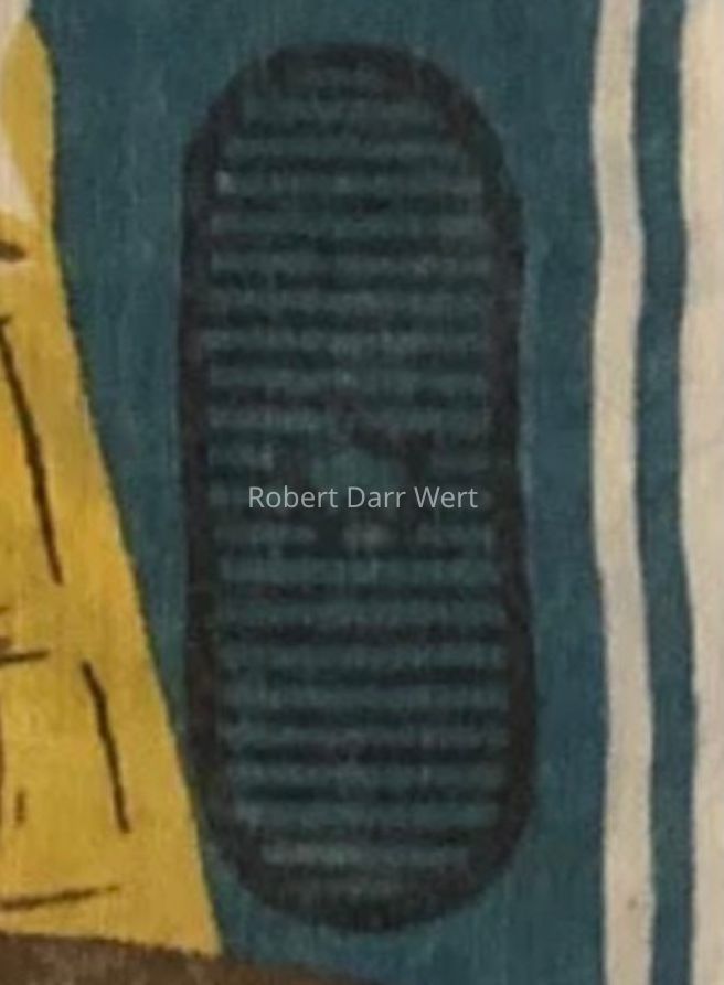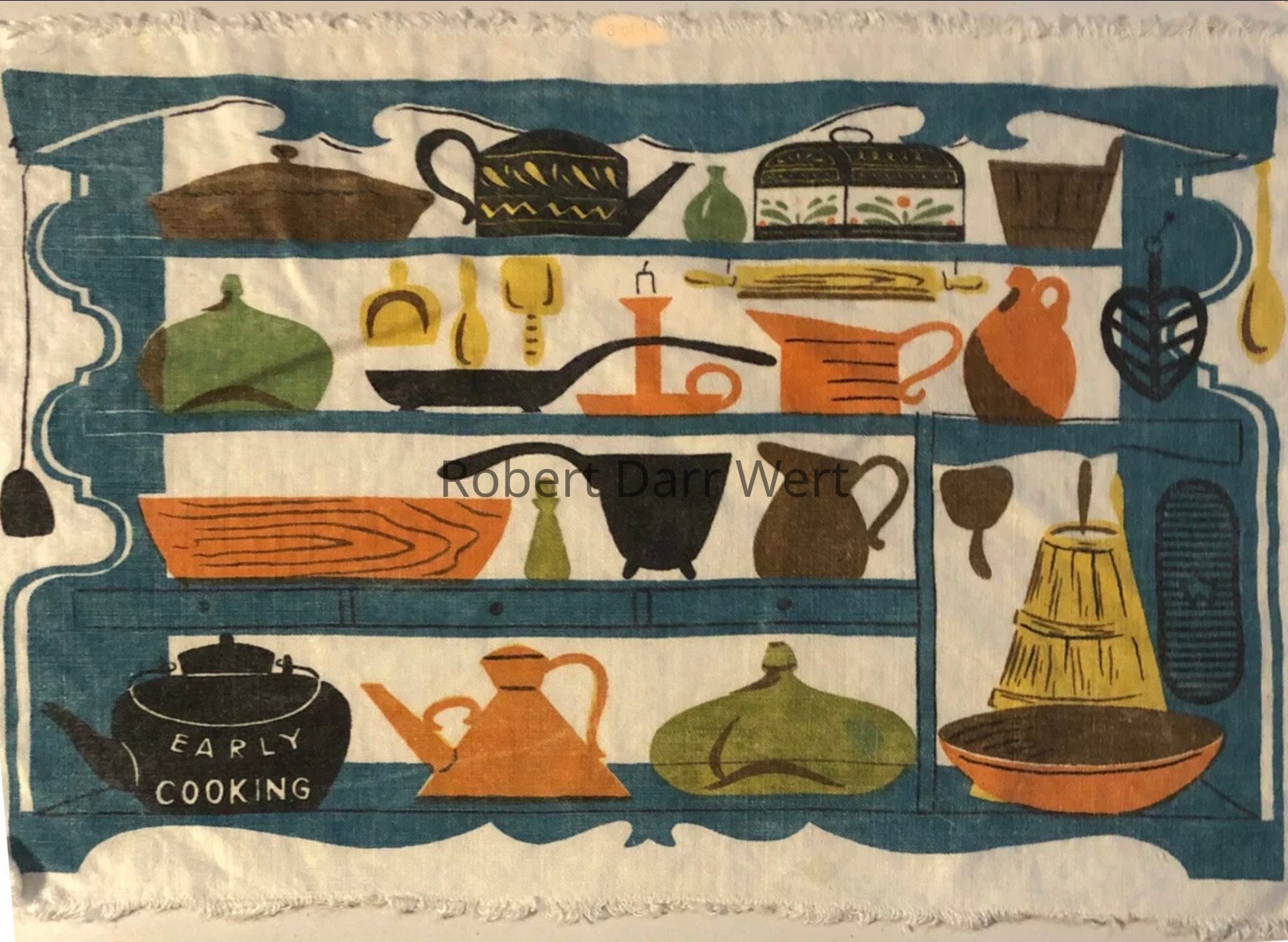 A six-color silkscreen print on off-white linen depicting an open hutch with shelves holding tools and cookware necessary to an early American kitchen. At lower left, a black tea kettle bears the title,“Early Cooking”. A matching napkin has not been documented.