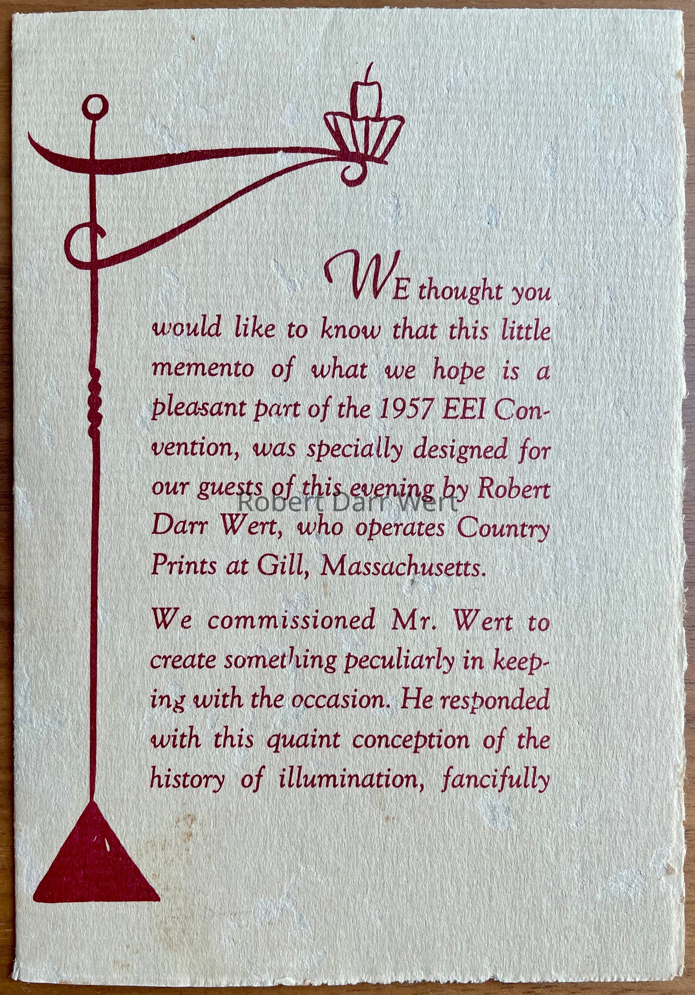 The pamphlet states, “ We commissioned Mr. Wert to create something precisely in keeping with the occasion. He responded with this quaint conception of the history of illumination, fancifully depicted by instruments thereof as they might be grouped in a replica of an early American Kitchen.” The pamphlet also indicates that the silkscreens for this commission were destroyed upon completion of the run and this design would never be commercially available .