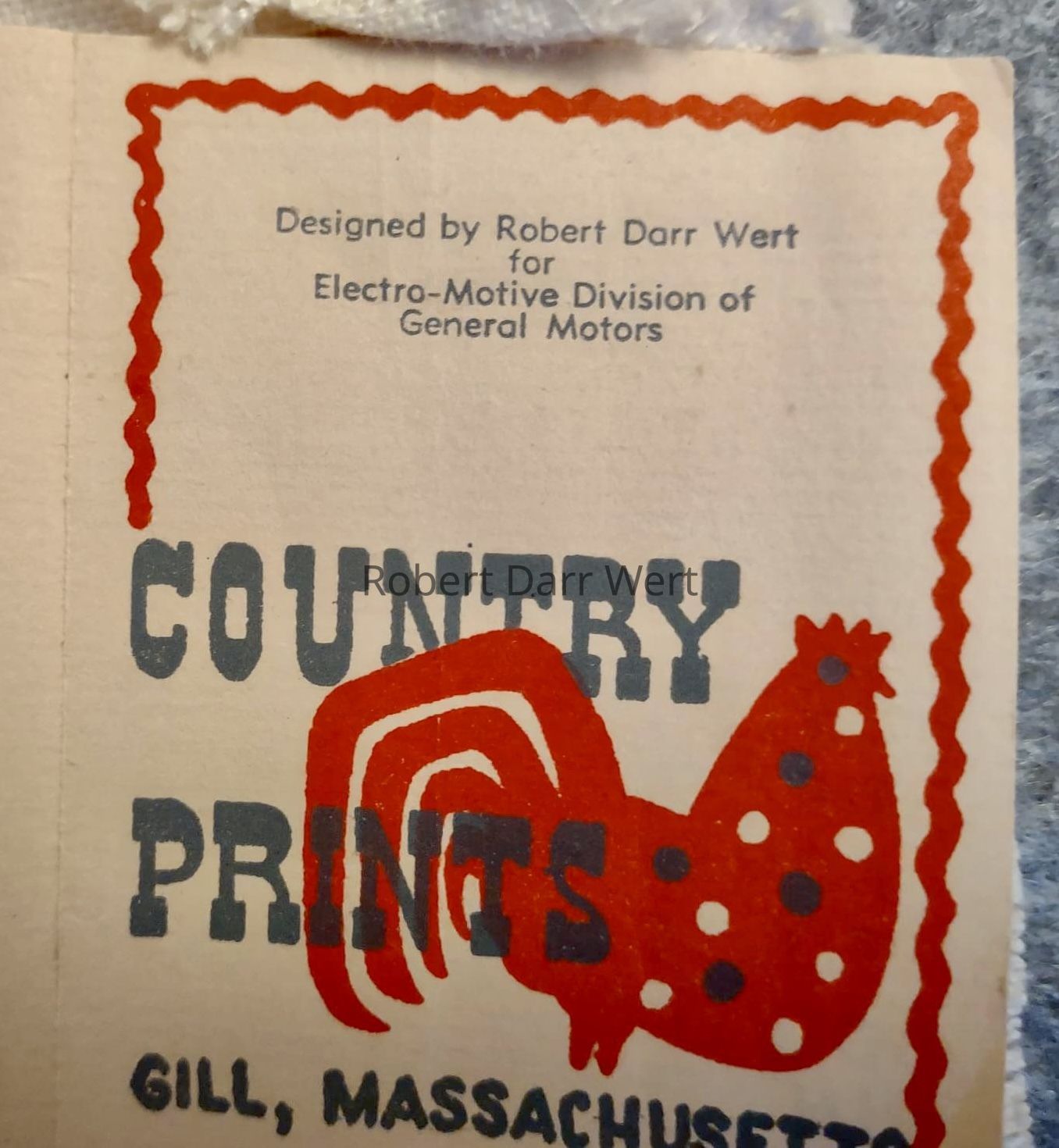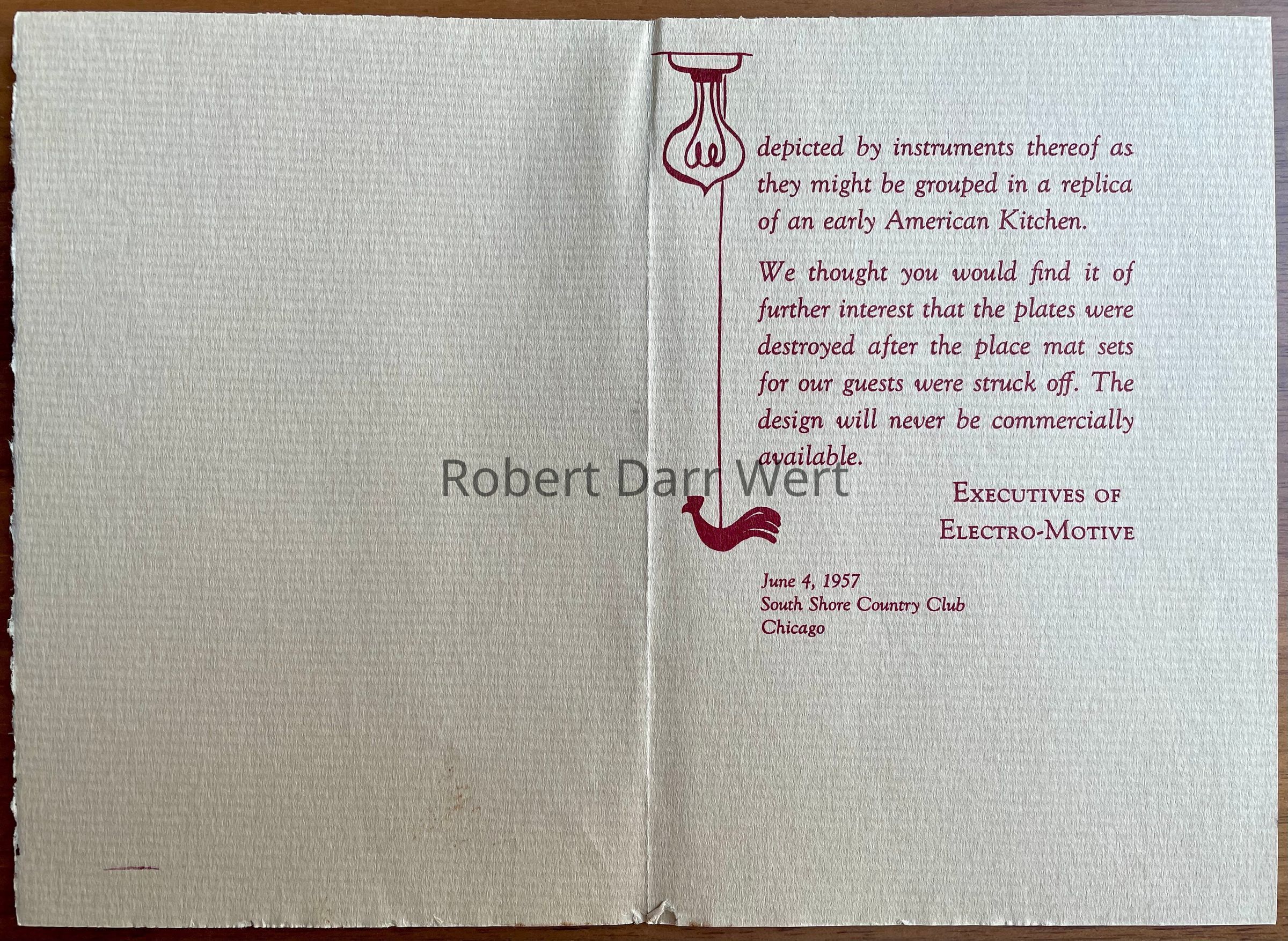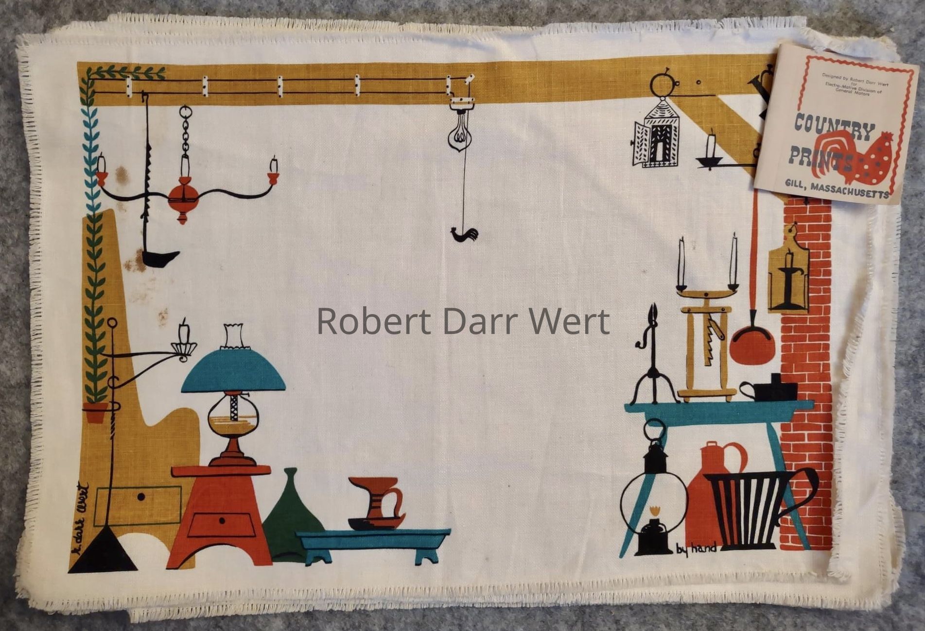 The Country Prints product tag states, “Designed by Robert Darr Wert for Electro-Motive Division of General Motors” (producer of electric locomotive train engines). These placemat sets were produced as gifts for an annual company convention and executive party. Wert produced at least three commissions for Electro-Motive’s annual meetings: two sets of placemats featuring early lighting fixtures and a set of three tiles illustrating Boston landmarks and their lighting fixtures produced in 1958.