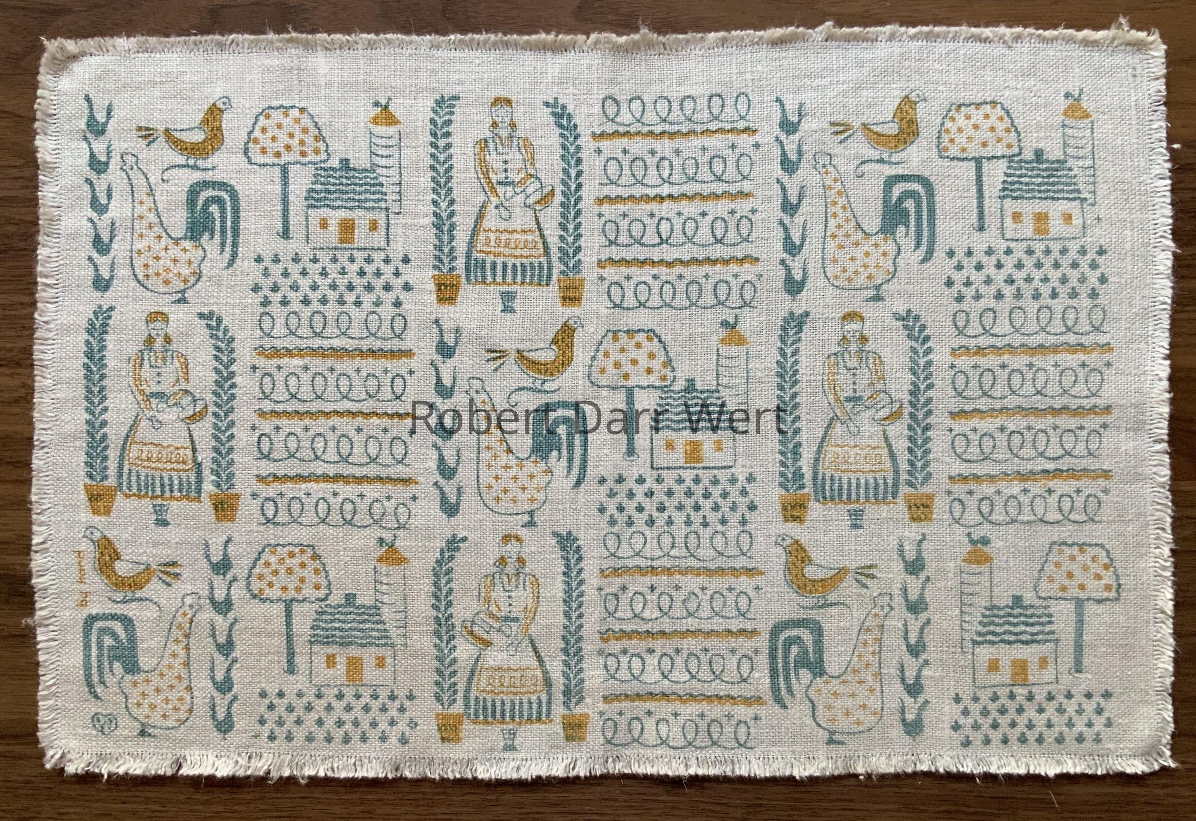 A placemat with a two-color silkscreen print on off-white linen depicting an overview of a farm, with images of a woman in eighteenth century dress flanked by tall potted plants, roosters, birds, a house, a silo with a weathervane, as well as scrolled lines and other marks in rows reminiscent of calico print fabrics. This design was offered in three colorways: aqua, rust, or chartreuse. A matching napkin has not been documented.
