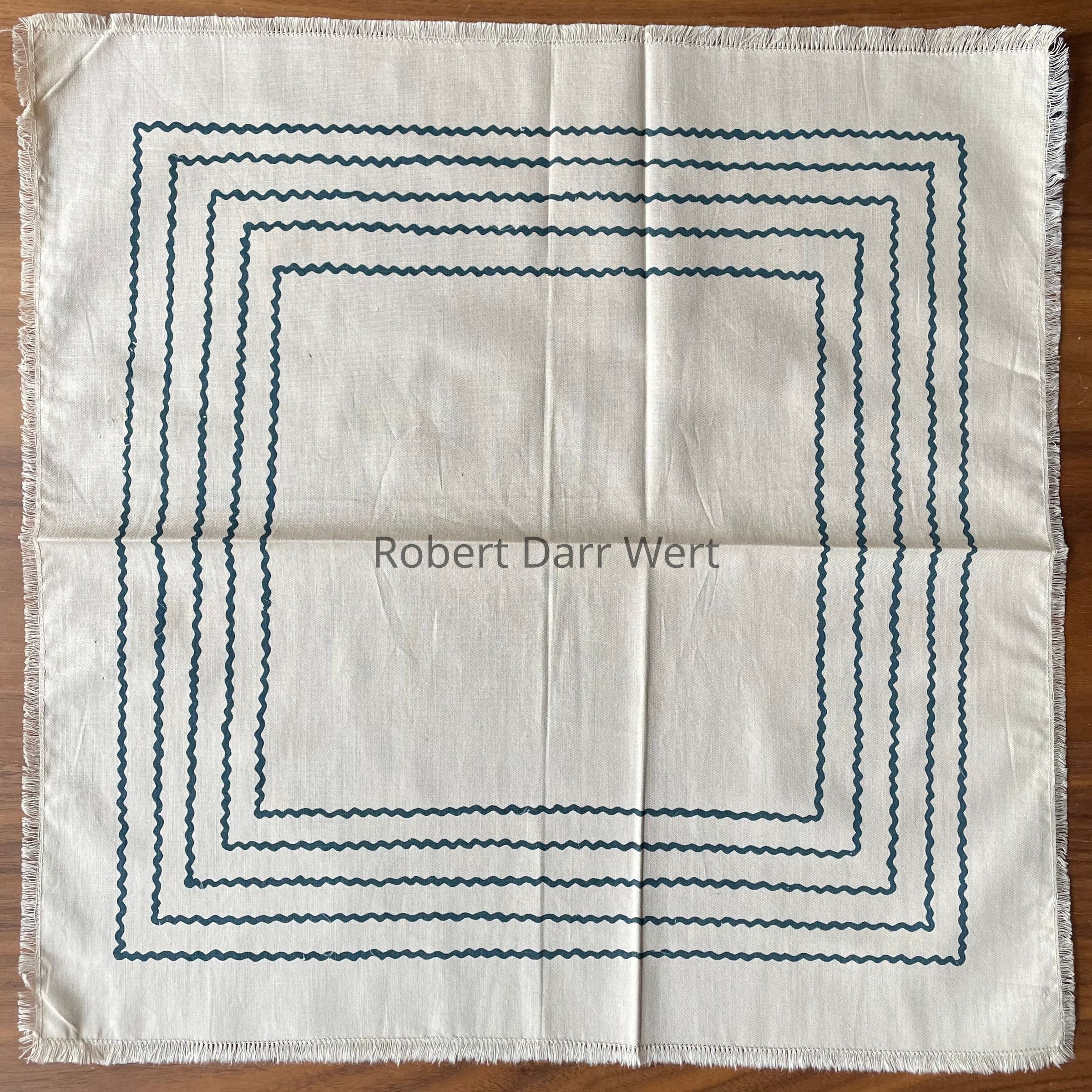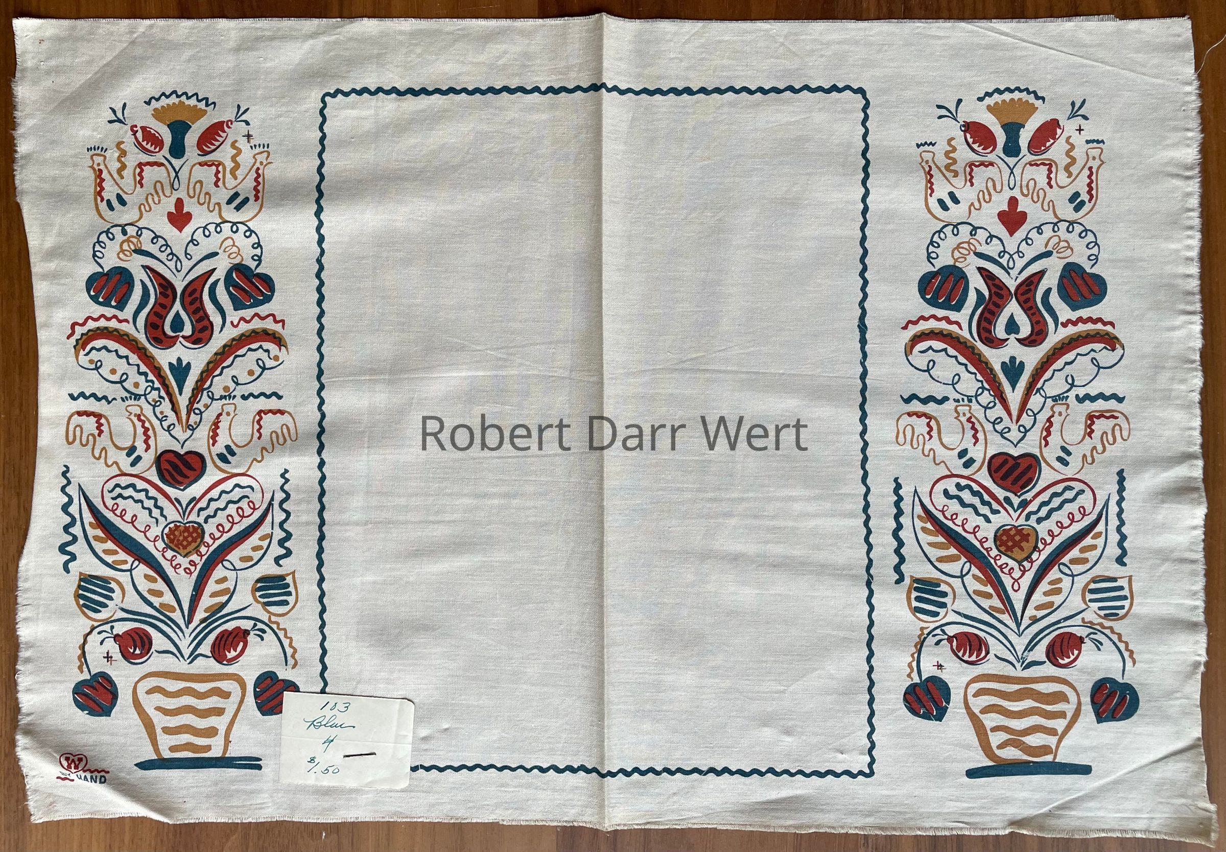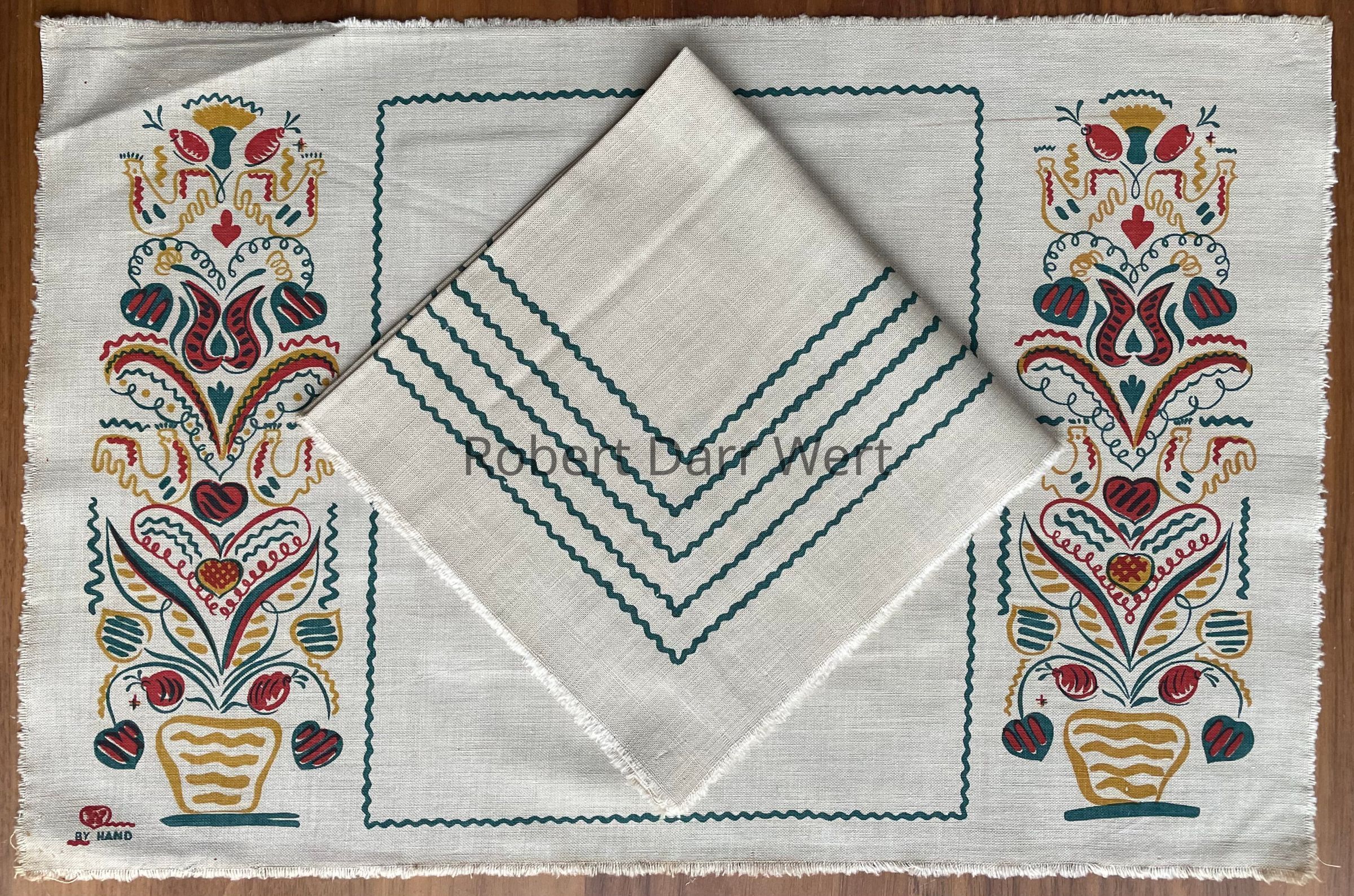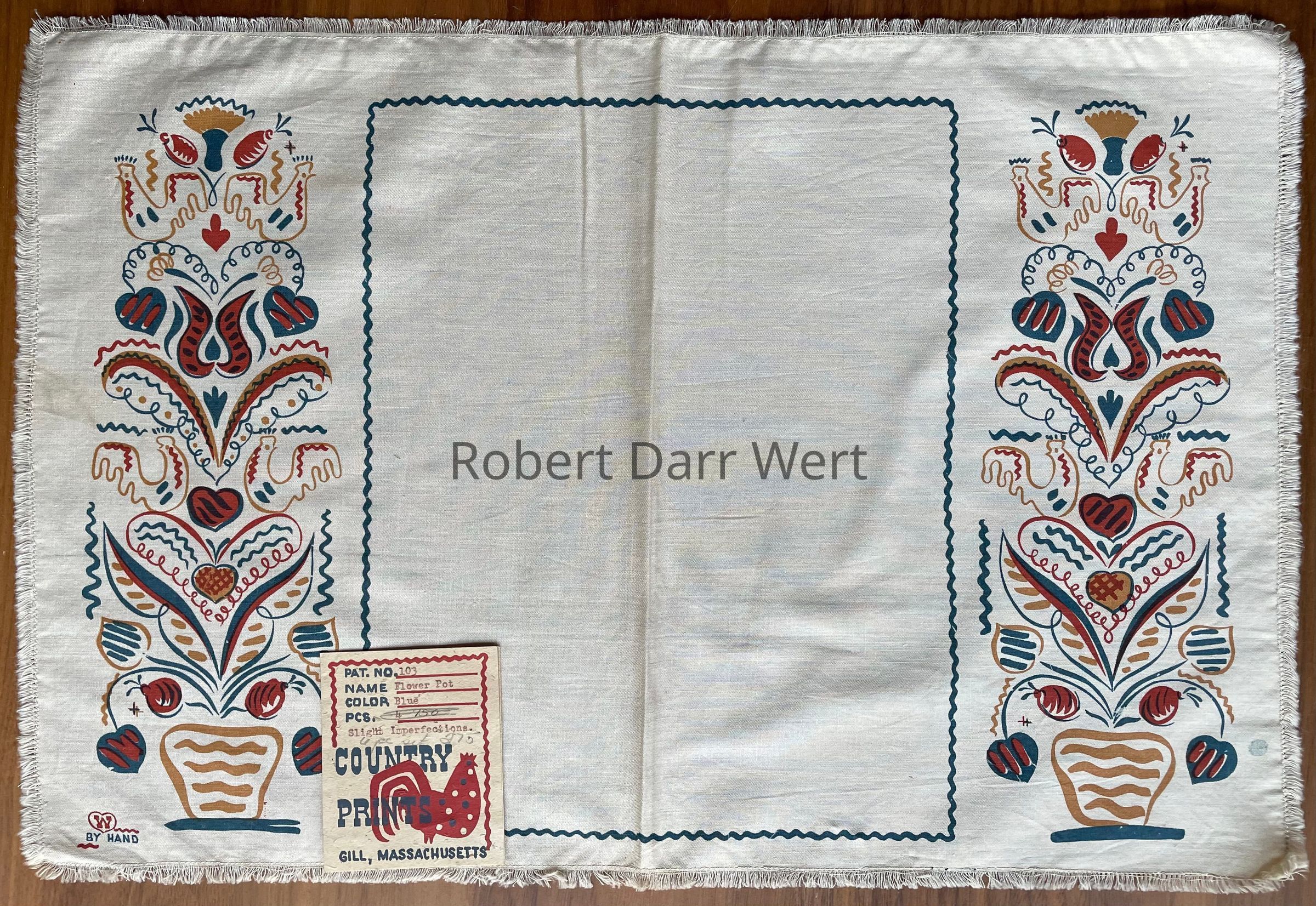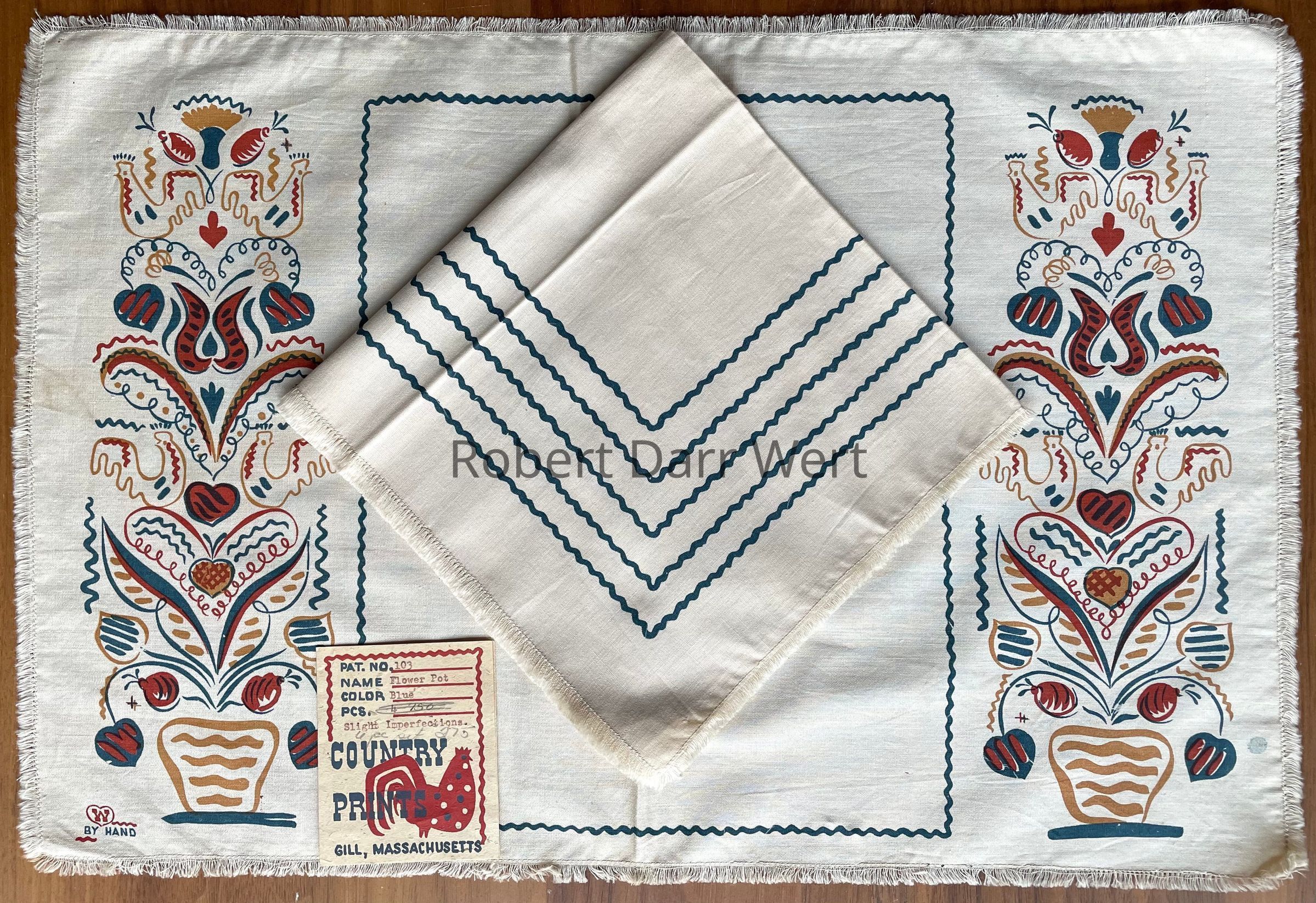 A three-color silkscreen printed placemat on off-white cotton crash with a one-color print on a matching square napkin. Placemat imagery depicts tall flowering potted plants rendered in Wert’s interpretation of Pennsylvania “Dutch” folk art. The potted plants flank a rectangular field bordered with a wavy rickrack style line. The napkin print is a series of five nested square borders.