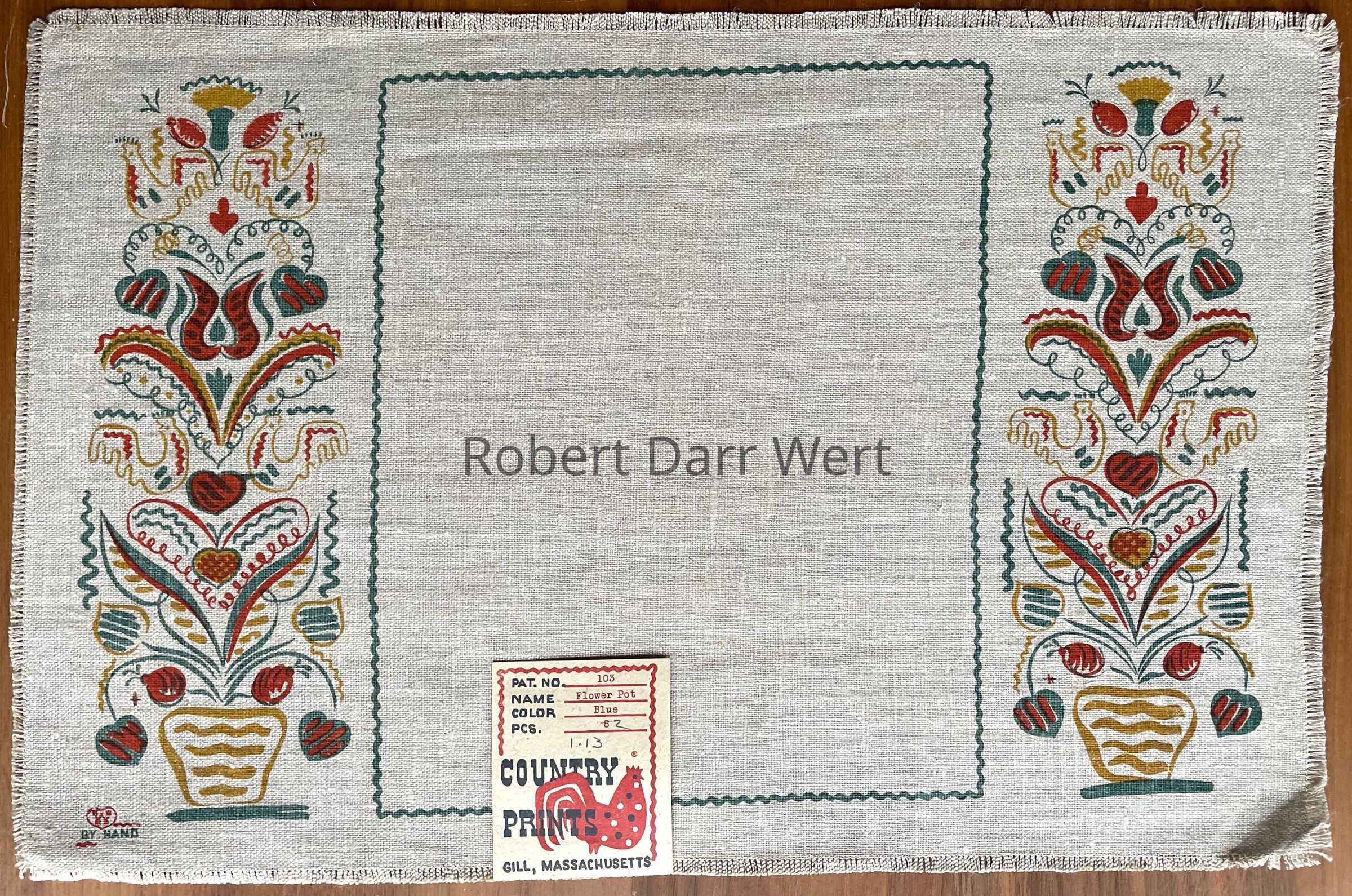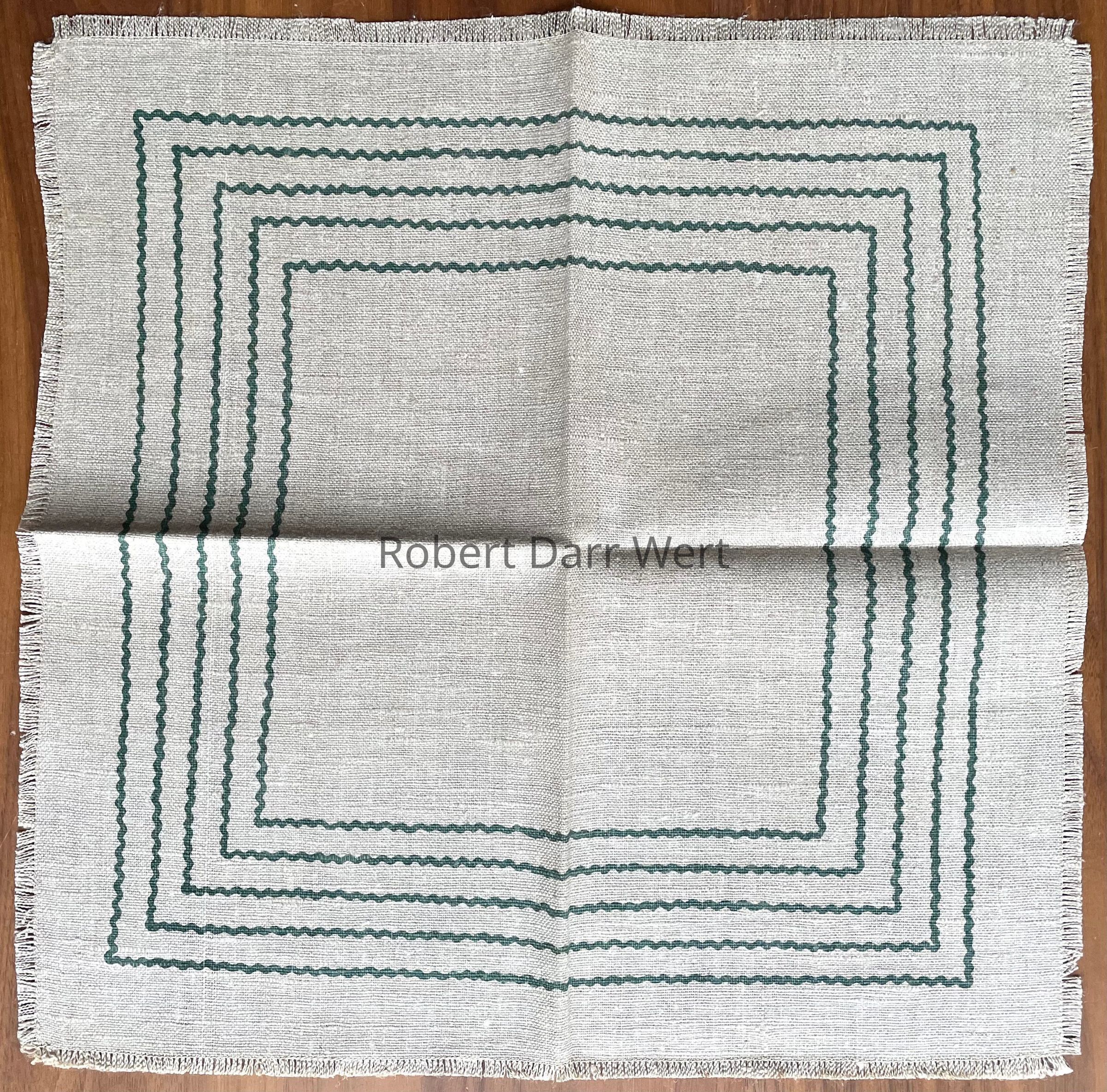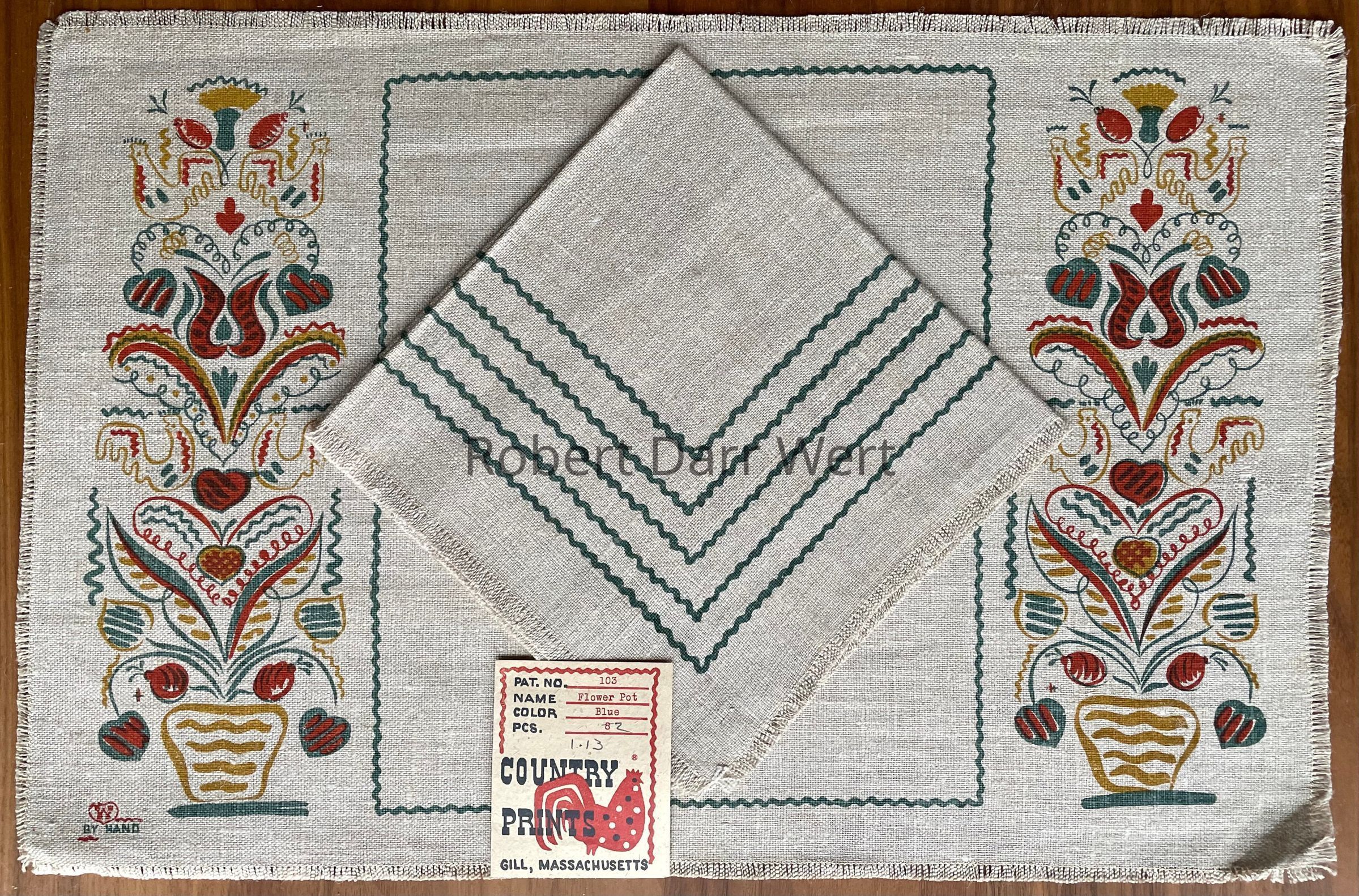 A three-color silkscreen printed placemat on natural linen with a one-color print on a matching square napkin. Placemat imagery depicts tall flowering potted plants rendered in Wert’s interpretation of Pennsylvania “Dutch” folk art. The potted plants flank a rectangular field bordered with a wavy rickrack style line. The napkin print is a series of five nested square borders.