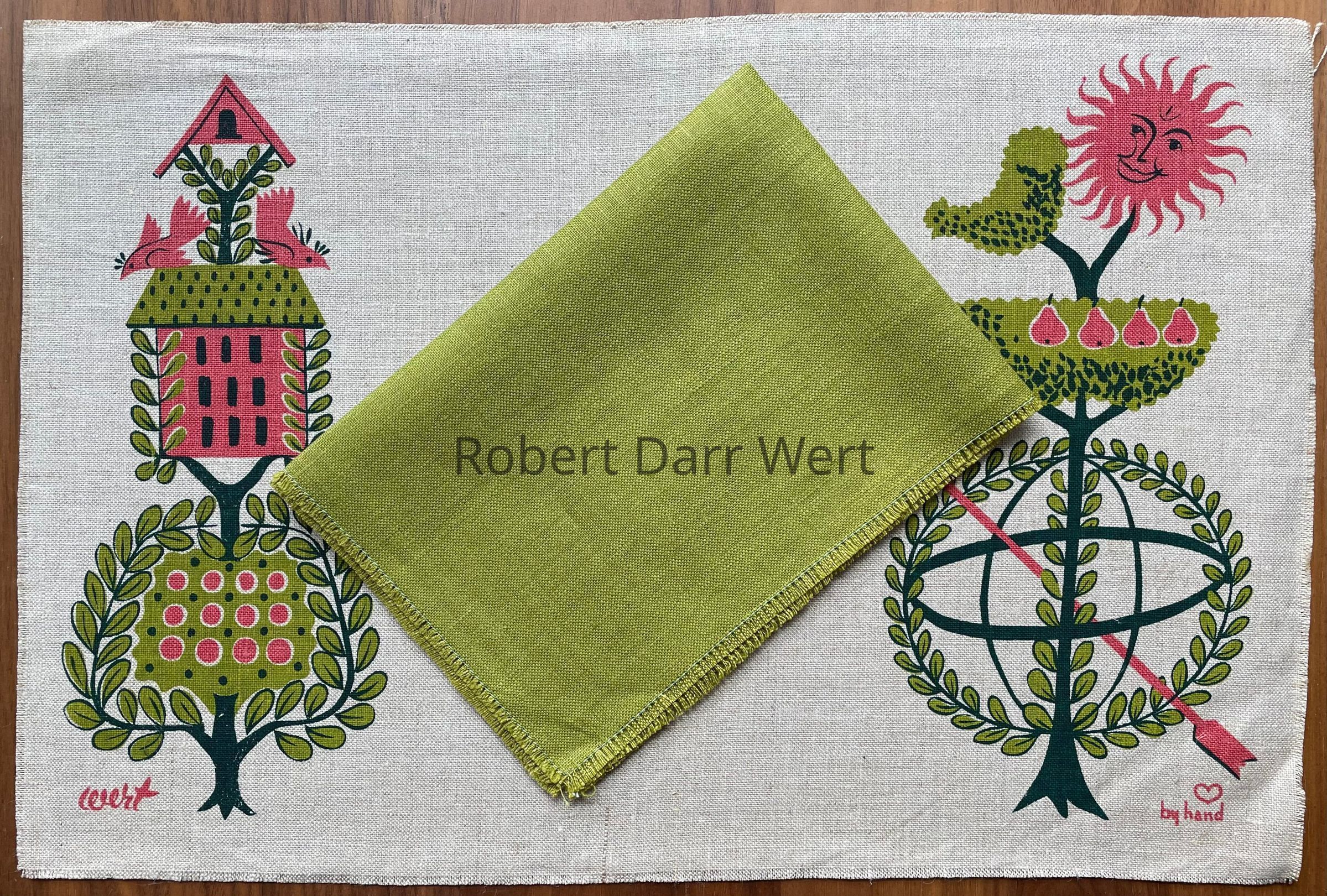 This placemat is described on the Spring 1958 Country Prints price list, “141 Garden Whimsey — Espaliered tree design — Pink & Turquoise on White — Green on Tan.”