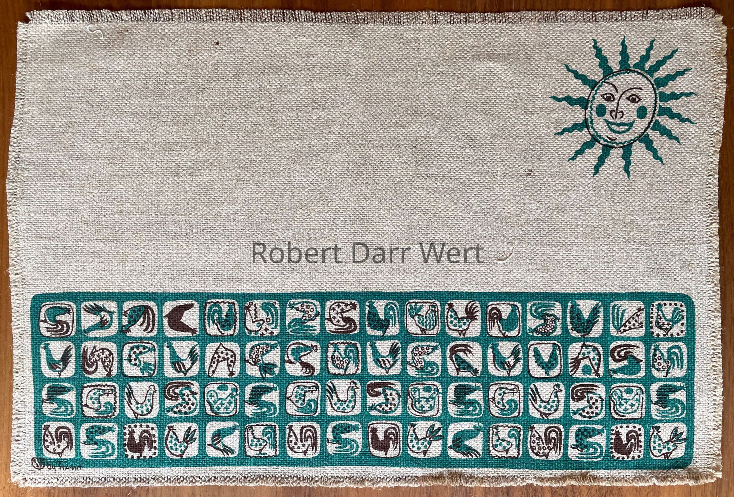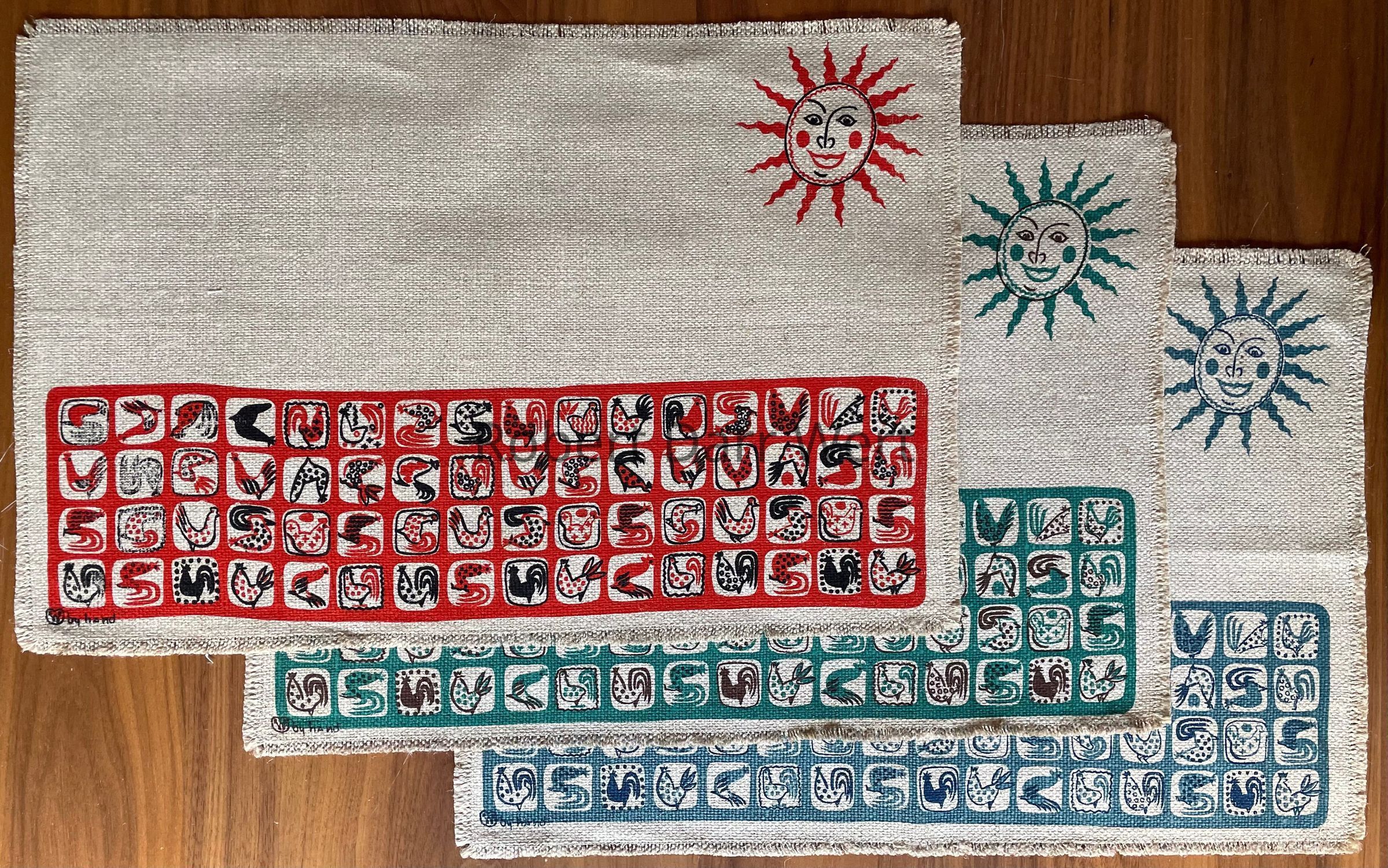 This placemat set appears on the c.1951 Country Prints packing slip, and is described in a c.1955 Country Prints price list, “Gay roosters in the rising sun — 64 of them on the napkin! Textured natural oatmeal linen — Red, Green or Blue”.