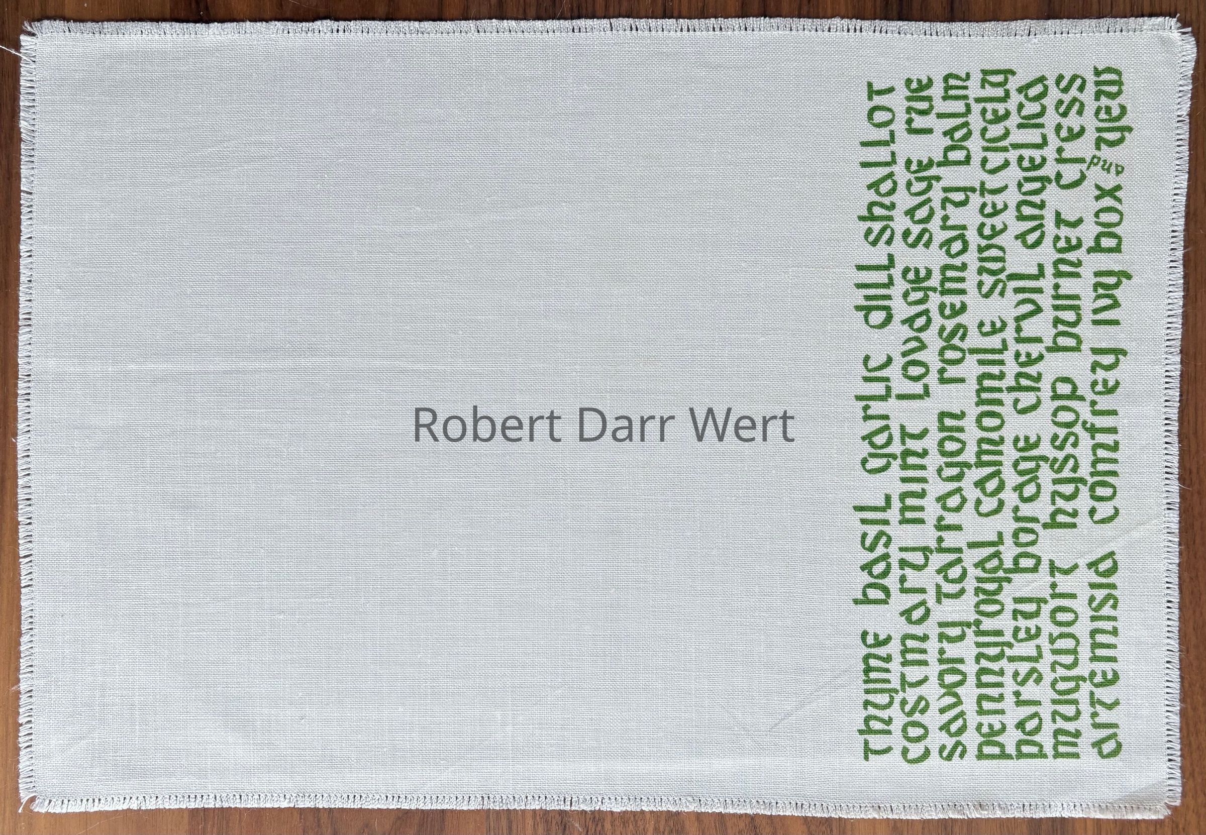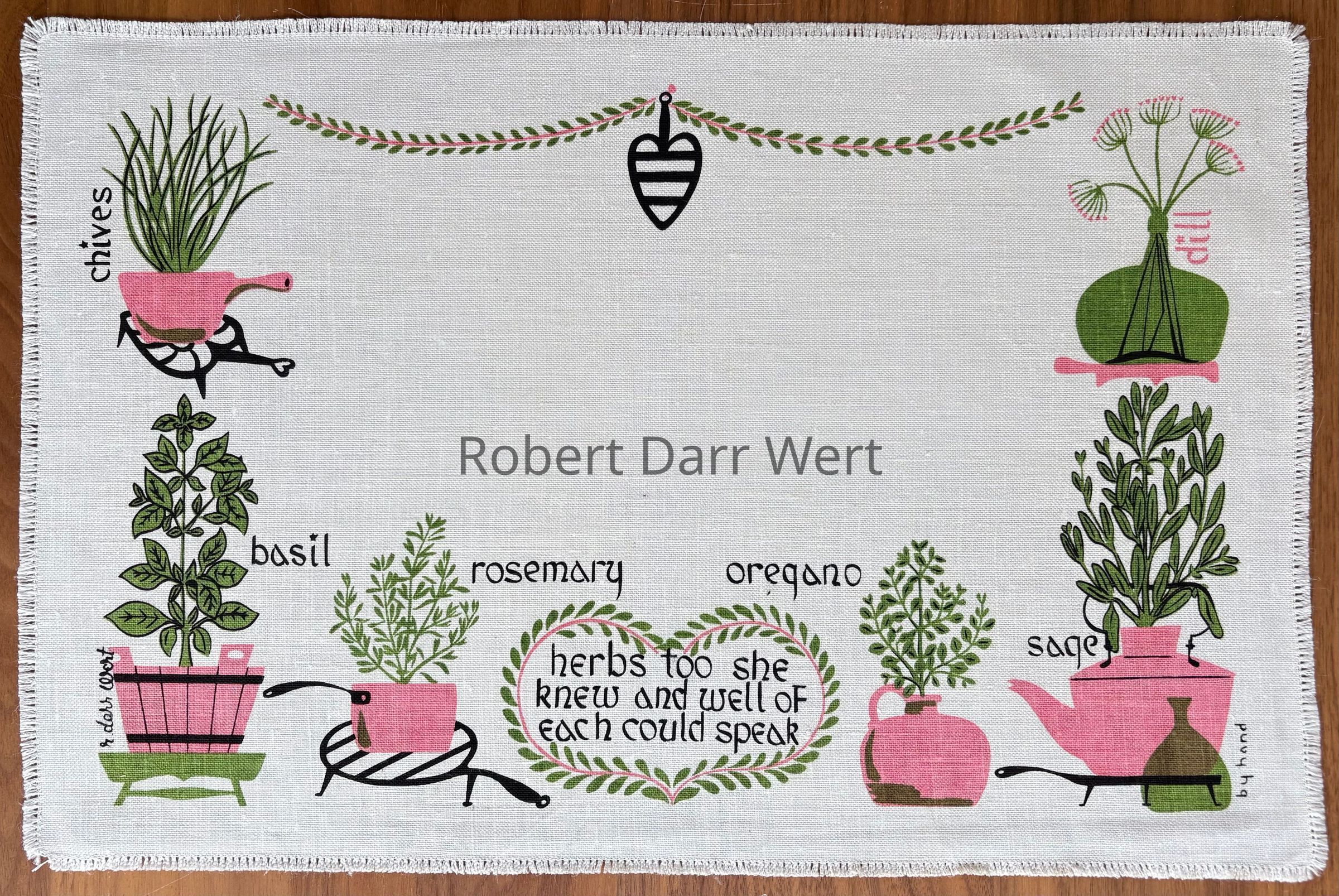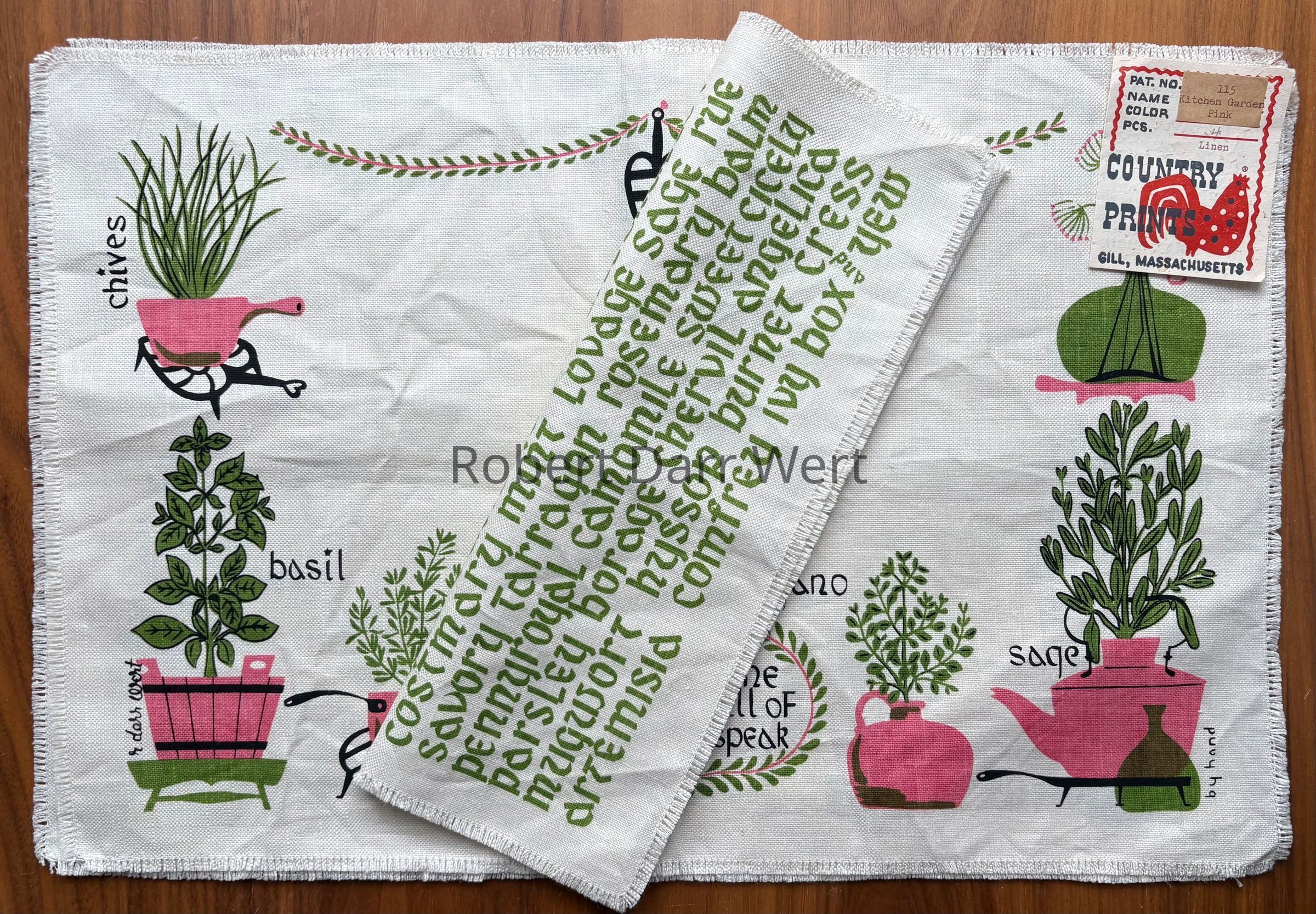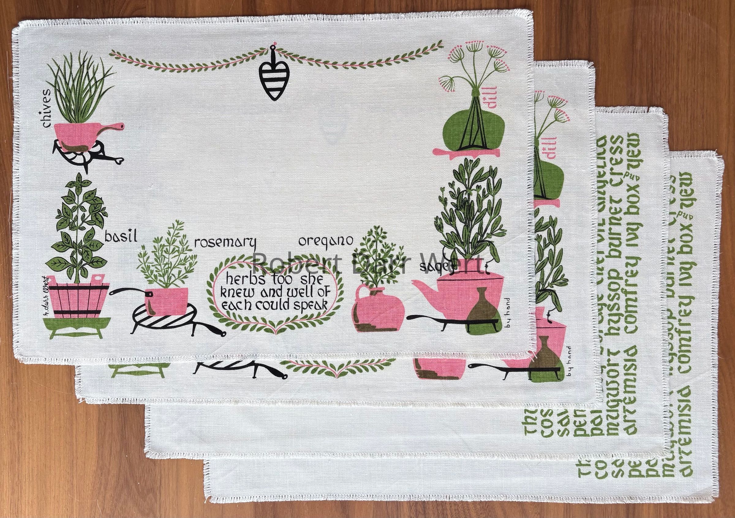 A placemat with a three-color silkscreen print on off-white linen depicting herb plants placed in vessels of copper, wood, ceramic and glass with the corresponding herb names. The matching napkin has a one-color silkscreen print with multiple herb names in calligraphy. This set was produced in at least two colorways: brown and pink. This example is in pink.