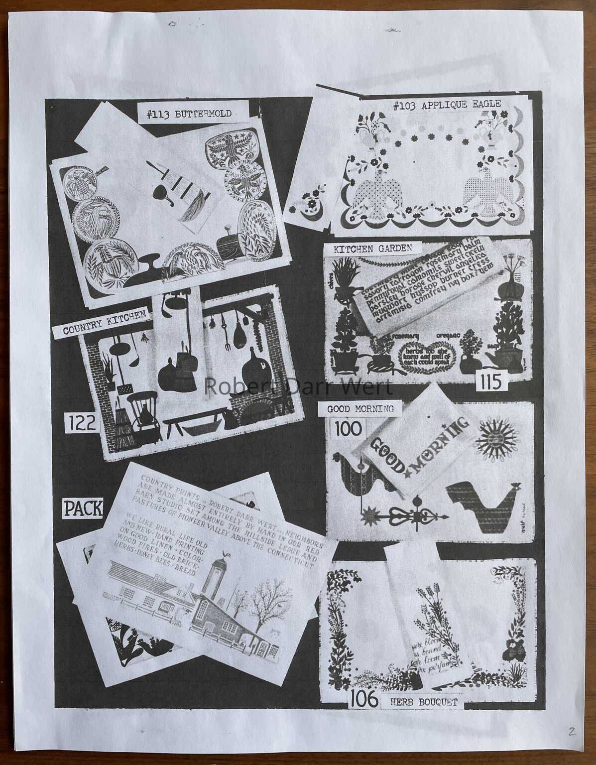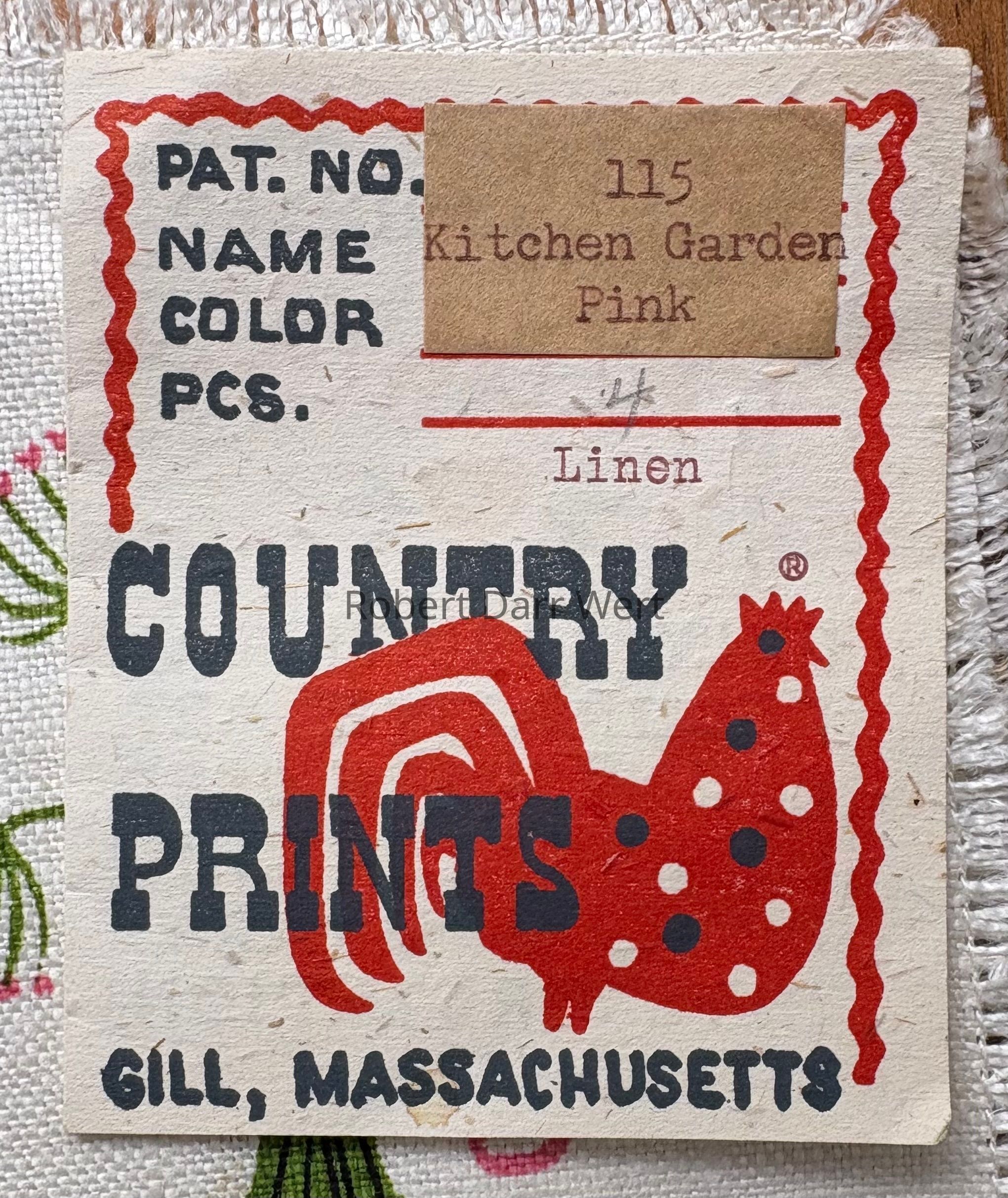 This placemat set is listed in the January 1960 Country Prints price list in two colorways (pink or brown), and appears in the c.1960 brochure “Mat Sets by Robert Darr Wert/Country Prints”, c.1960; see images.Made/Created